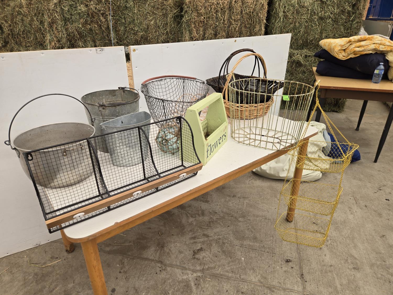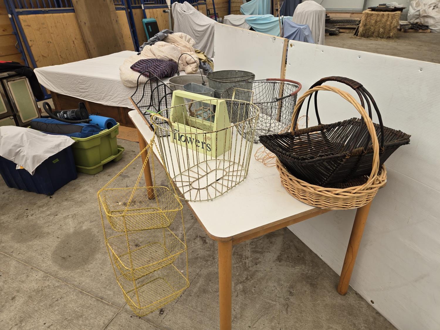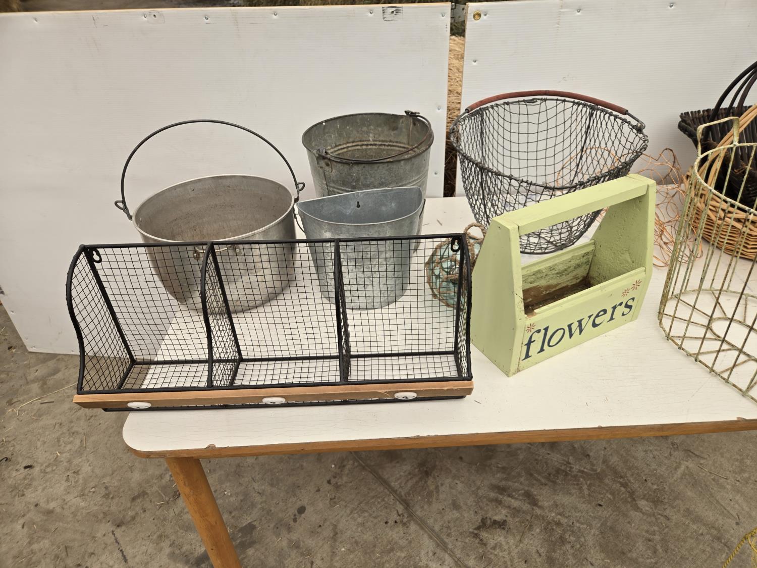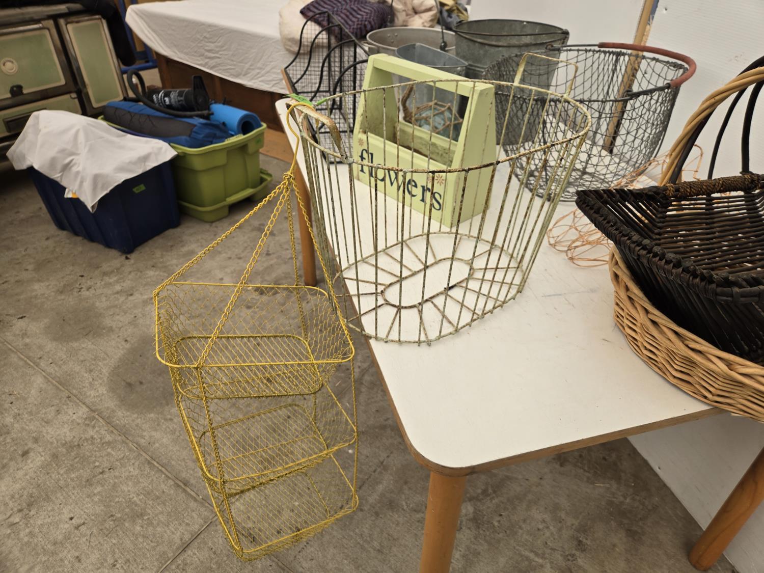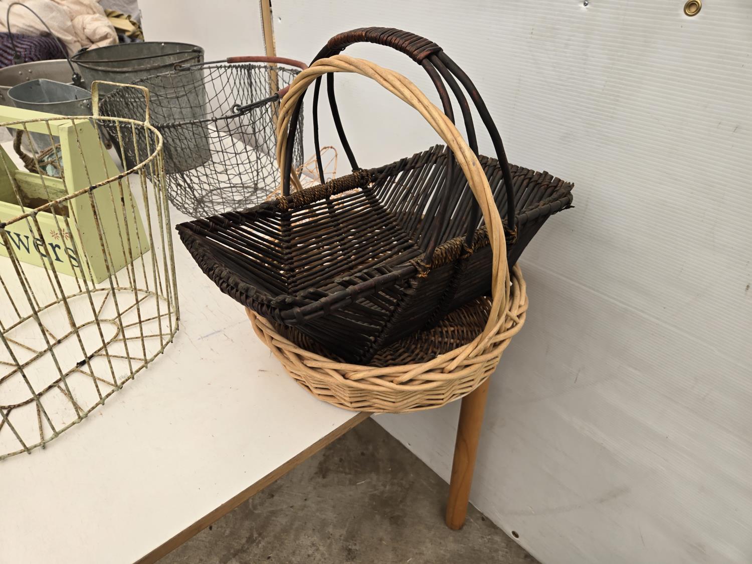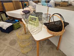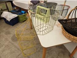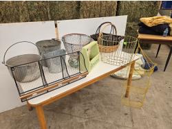 120 Wire Baskets, Pails, (2) Wicker Baskets, Wooden Tool Box