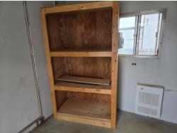 plywood shelf unit, wood desk, chair, bundle of fiberglass insulation