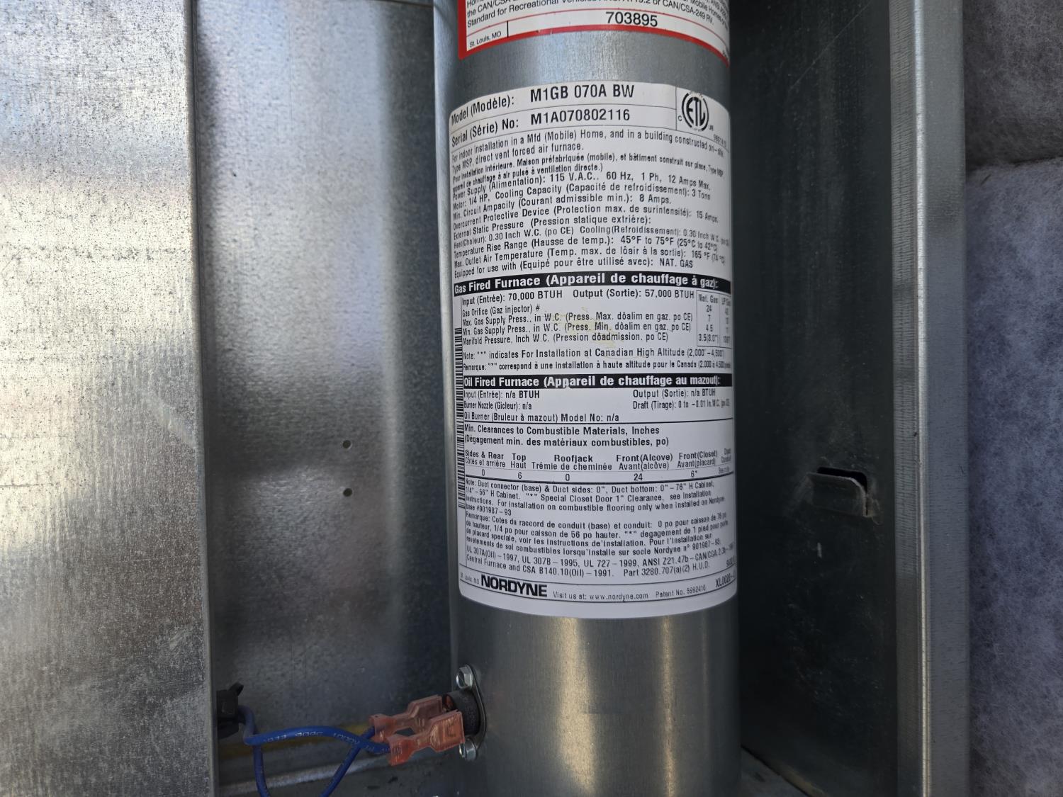 40 amp electrical service, single phase, 70,0000 BTU furnace, #1