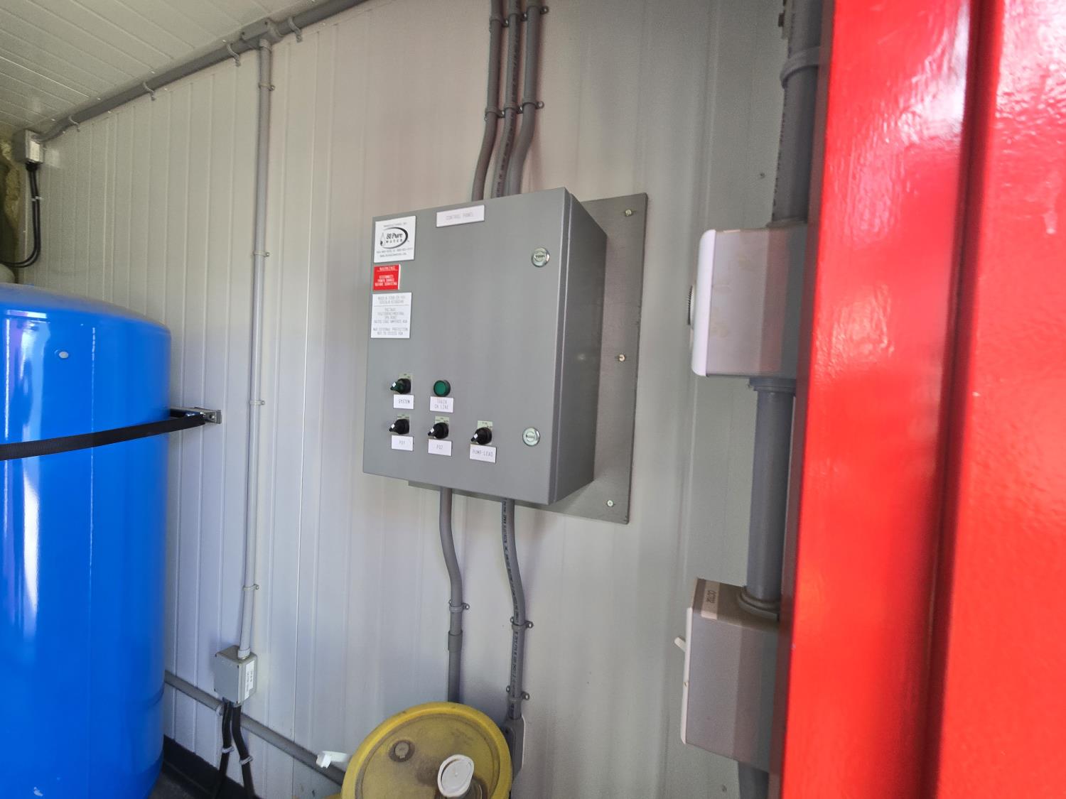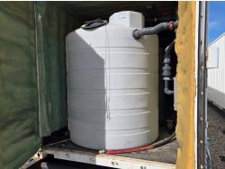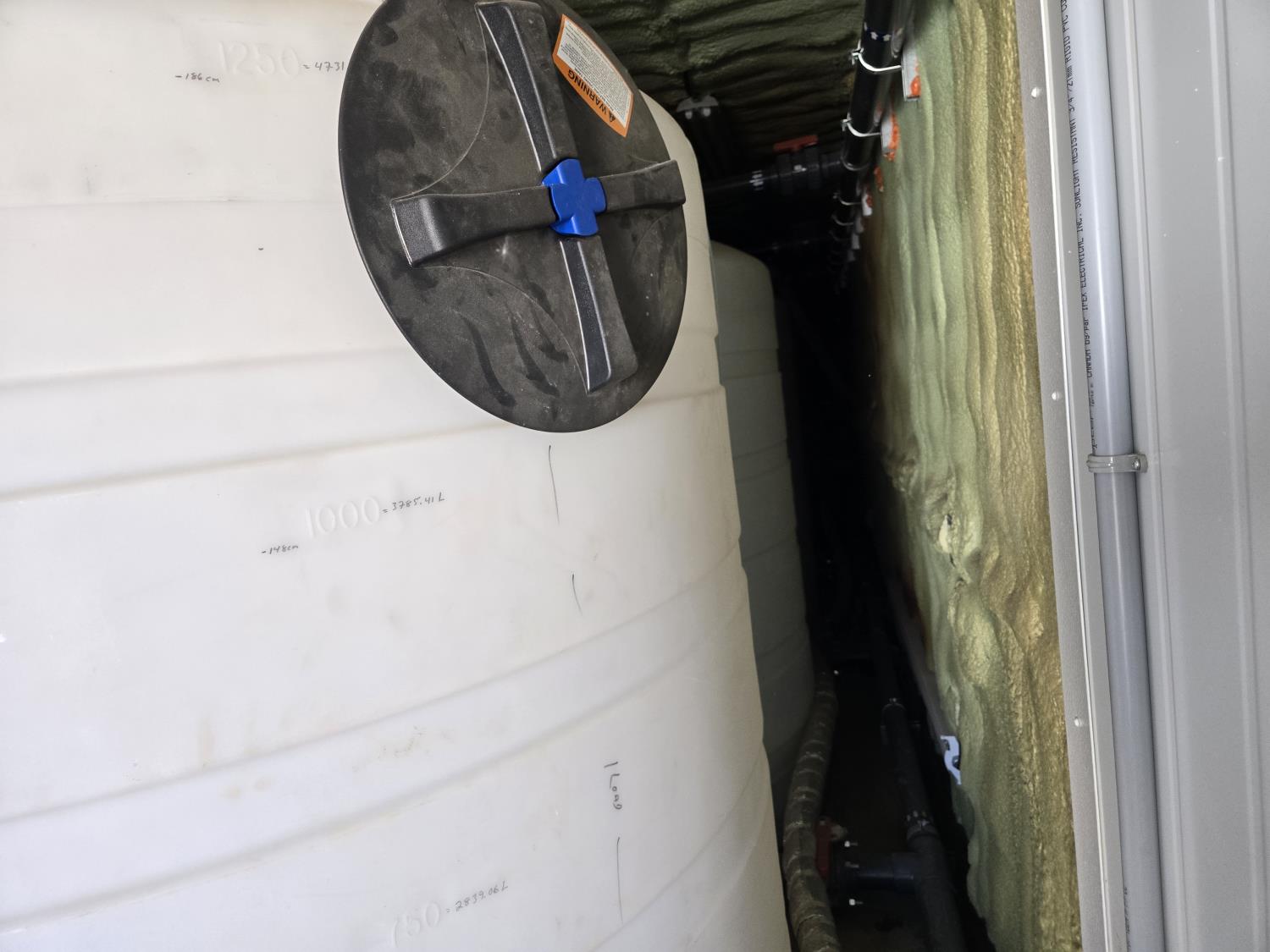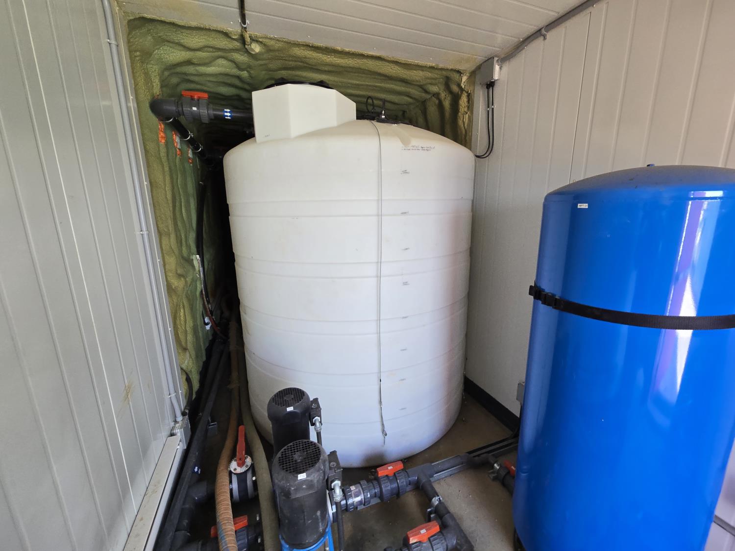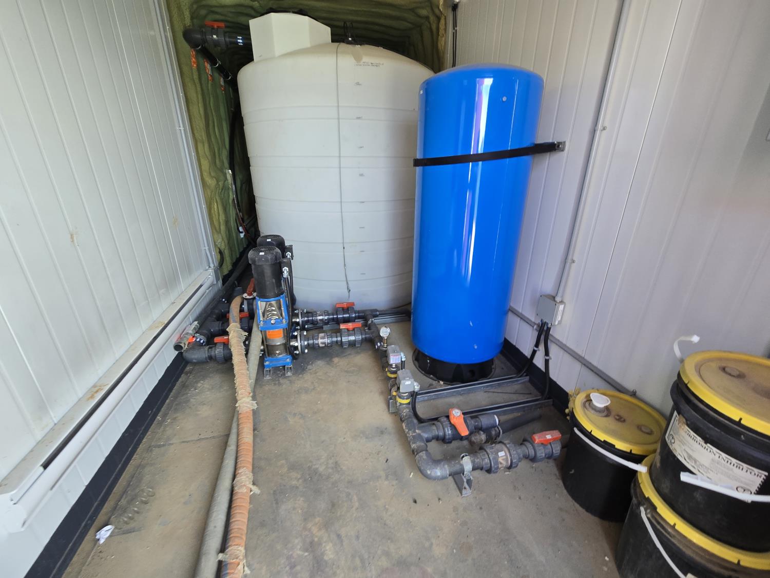 8 ft wide, 9 ft 6 inch high, (5) 4800 Liter poly water tanks, wired with electrical panel, Well Mate pressure tank, (2) pumps