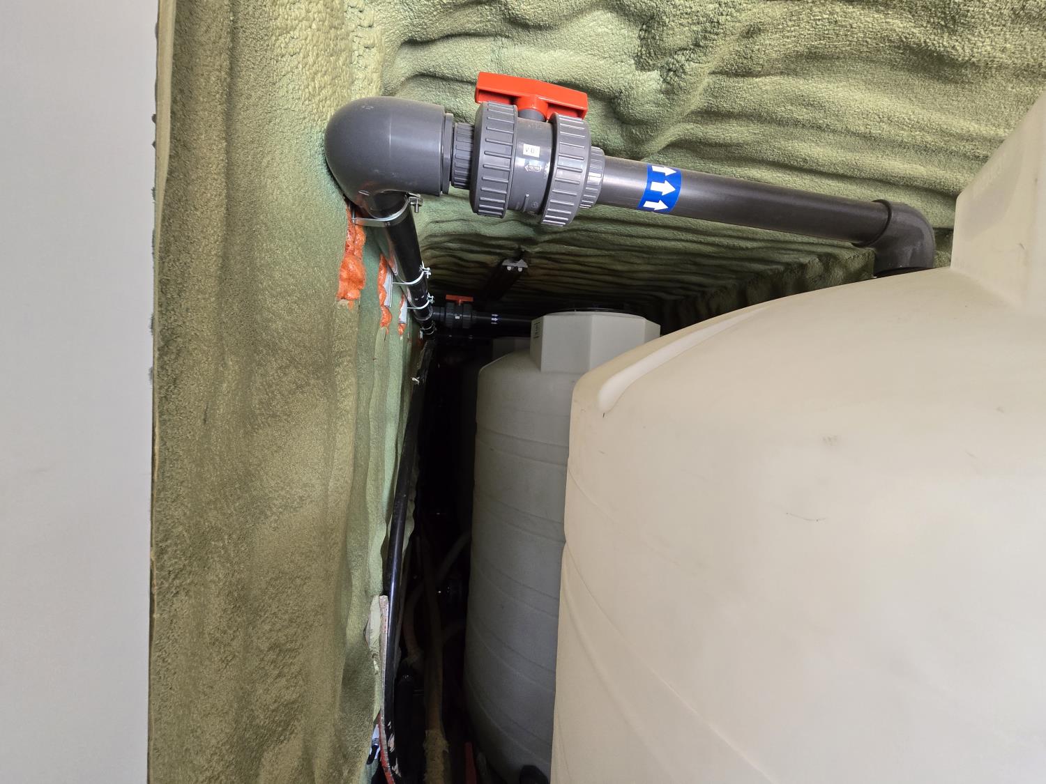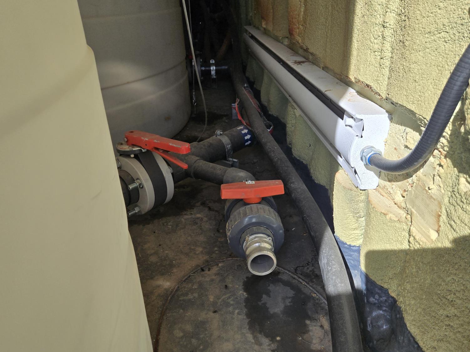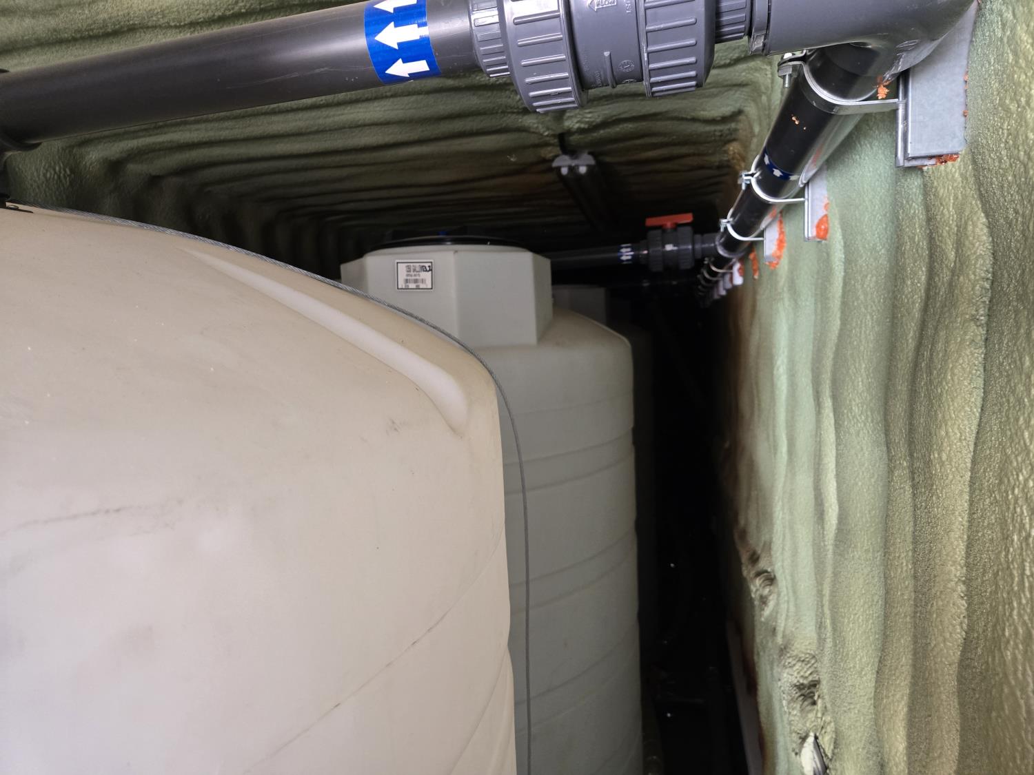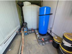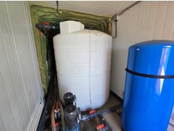 8 ft wide, 9 ft 6 inch high, (5) 4800 Liter poly water tanks, wired with electrical panel, Well Mate pressure tank, (2) pumps