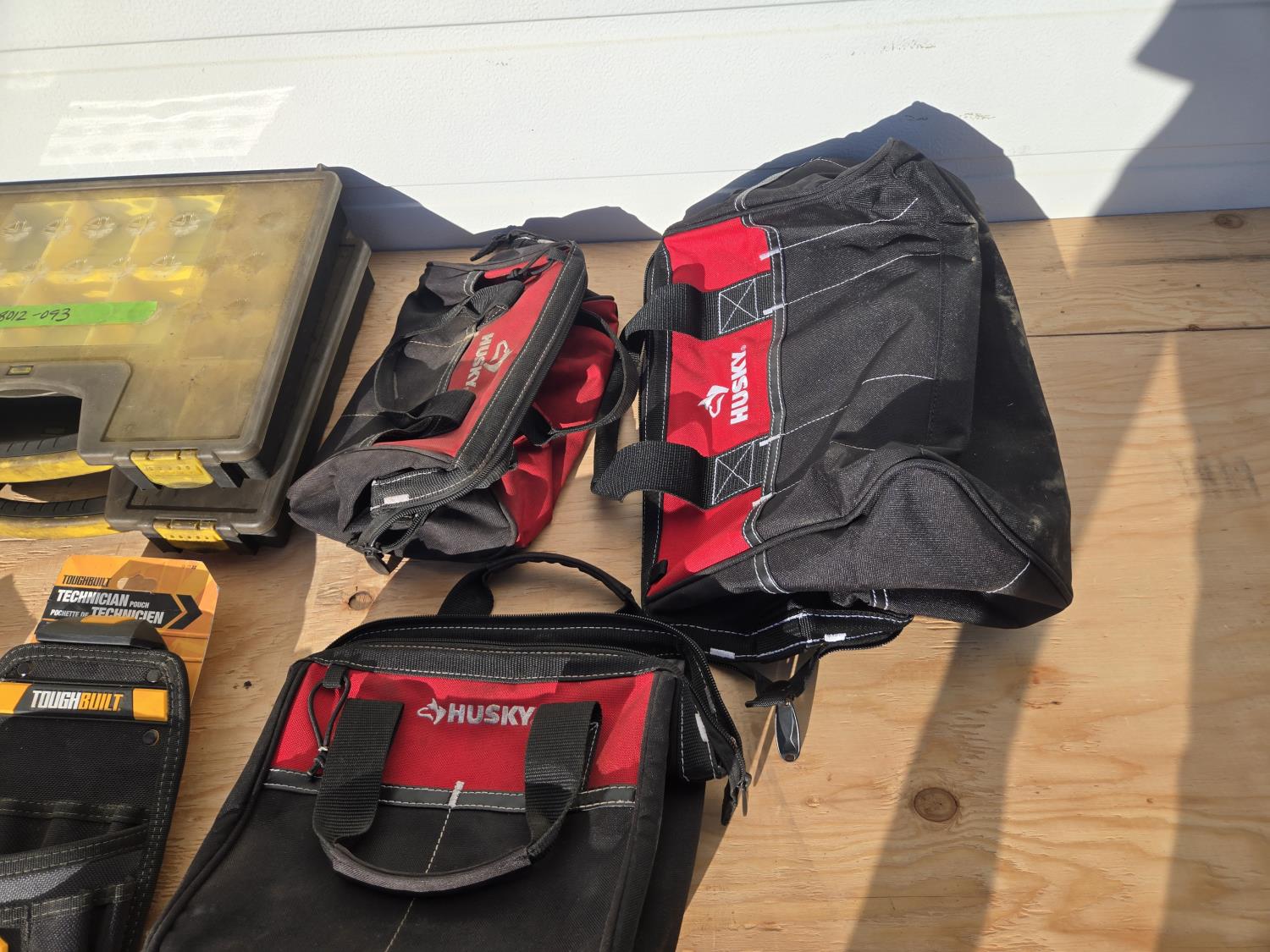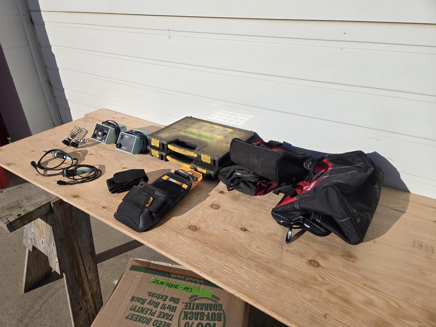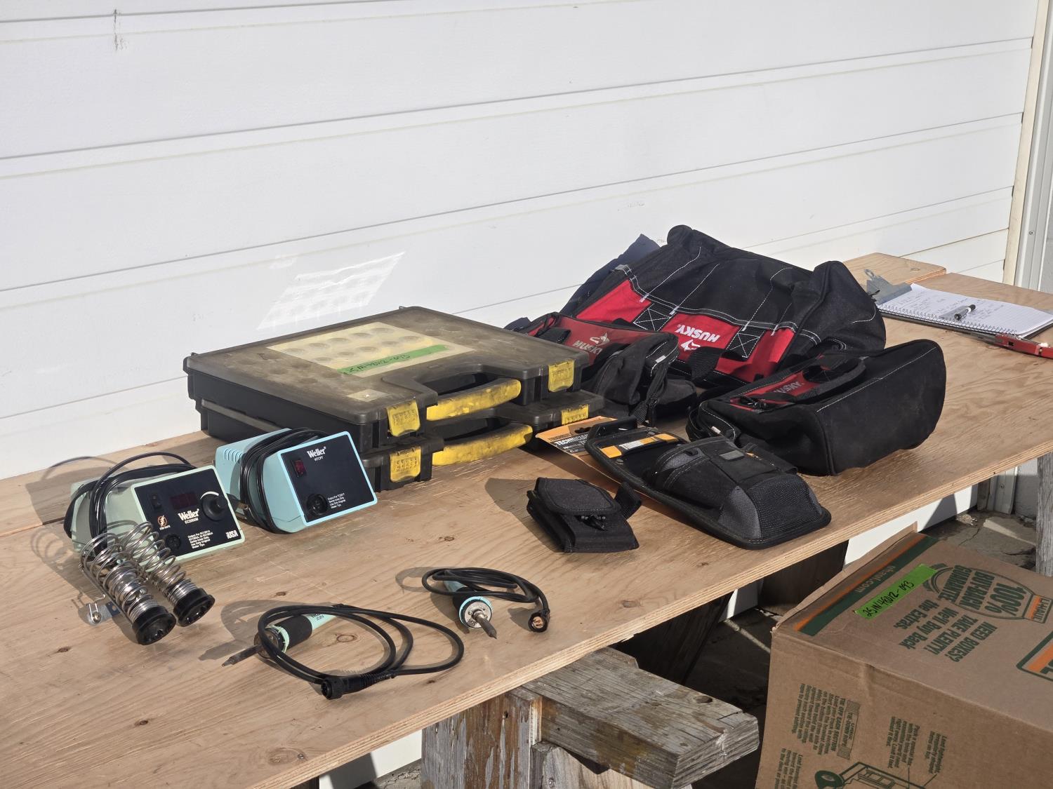 5633 (2) Weller Soldering Irons, (3) Husky Tool Bags, (2) Stanley Parts Trays