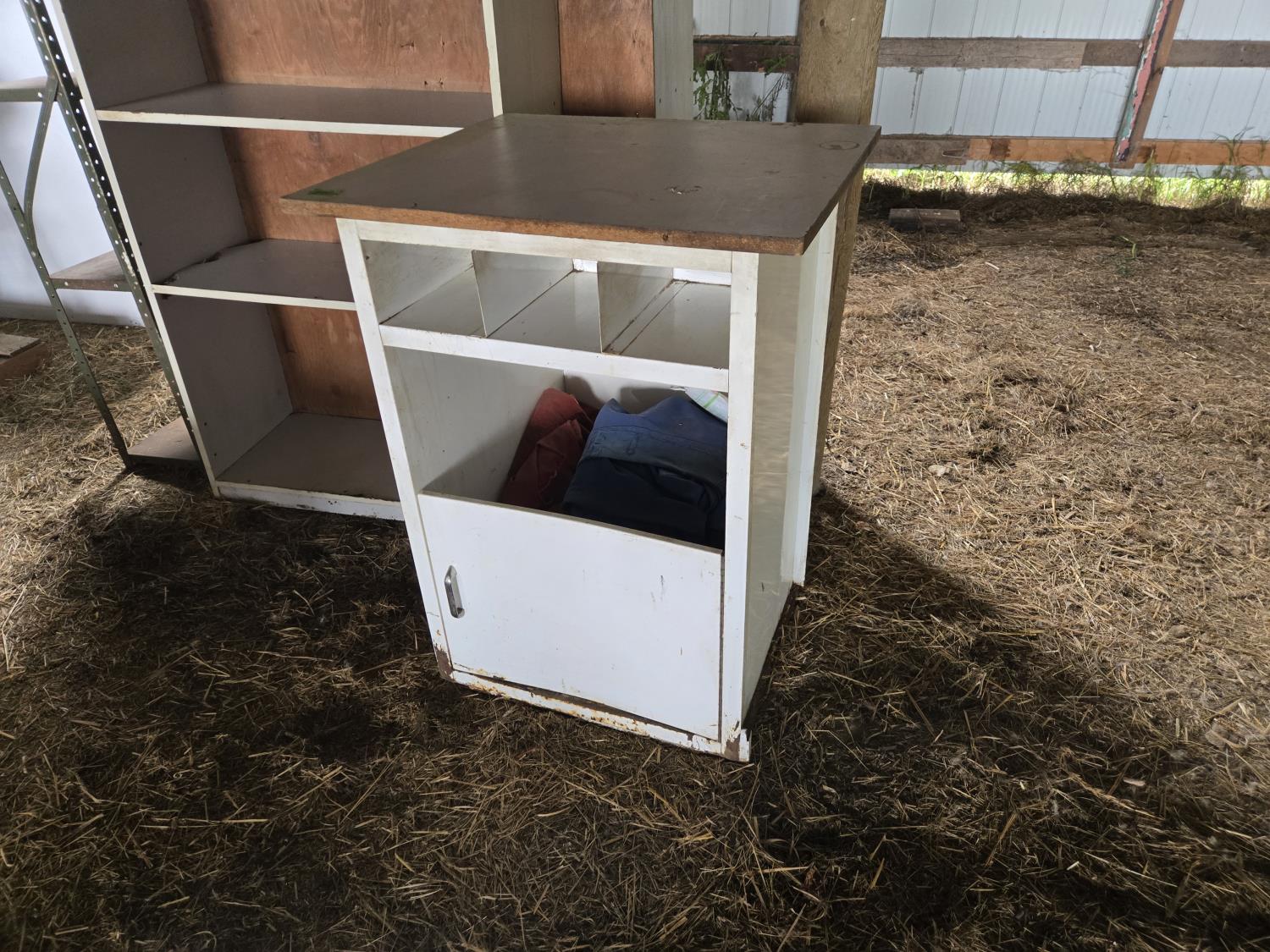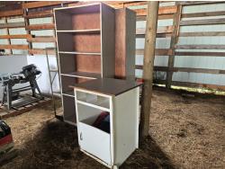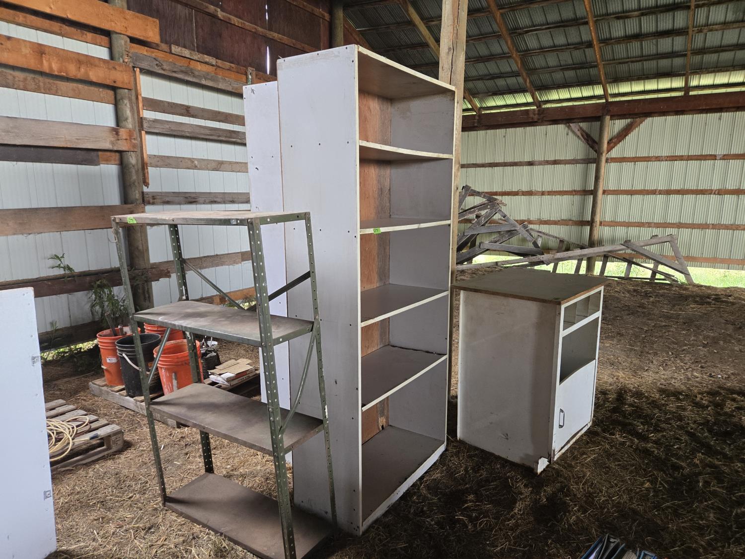 (1) metal shelf 12 inch deep X 36 inch wide X 58 inch high, (2) Wood shelf units, 16 inch deep X 37.5 inch wide X 84 inch high, (1) cabinet 24 inch X 24 inch X 41 inch high