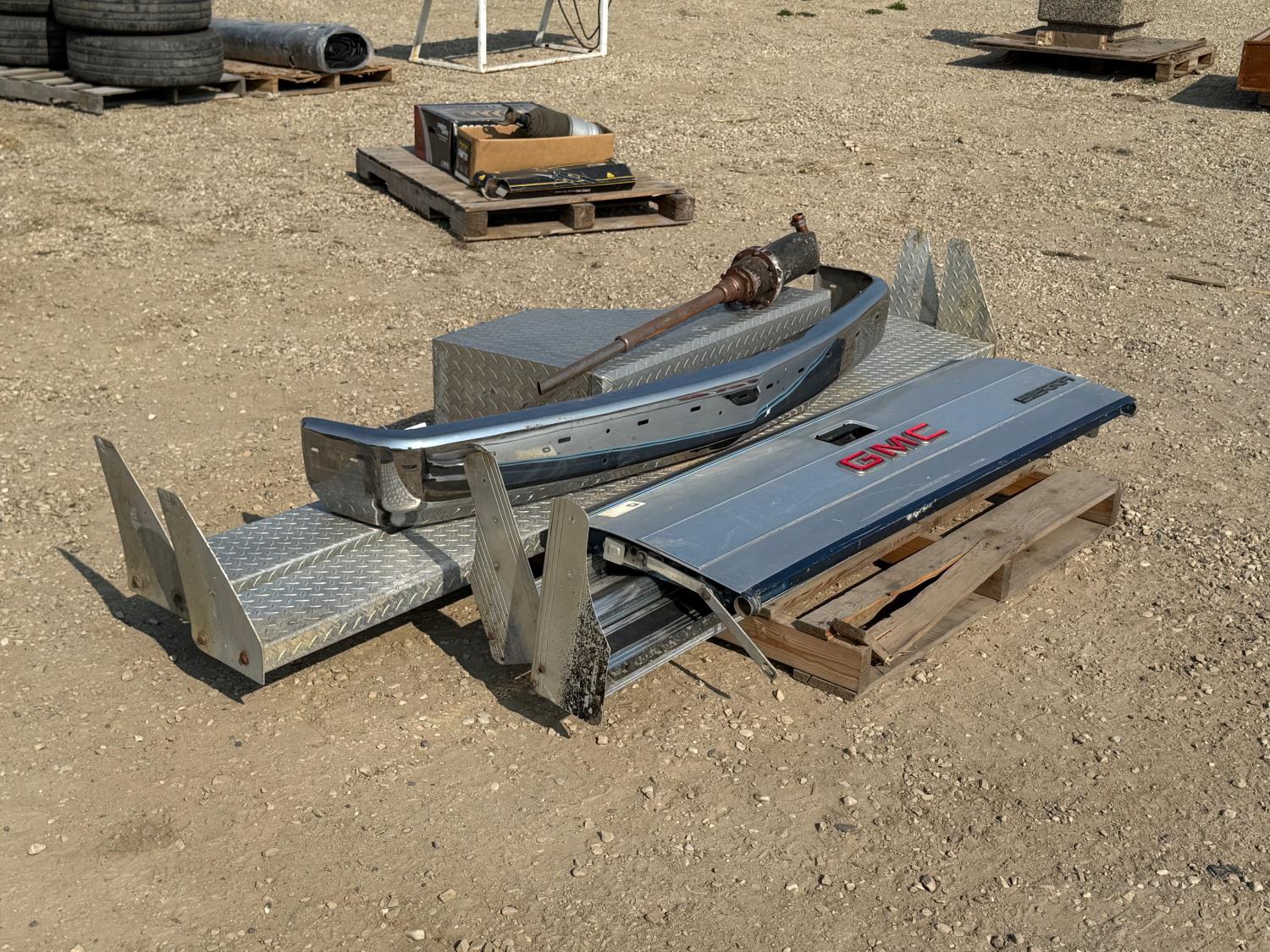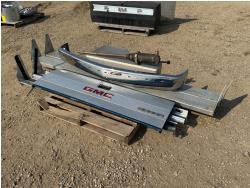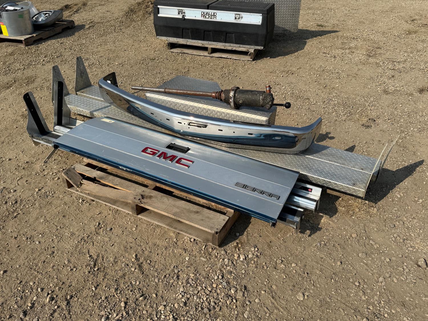 one set of 80 inch running boards, one set of 104 inch running boards, GMC tailgate, GMC front bumper, small truck box toolbox, sump pump
