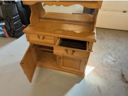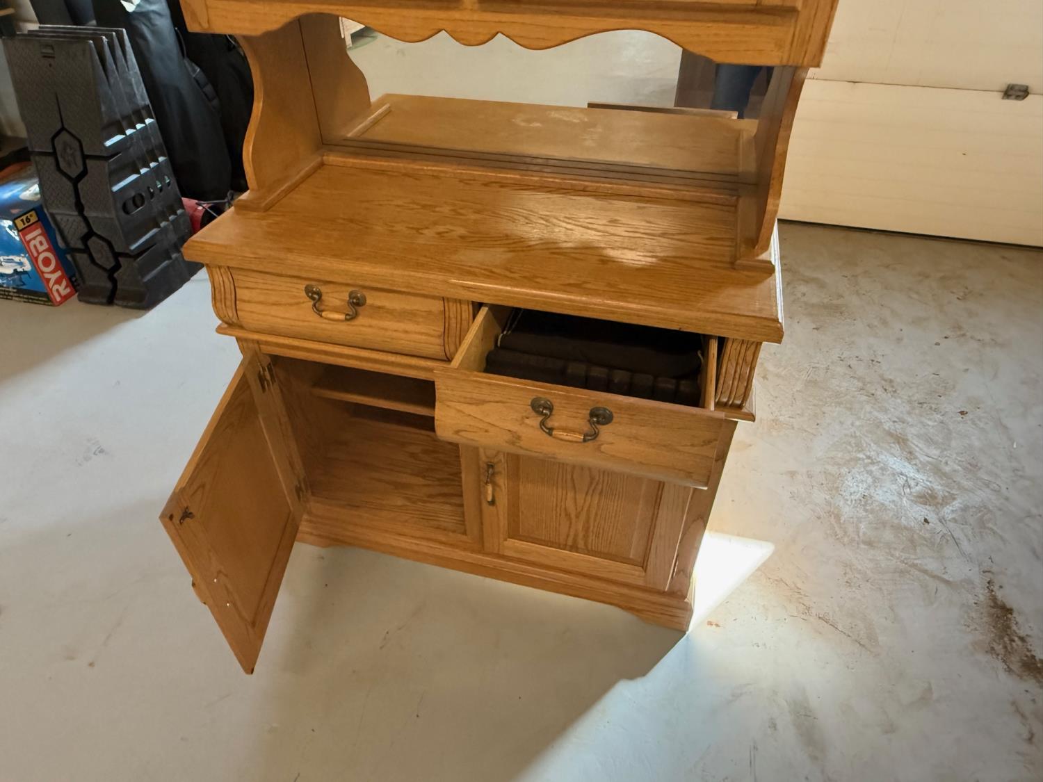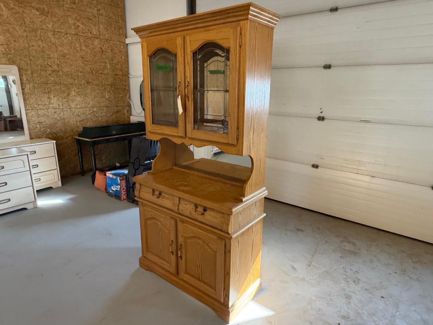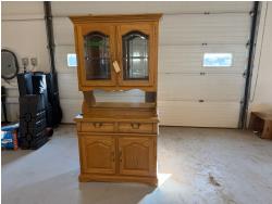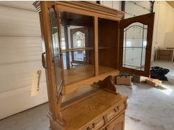 piece honey oak hutch china cabinet Upper section has mirror back with one glass shelf and lighting behind beveled glass doors 42 inch x 18 inch x 79 inch