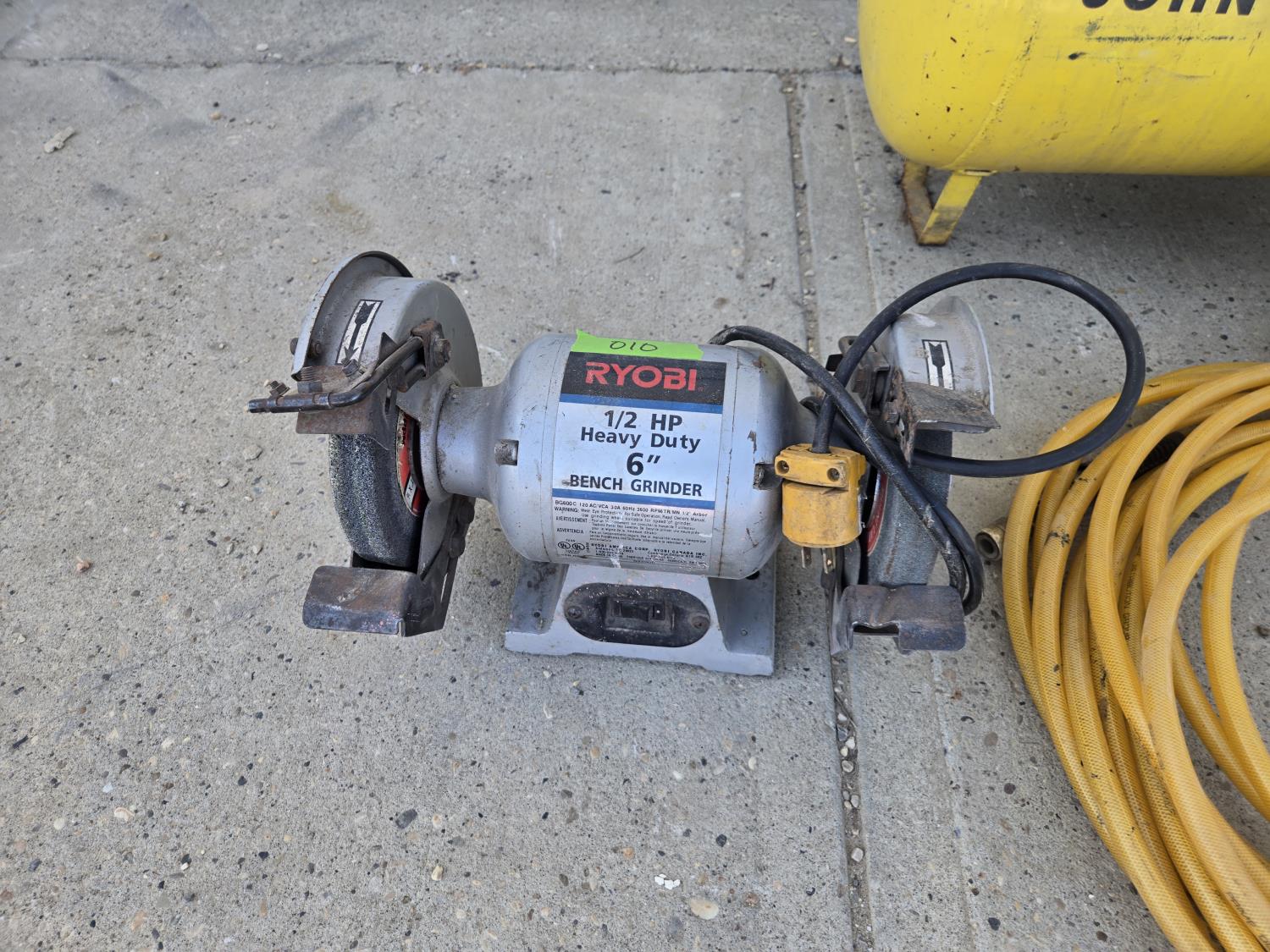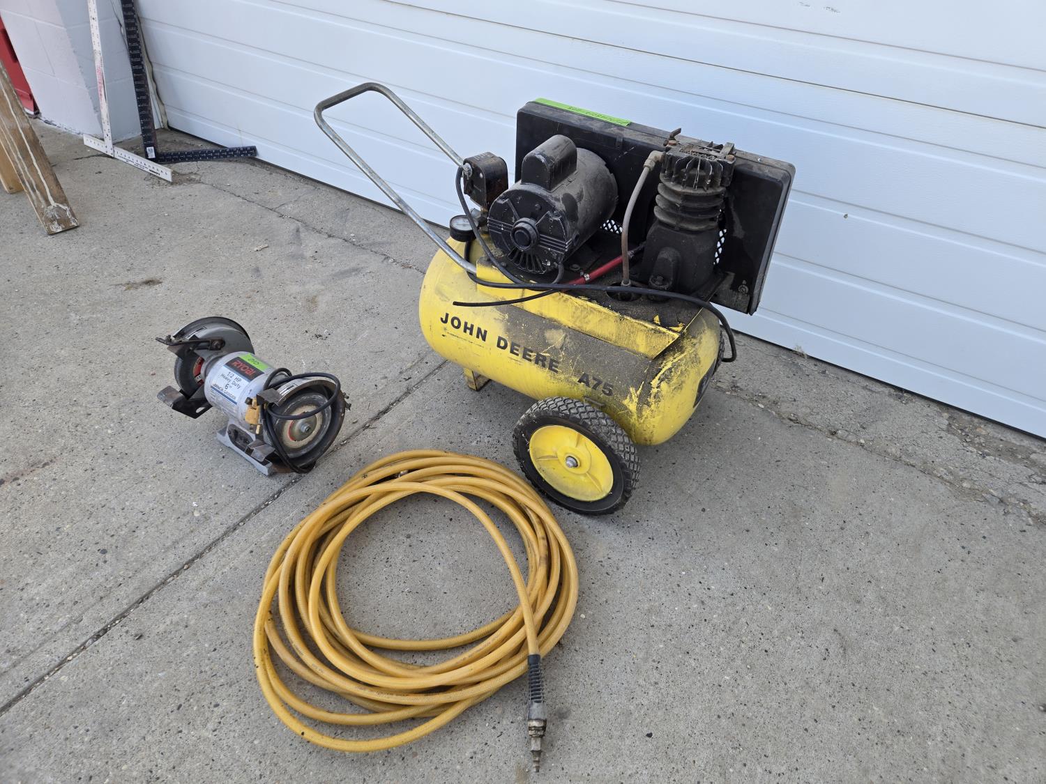 5334 John Deere A75 Air Compressor with Air Hose & 6 Inch Bench Grinder