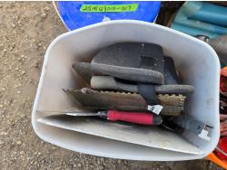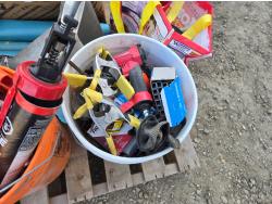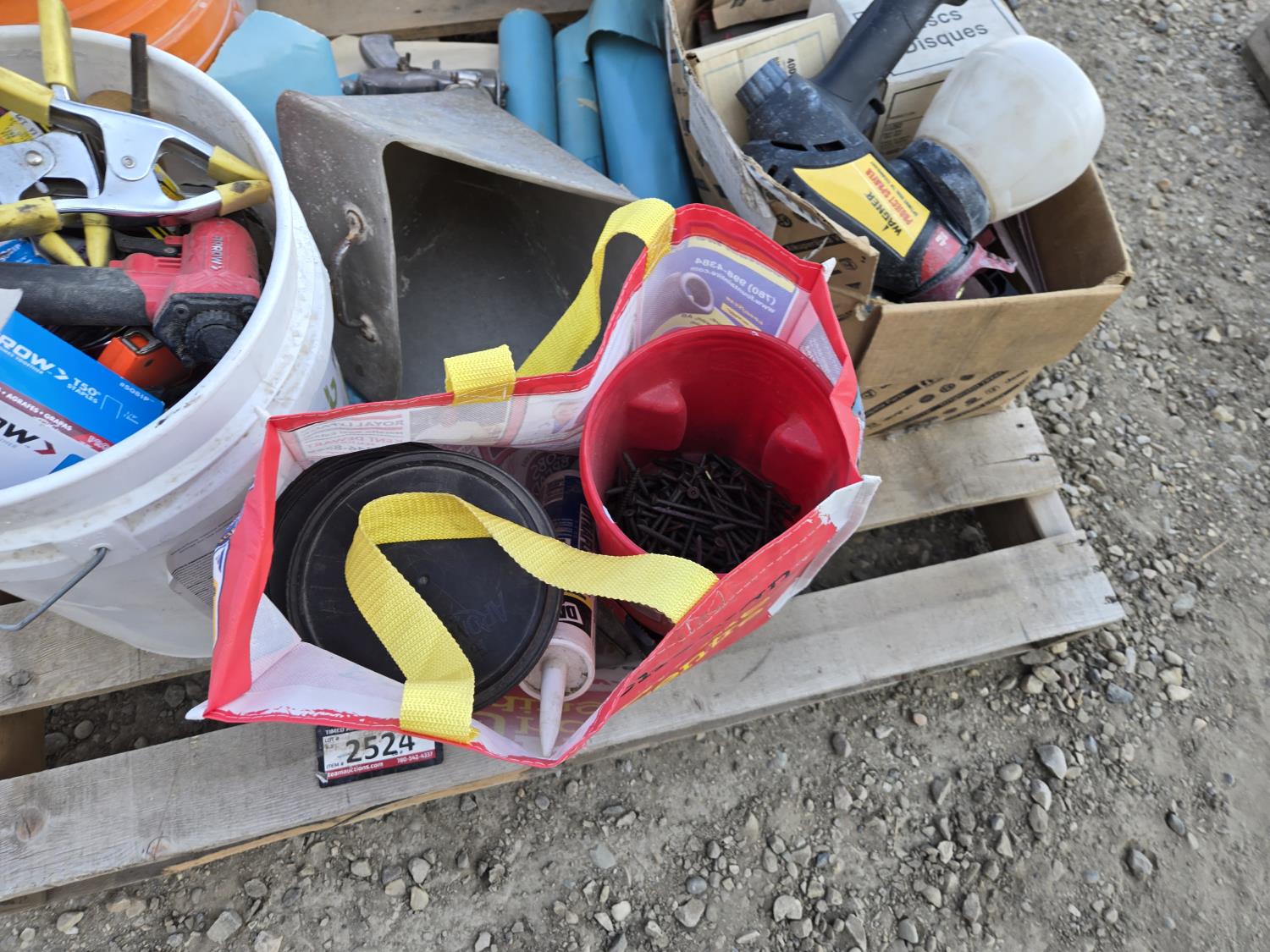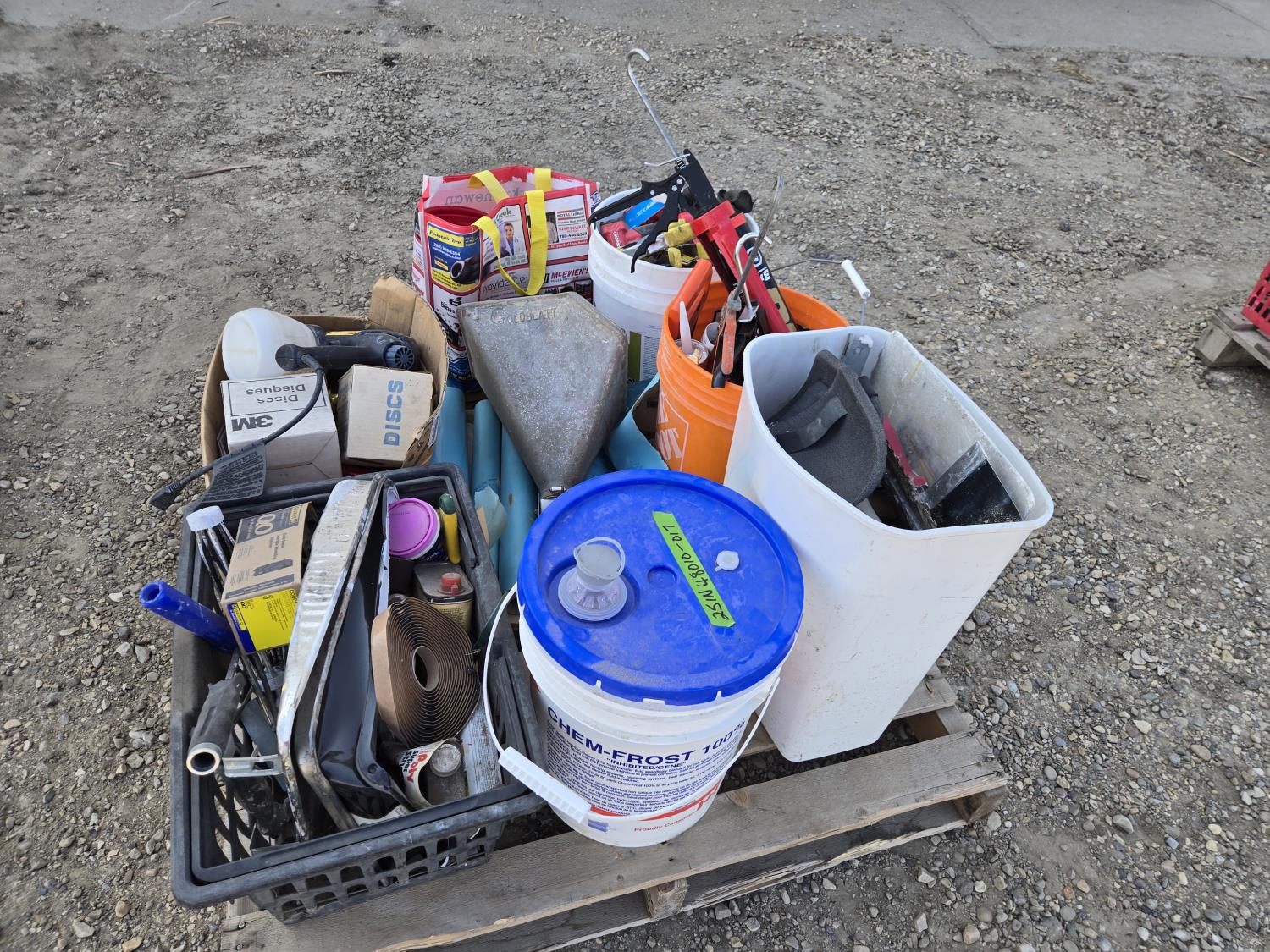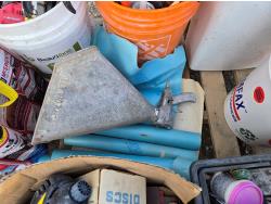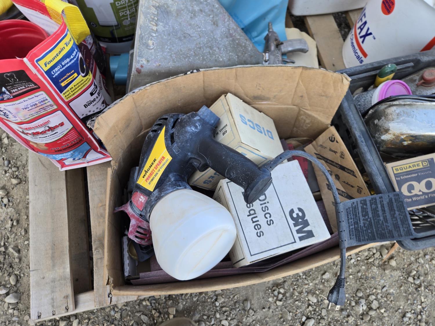 miscellaneous tools, masking paper, paint sprayer, pail of Chem frost, painting supplies, hardware