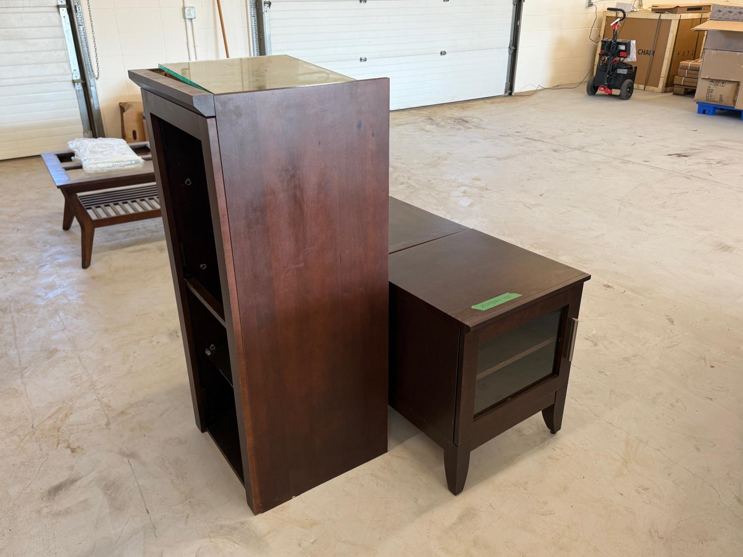 Pair of mahogany end tables 20 inch x 20 inch x 24 inch T 3 glass shelf display unit 20 inch x 20 inch x 48 inch T