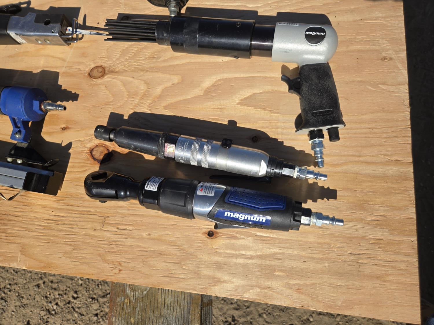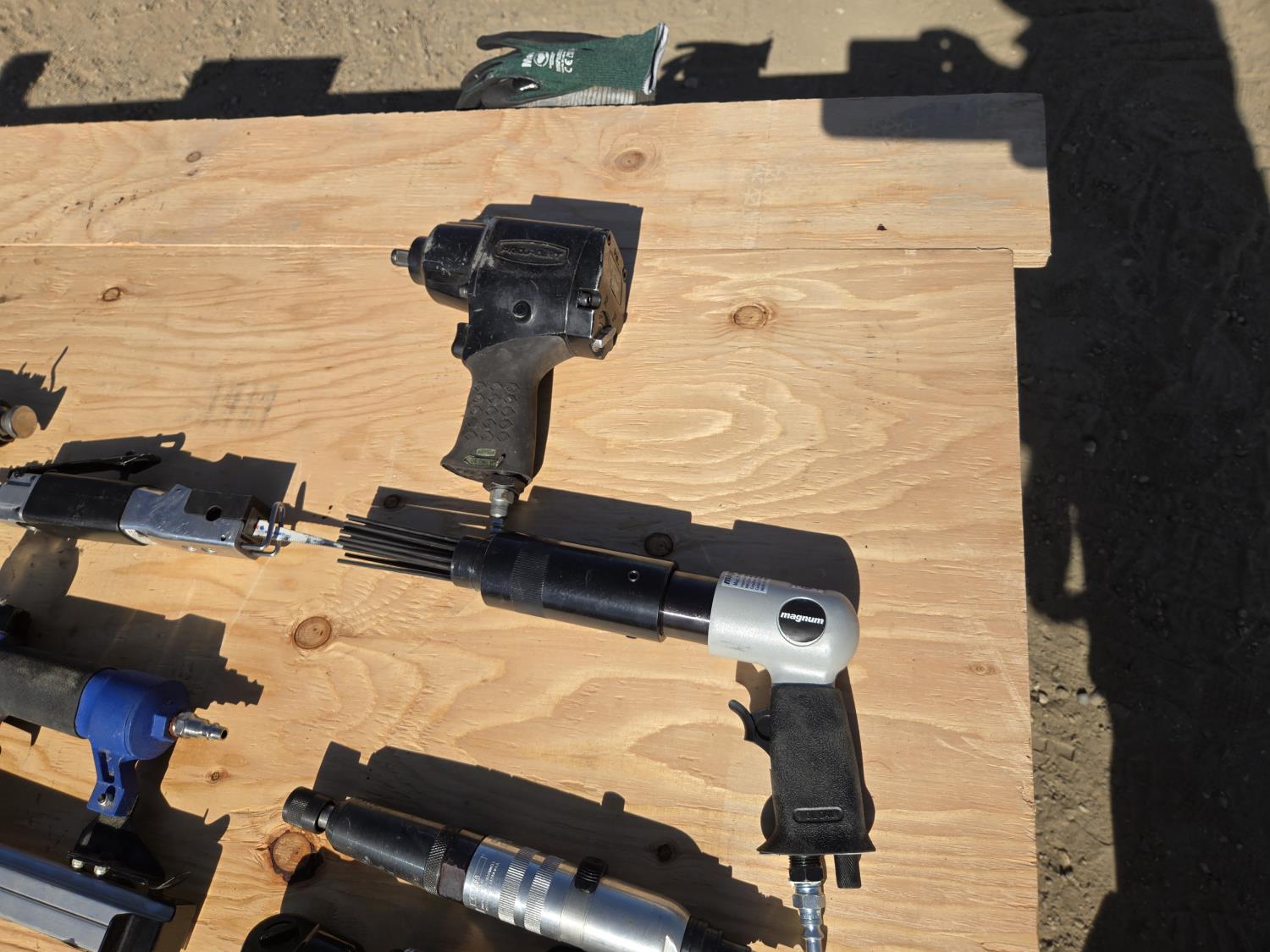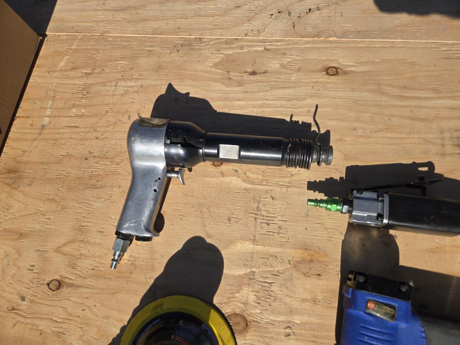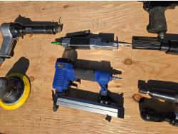 hacksaw, die grinder, brad nailer, 1/2 impact, palm sander, de-scaler, 3/8 ratchet, air chiesel