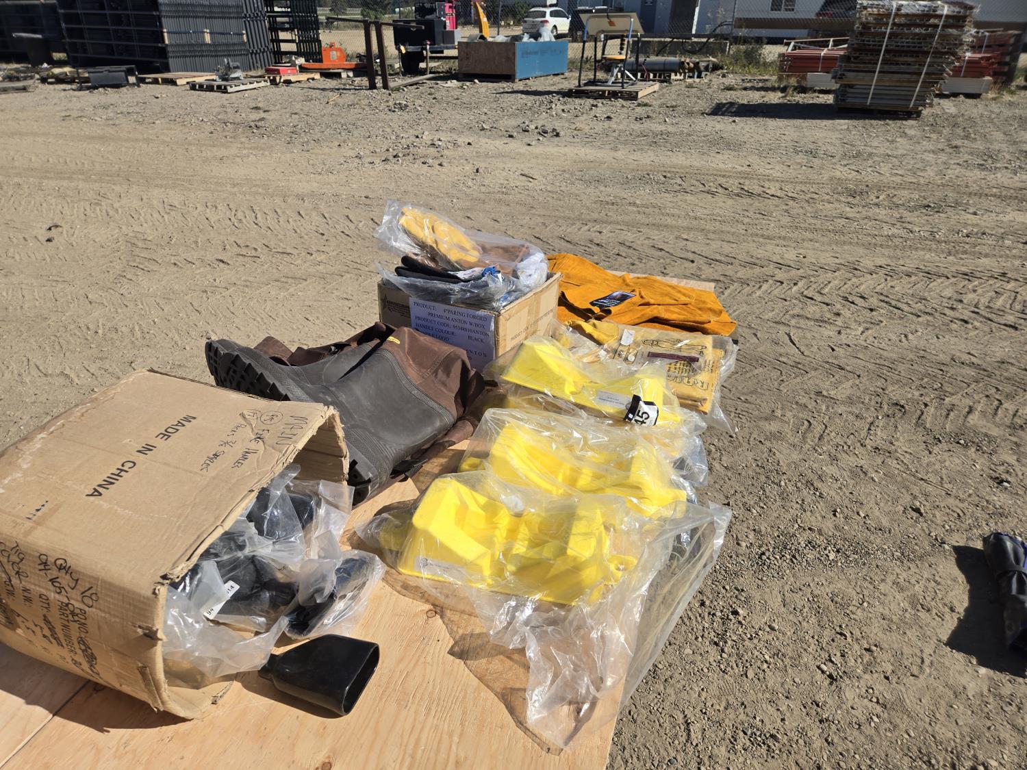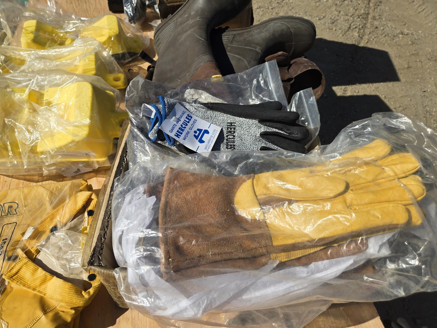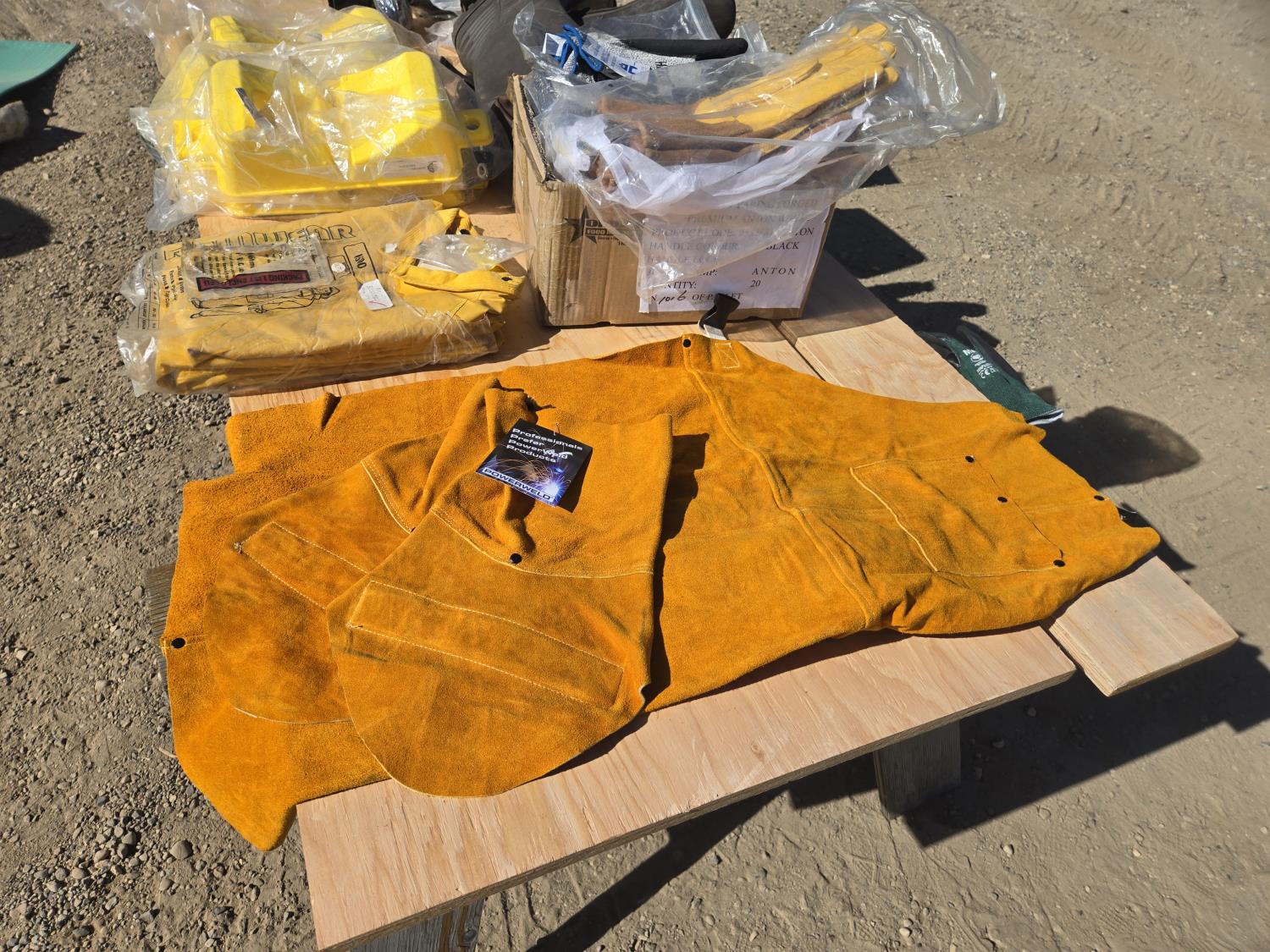 Hip waders, compressed air tank brackets, rain gear, qty of gloves, leather welding bib and boot covers