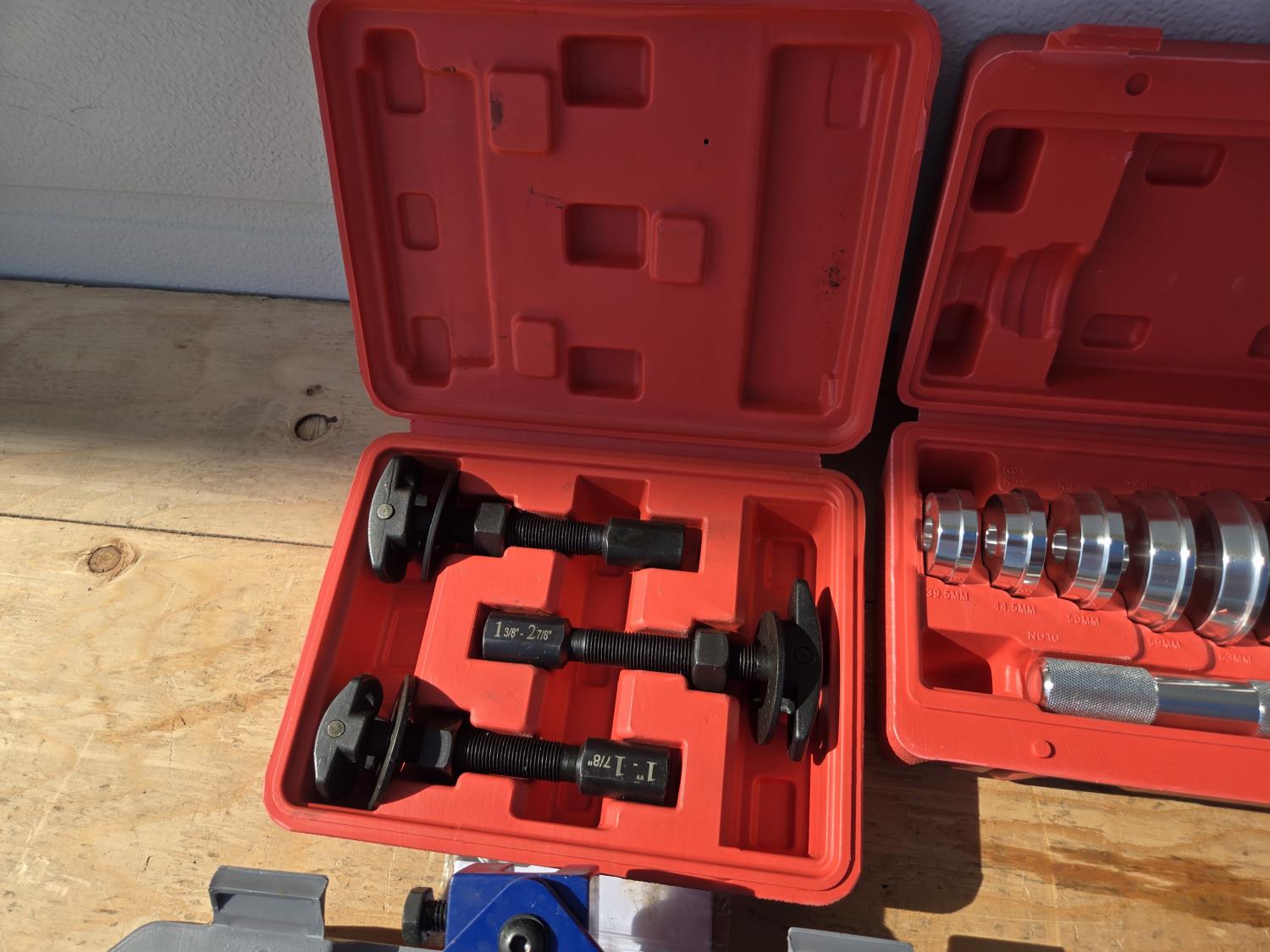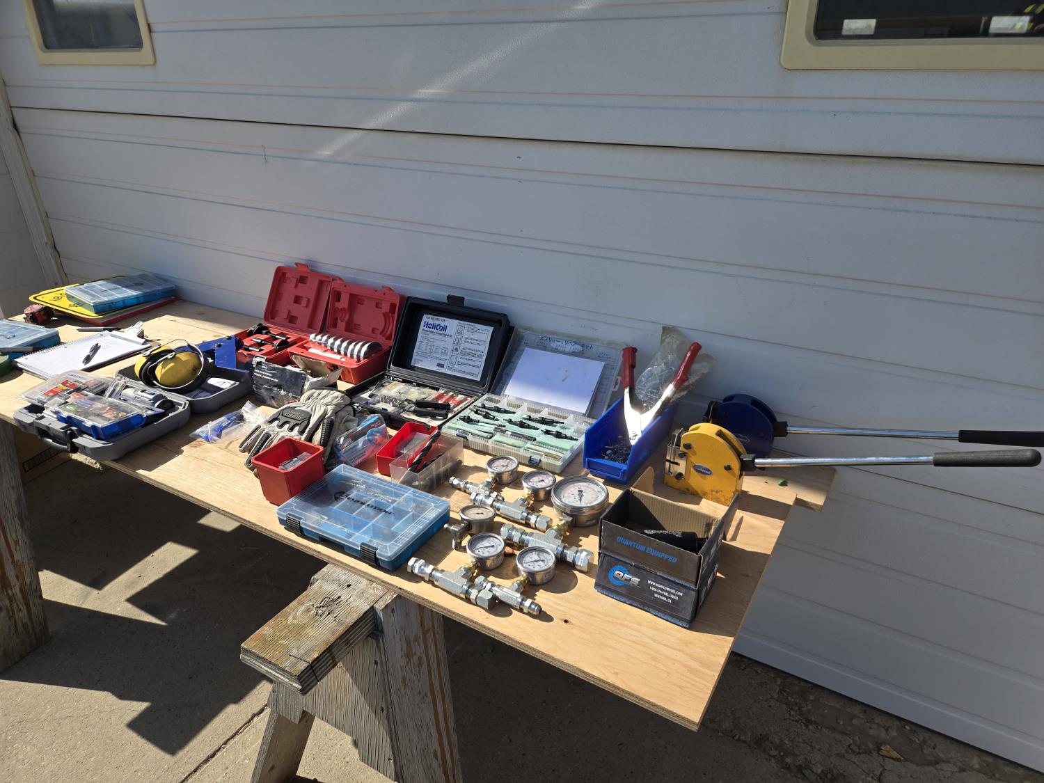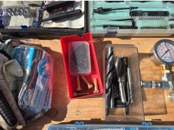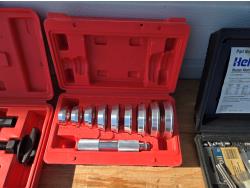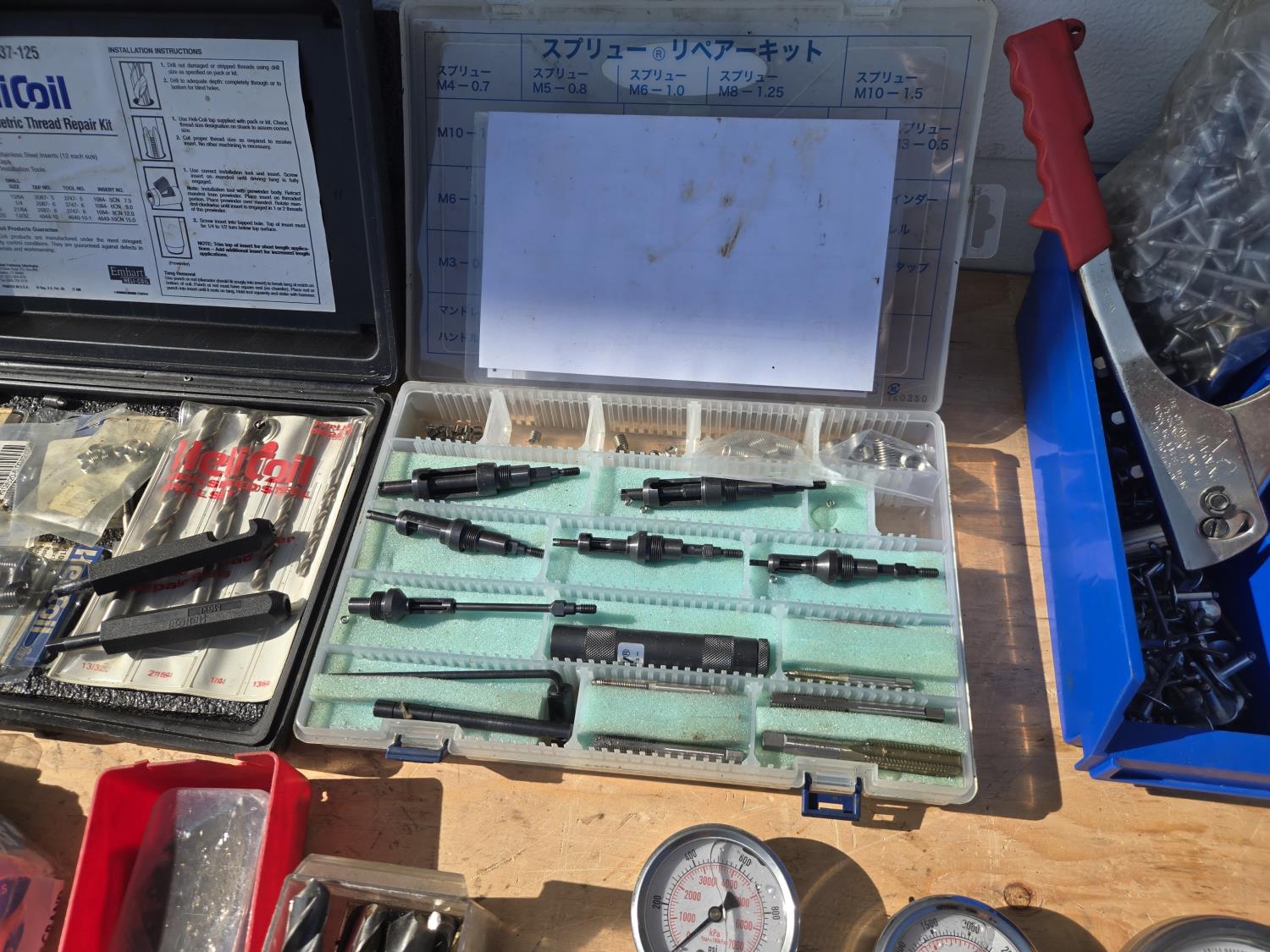Dremel kit, bearing puller, seal driver, (2) Helicoil kits, metal shrinker, metal stretcher, pop riveter, qty of hydraulic hoses, miscellaneous items
