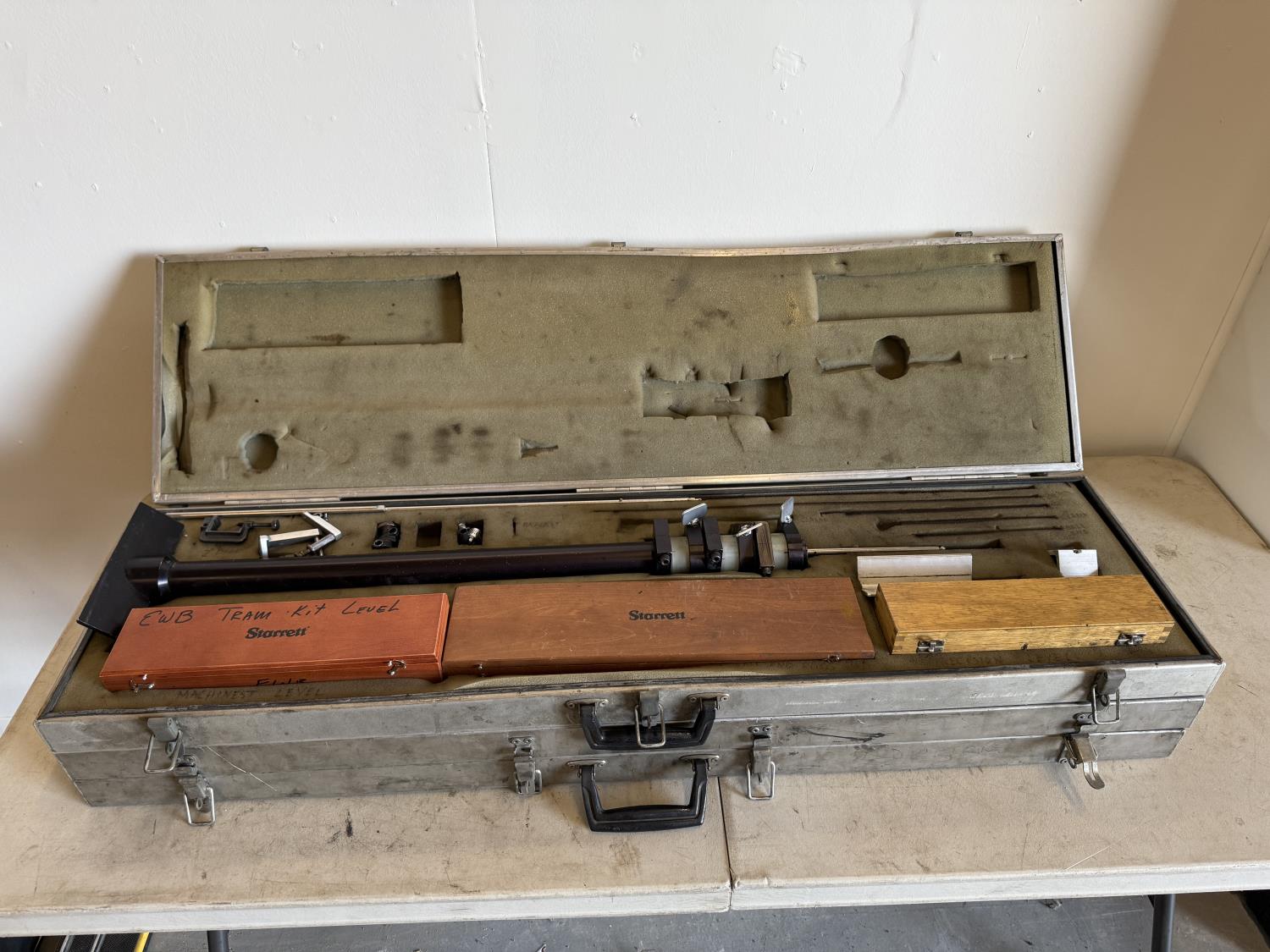 Pair of aluminum cases containing a leveling system for machine leveling. Machinist level included