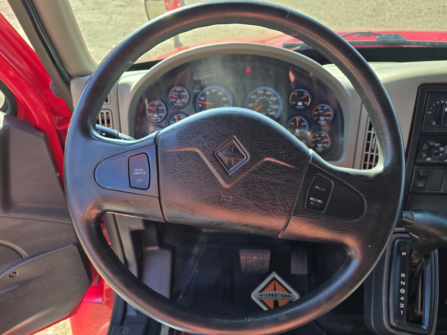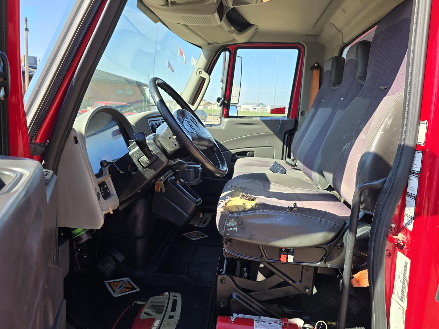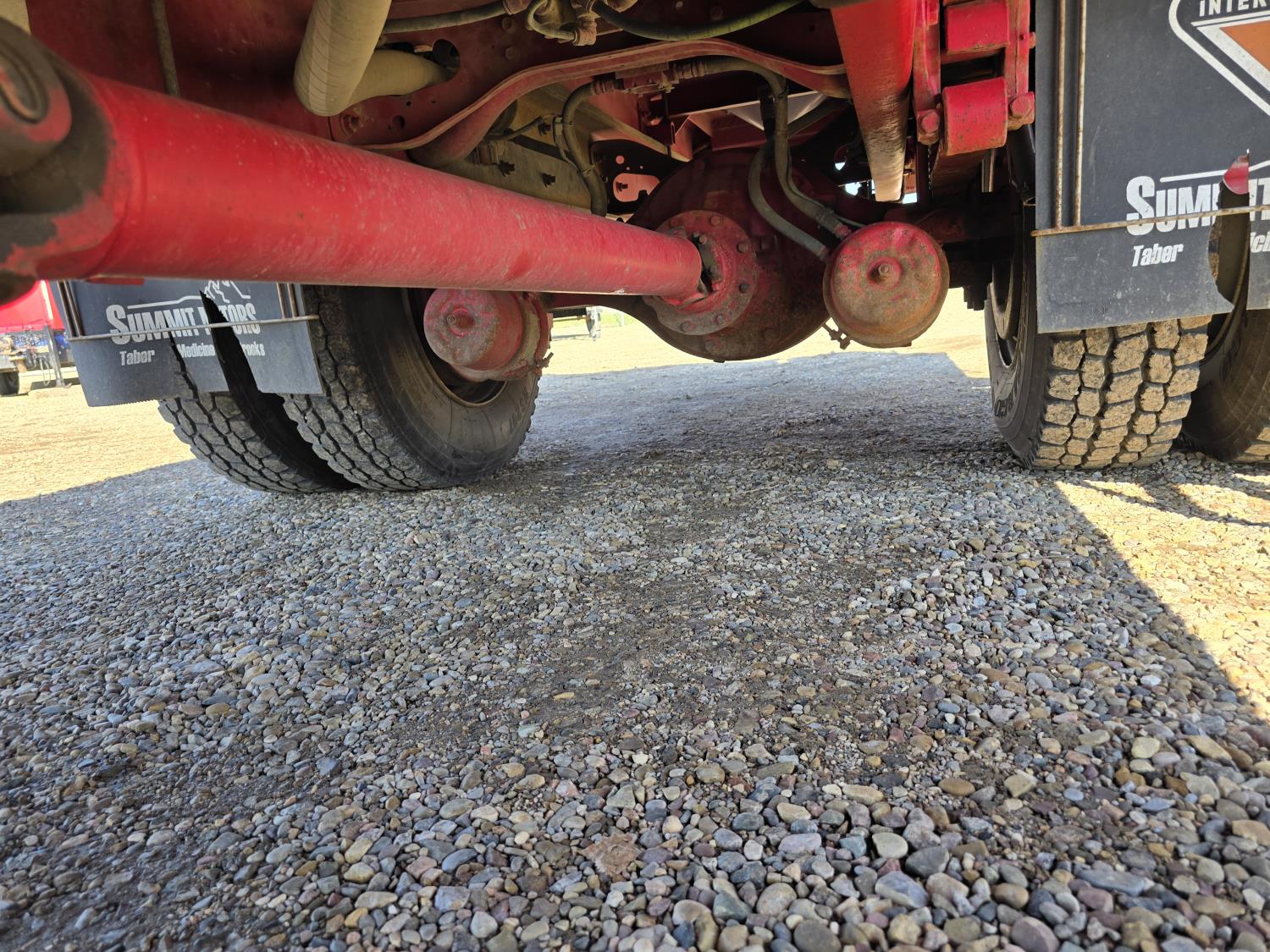 MaxxForce DT466 7.6 L 6 cylinder diesel engine, electric engine block heater, positive air shutoff, automatic transmission, A/C, P/W, P/L, cruise control, air ride driver seat, headache rack, tool boxes, 8 ft 2 inch x 19 ft 6 inch deck, Ingersoll Rand 425 CFM compressor, 2018 200 PSI air dryer, 600 lb blast pot, Webasto heater on compressor, beacons, spring suspension, 18,500 lb front axle, 26,000 lb rear axles, 255 inch WB, 11R22.5 tires