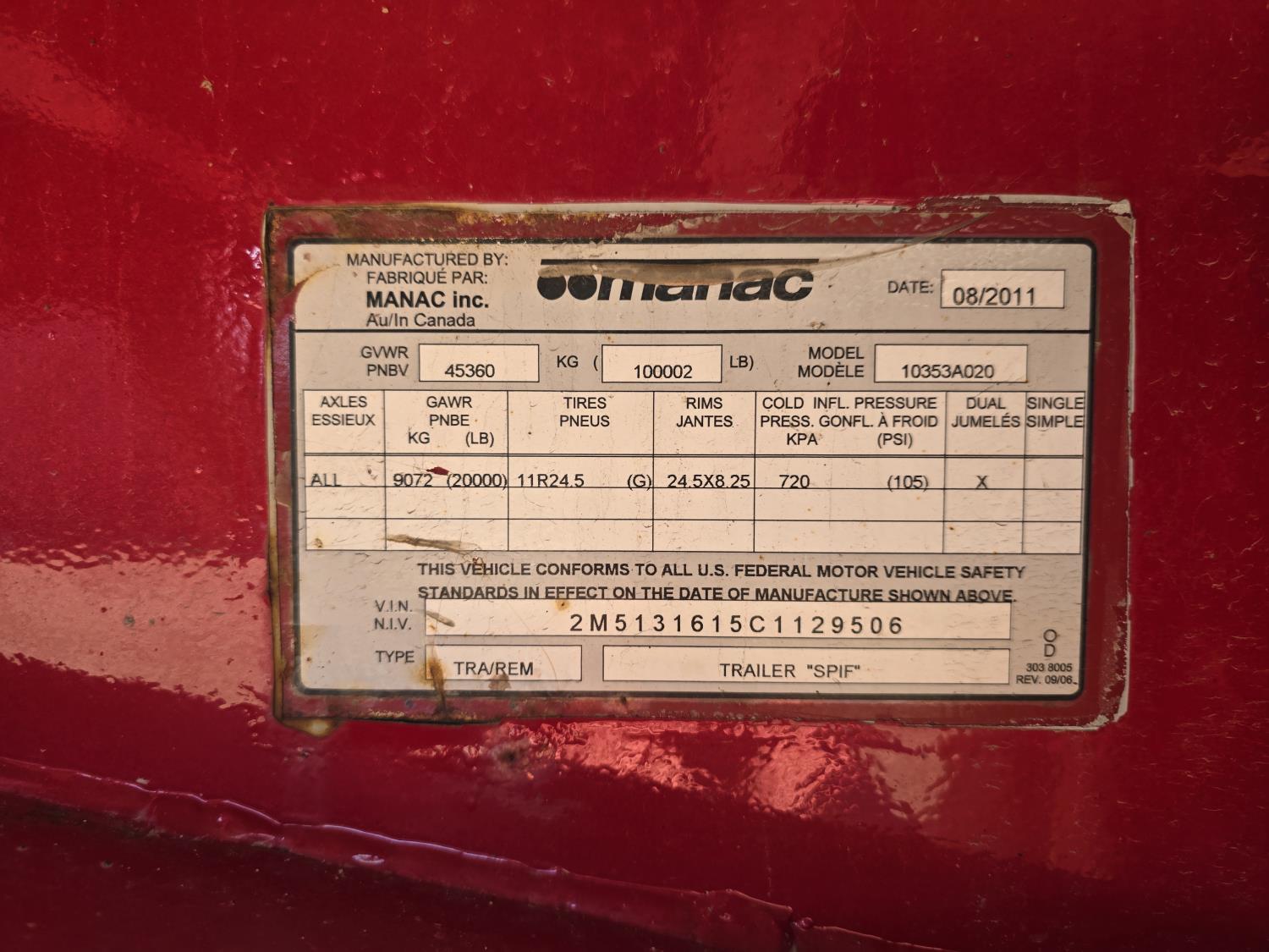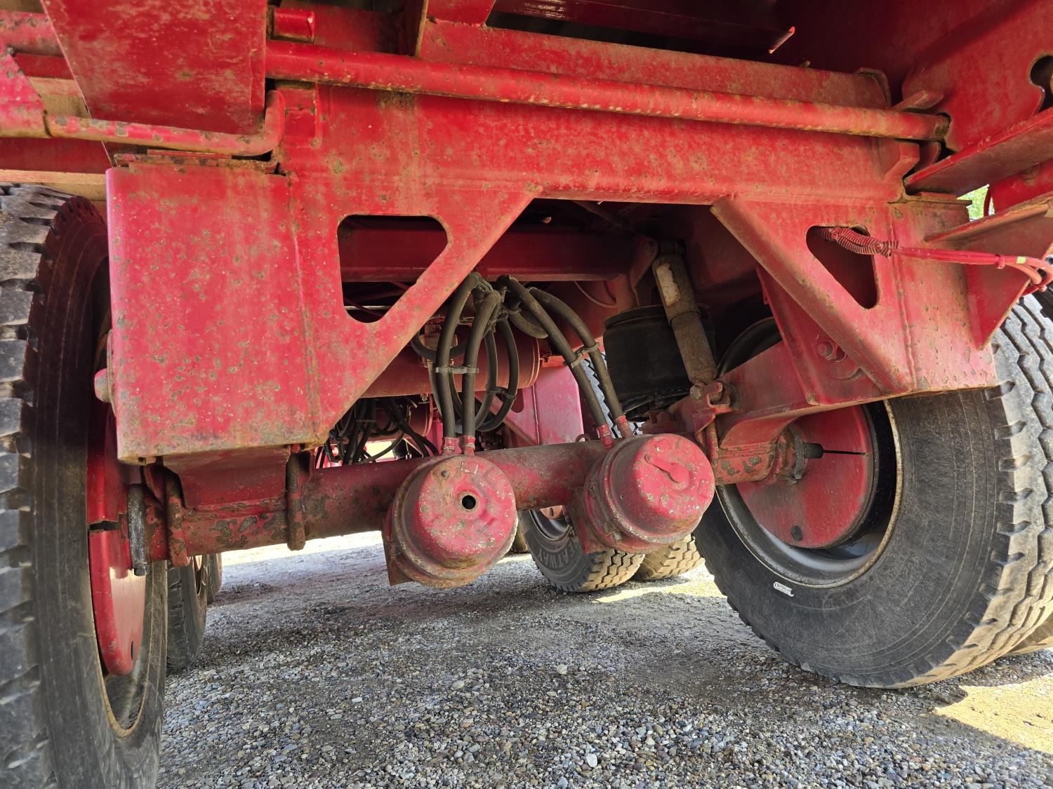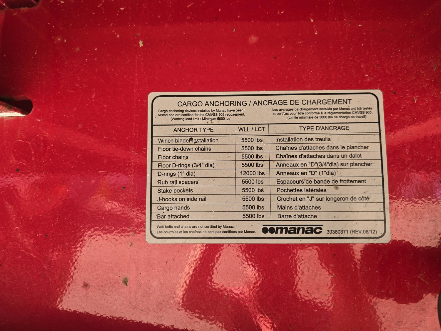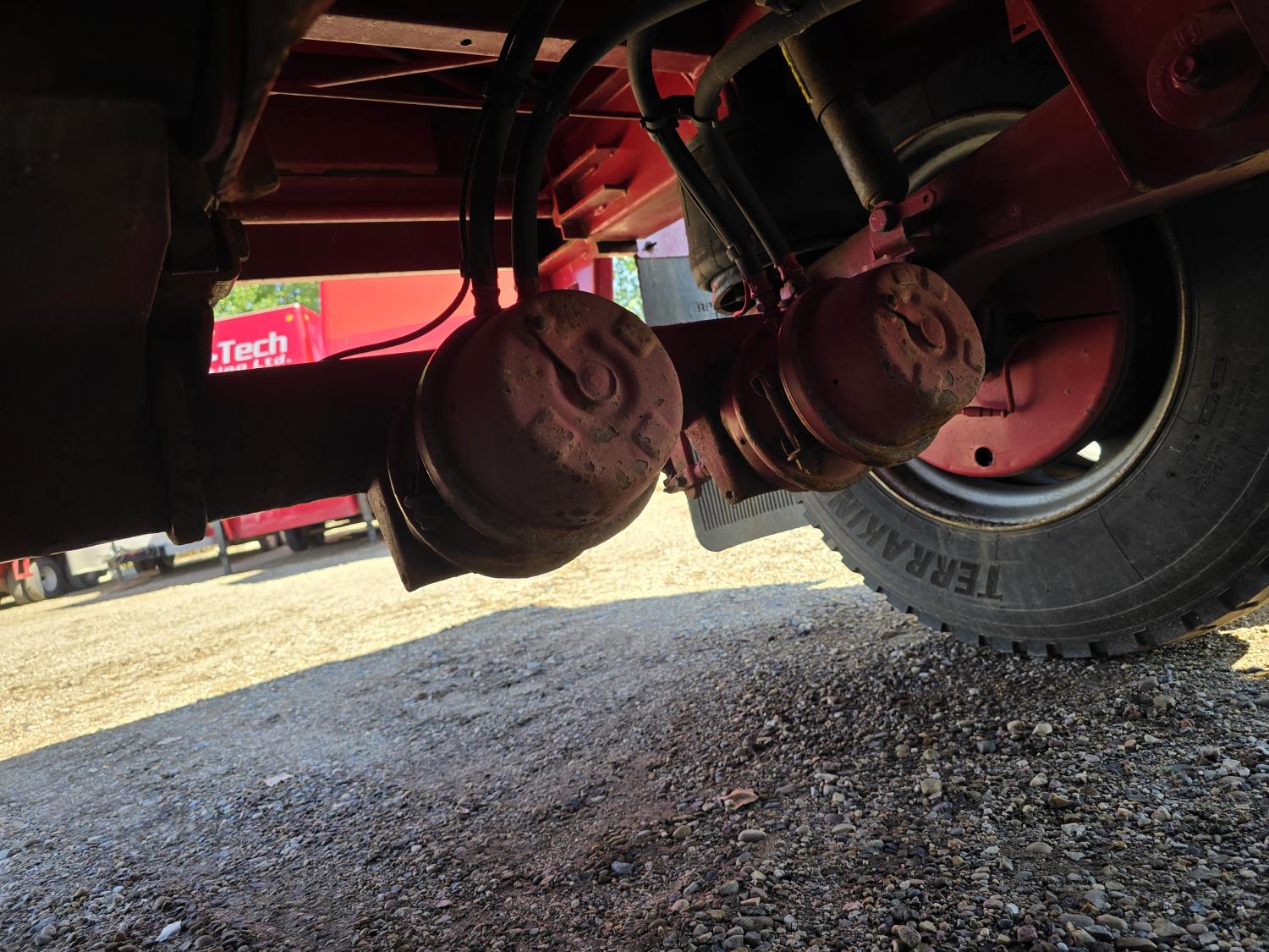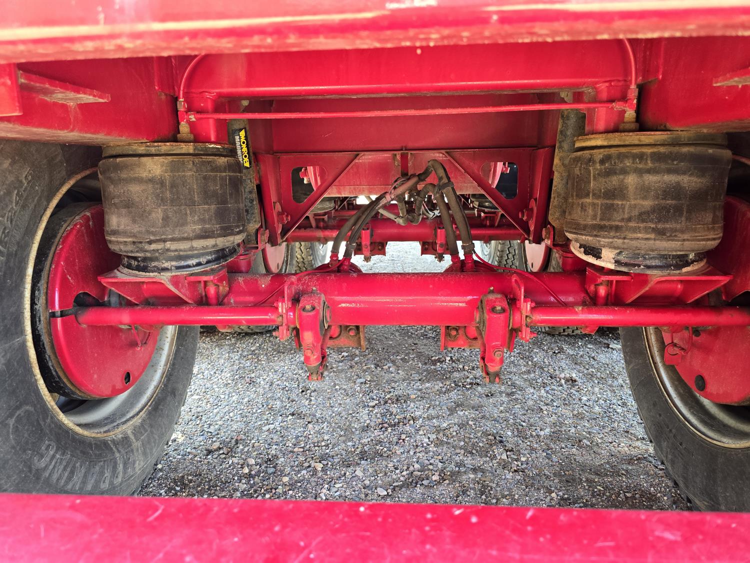 102 inch wide deck, wood deck, stake pockets, rub rails, cargo winches, air brakes, 20,000 lb axles, air ride suspension, 11R24.5 tires