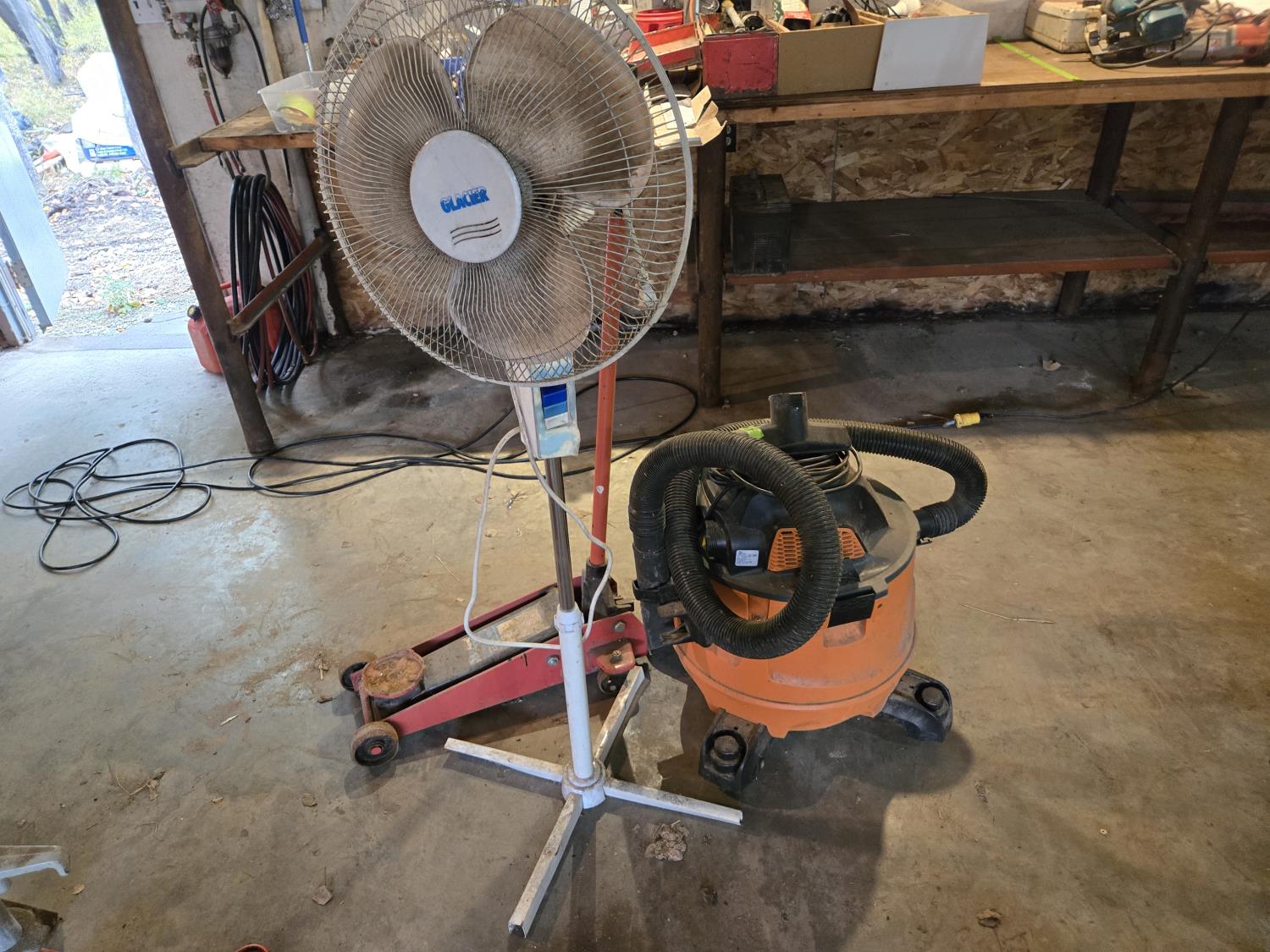 1909 2-3/4 Ton Floor Jack, Ridgid Shop Vac, Floor Fan