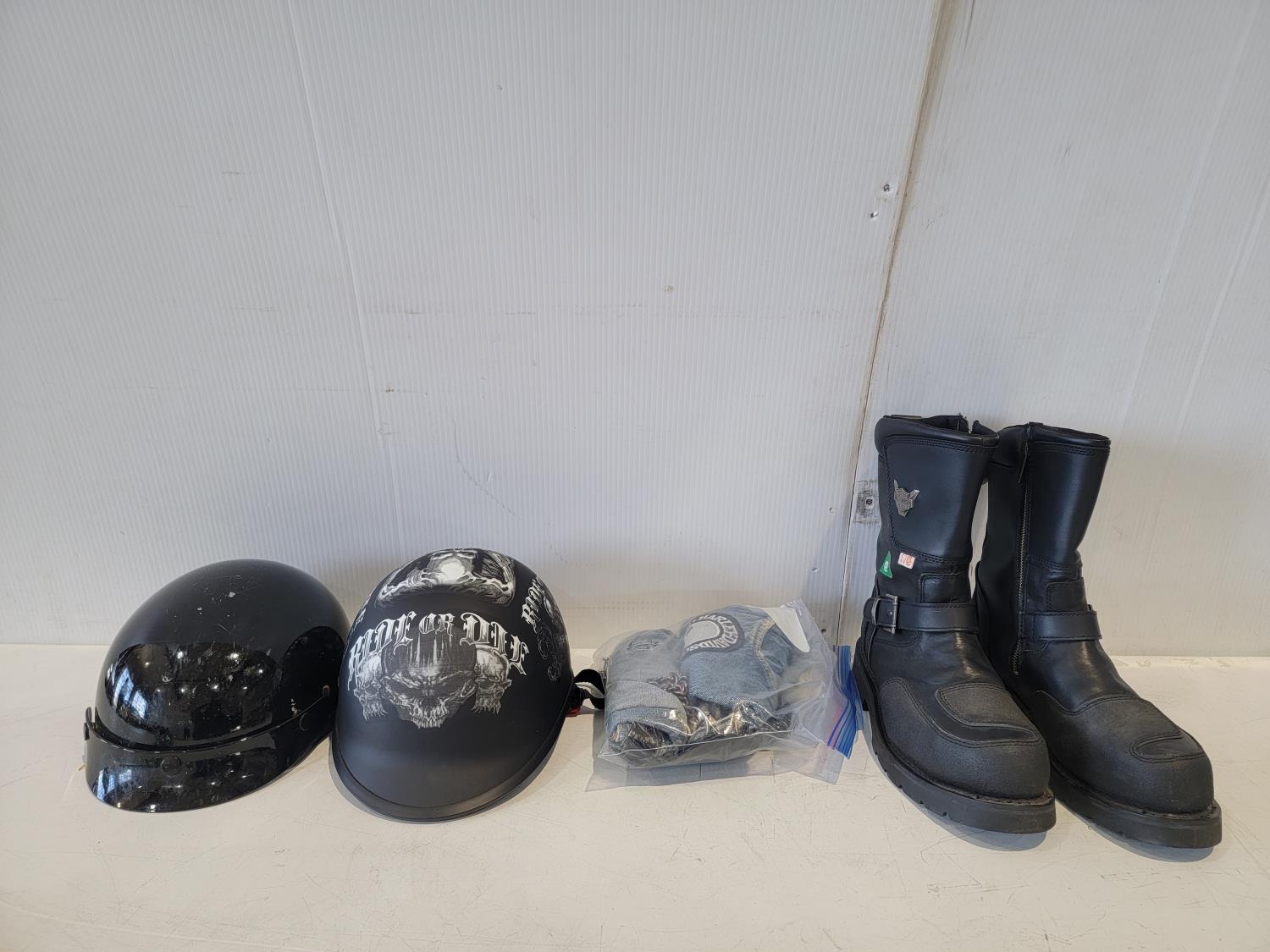 1397 (2) Motorcycle Helmets and Harley-Davidson Size 10 Boots
