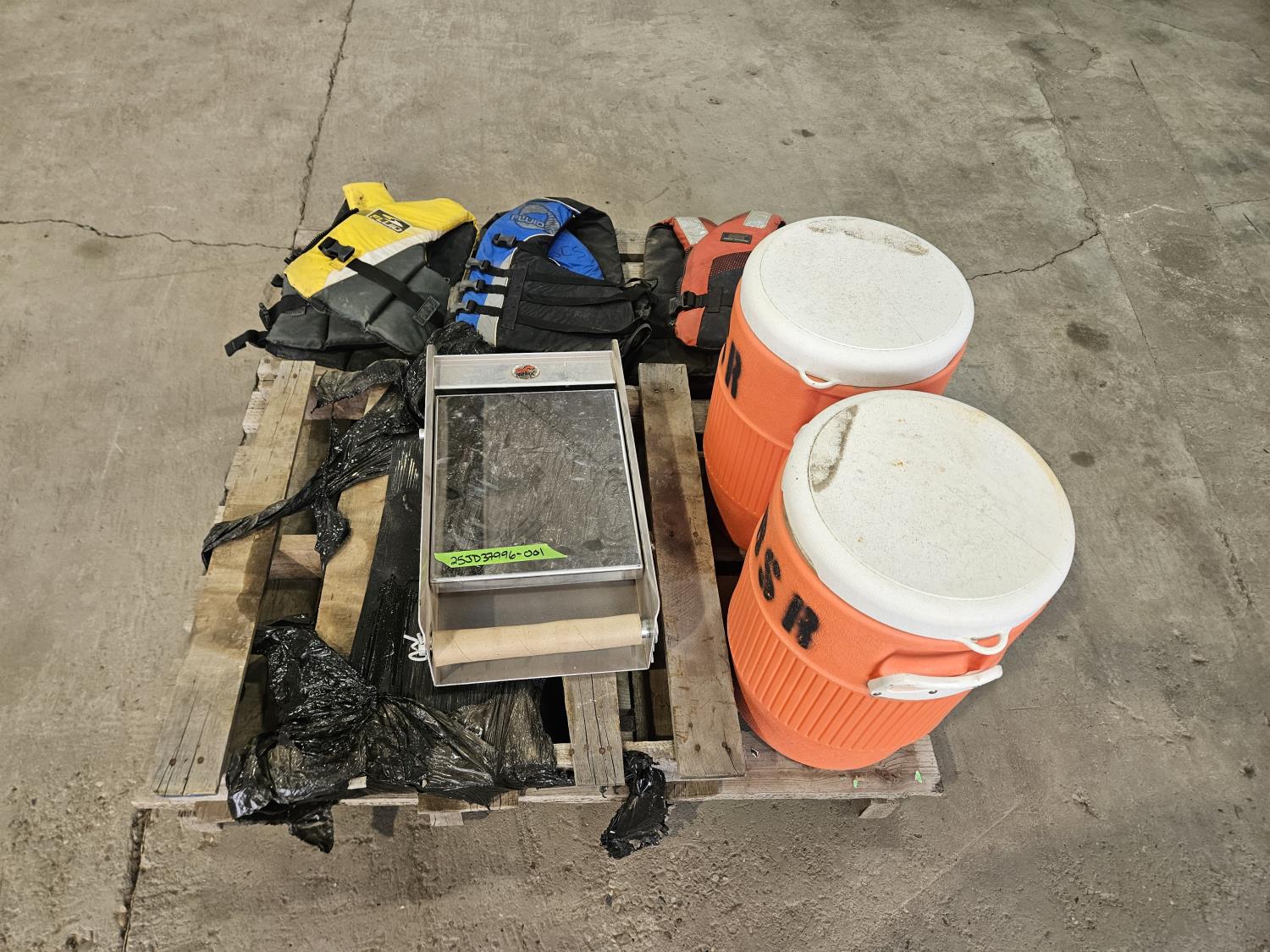 1248 (3) Life Jackets, (2) 5 Gallon Beverage Coolers and Mirror/Paper Towel Holder