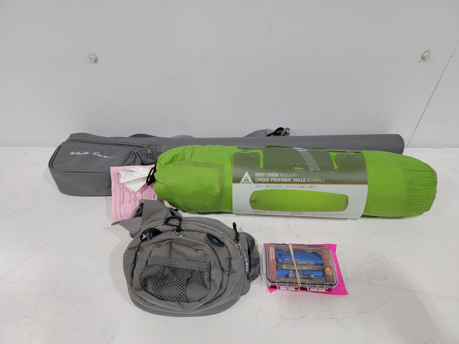 1459 Ascend Deep Creek Regular Self-Inflating Air Mattress, Knife/Light Combo Set, Fly Fishing Rod and Chest Pack