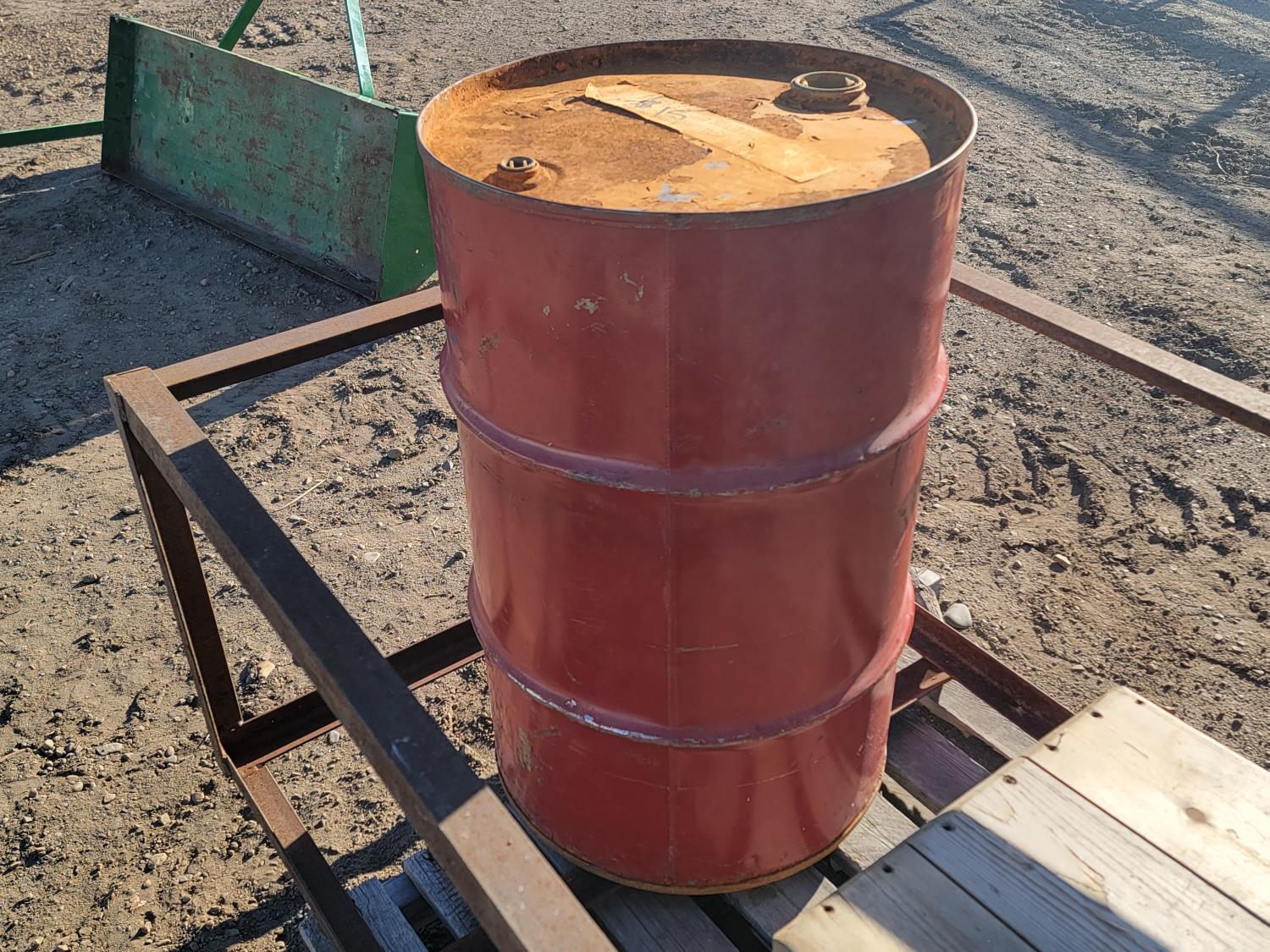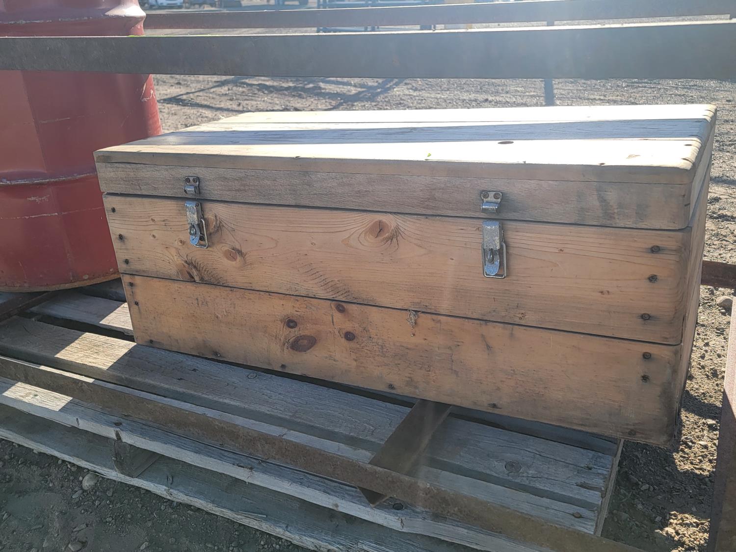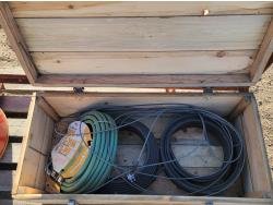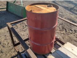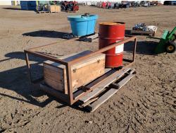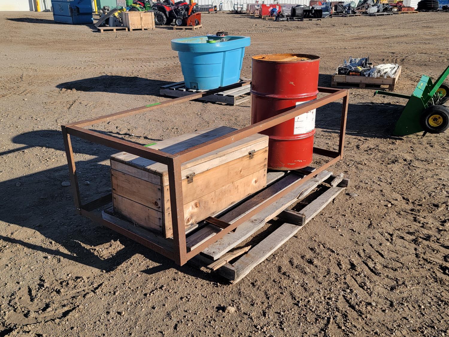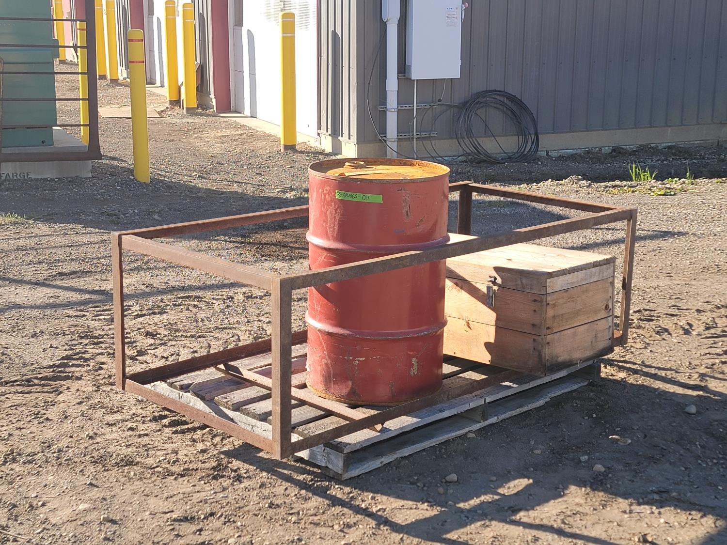1685 Metal Barrel, Steel Cage, and Wooden Storage Box with Contents