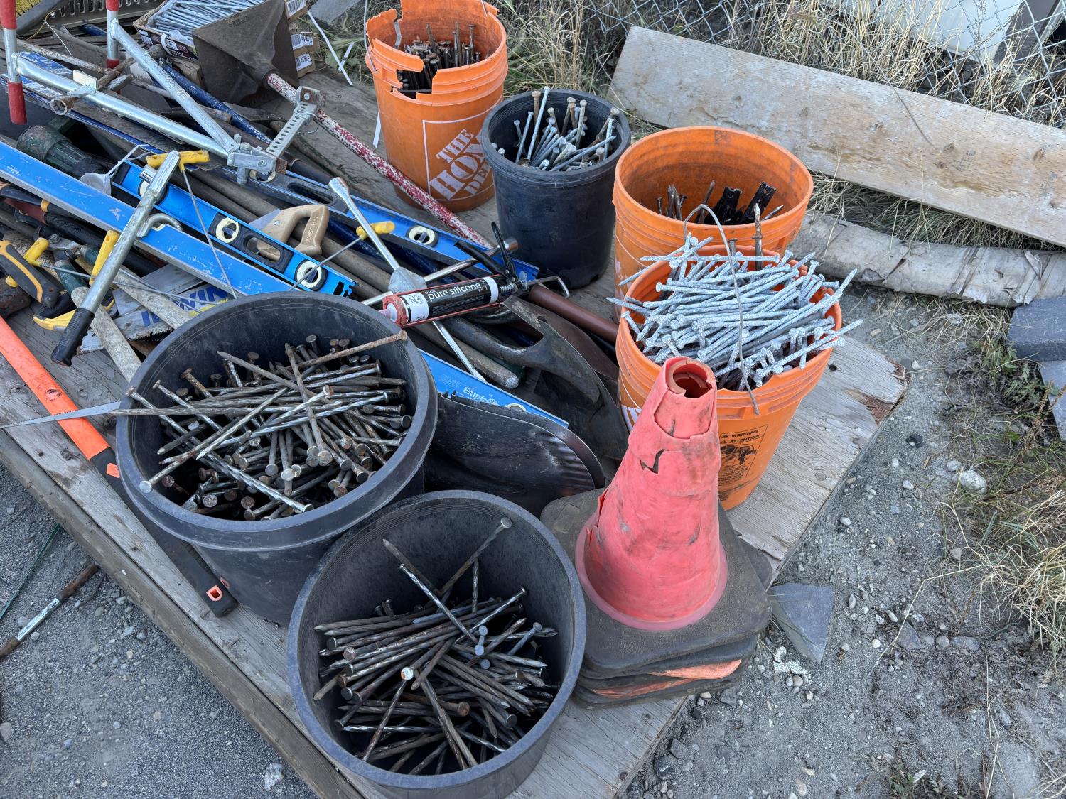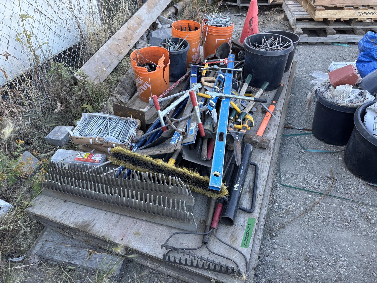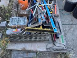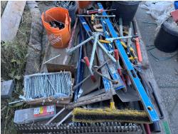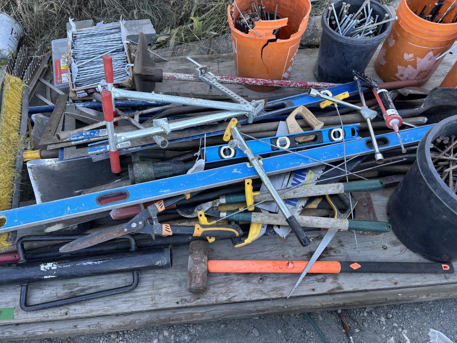 quantity of landscape rakes, rakes, levels, squares, broom, hoe, sledge hammer, structural screws, landscape nails, saws