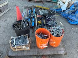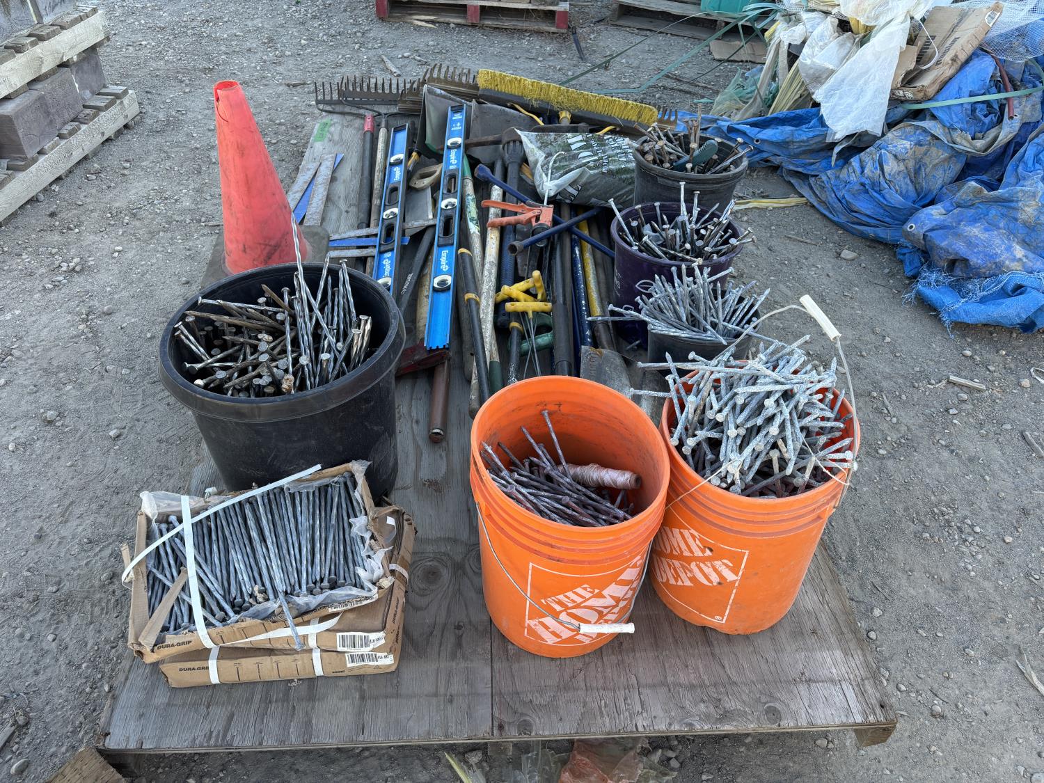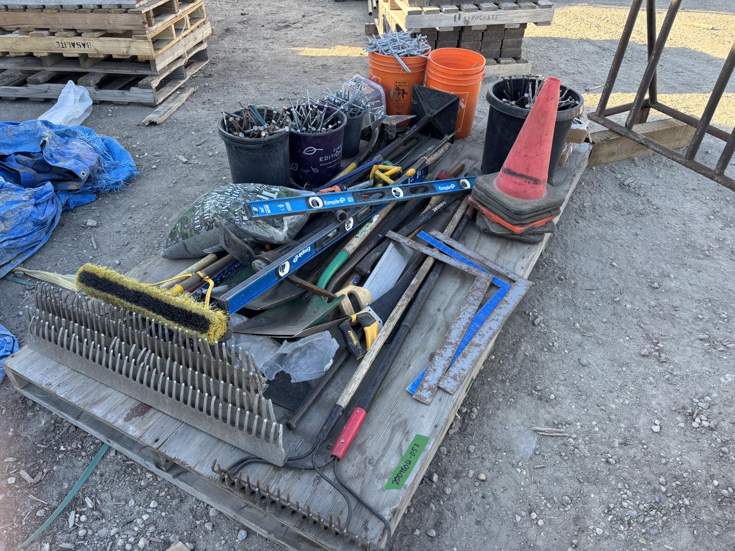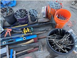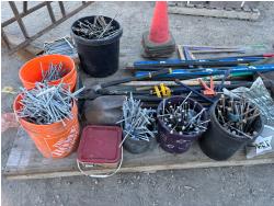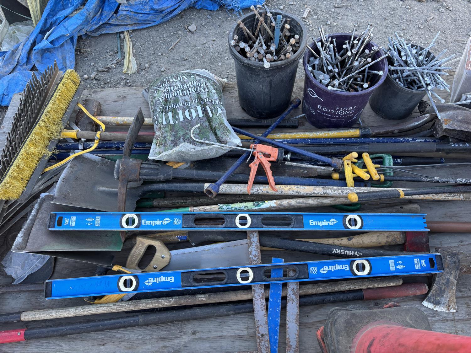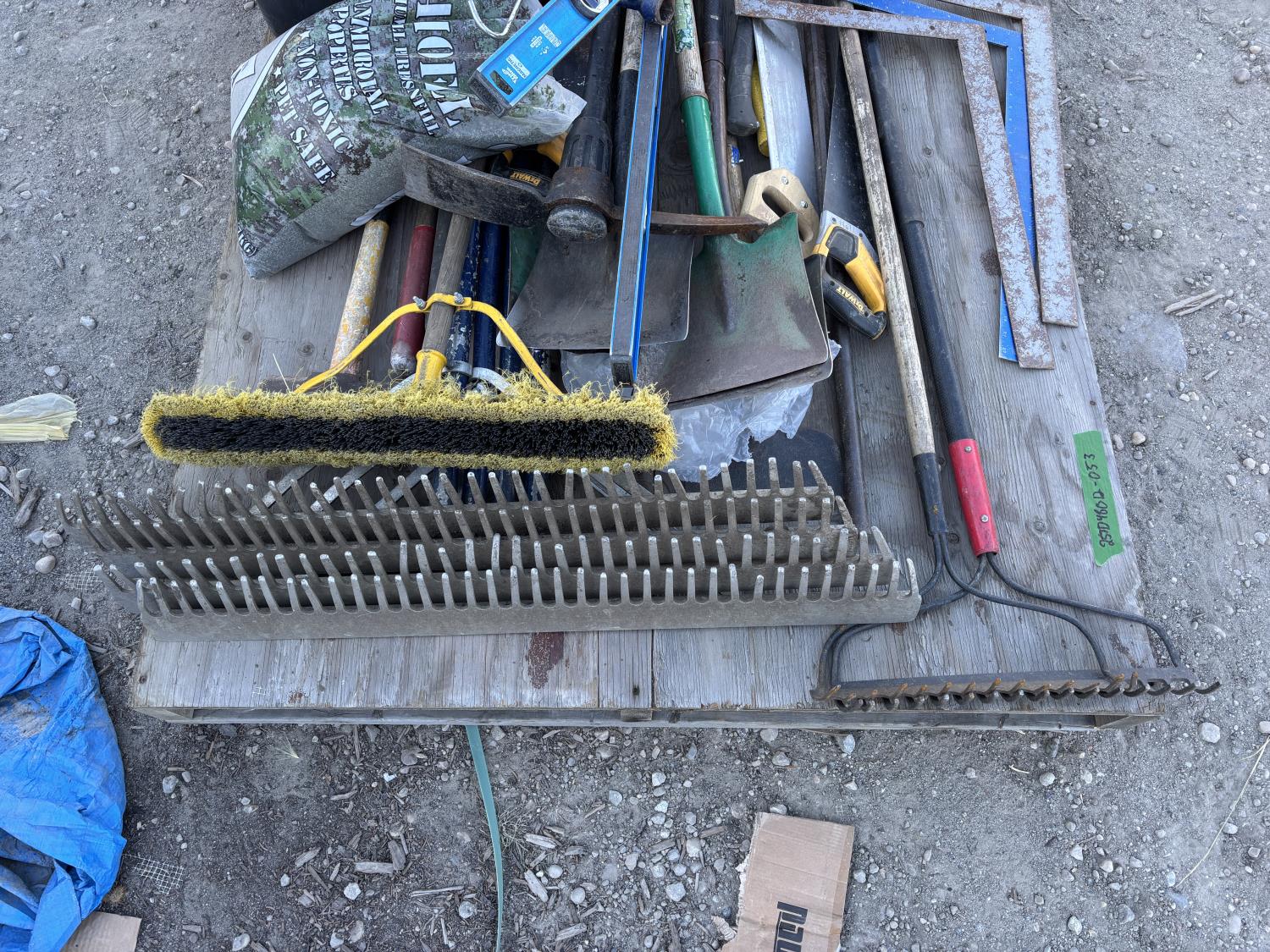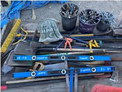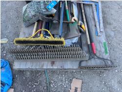 quantity of rakes, landscape rakes, shovels, axes, brooms, landscapes nails, deck screws, squares, levels, hoe, sledge hammer, bag of infill
