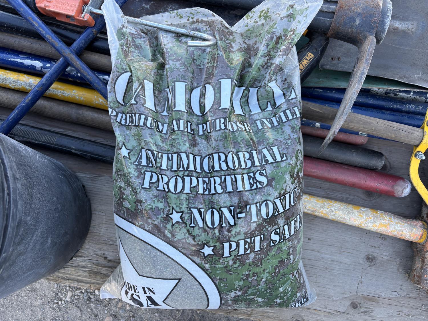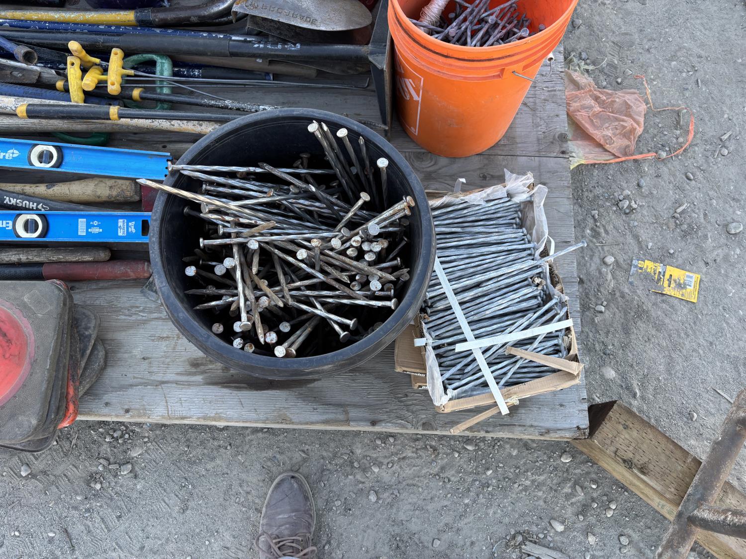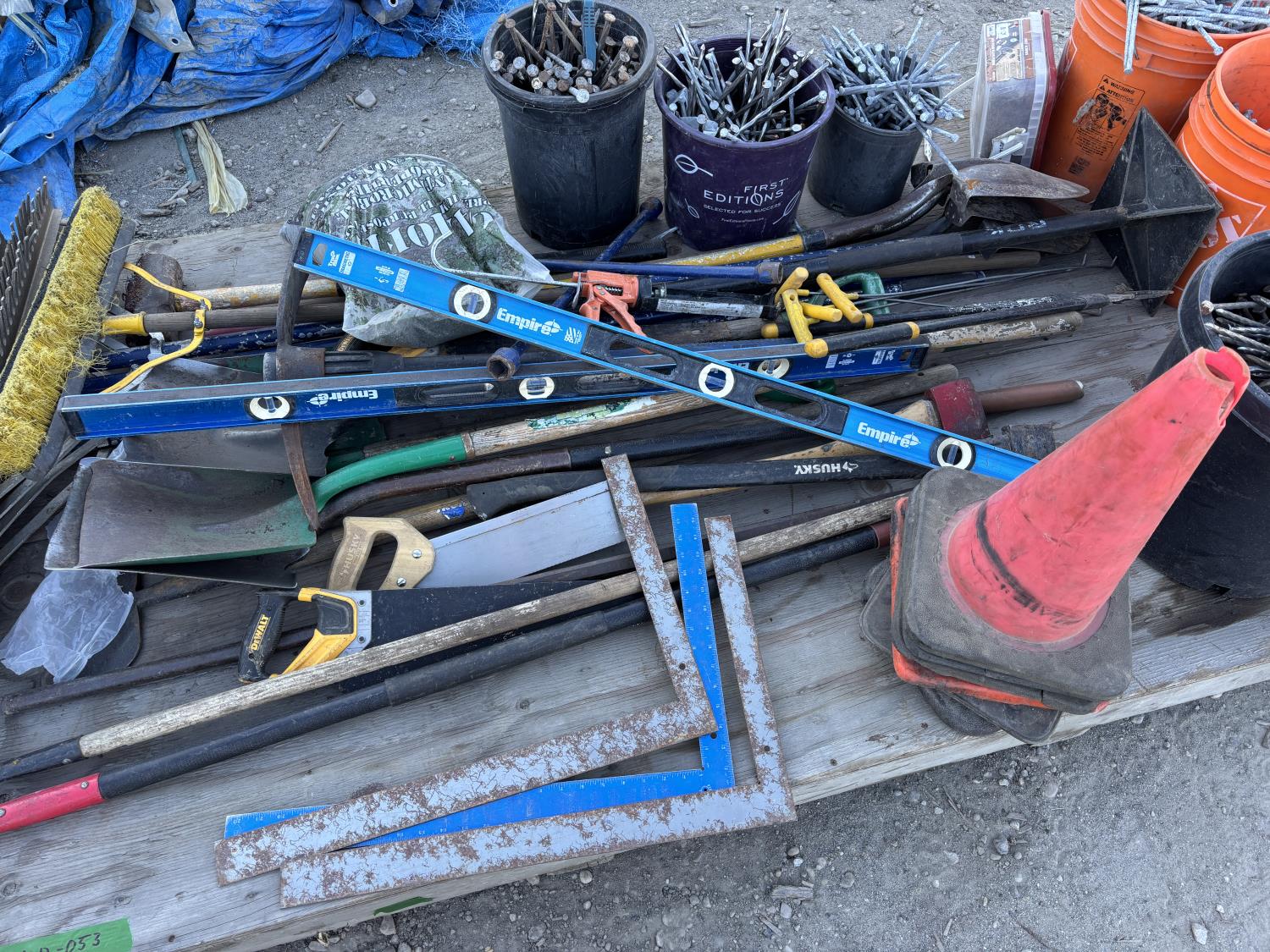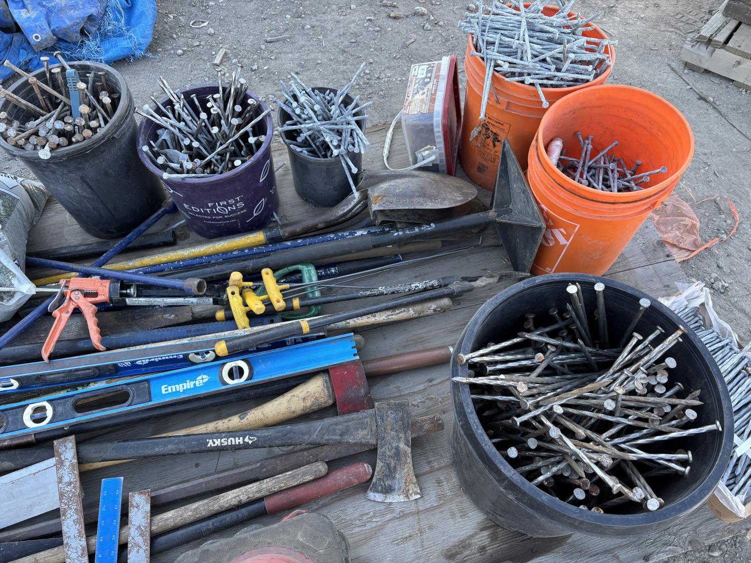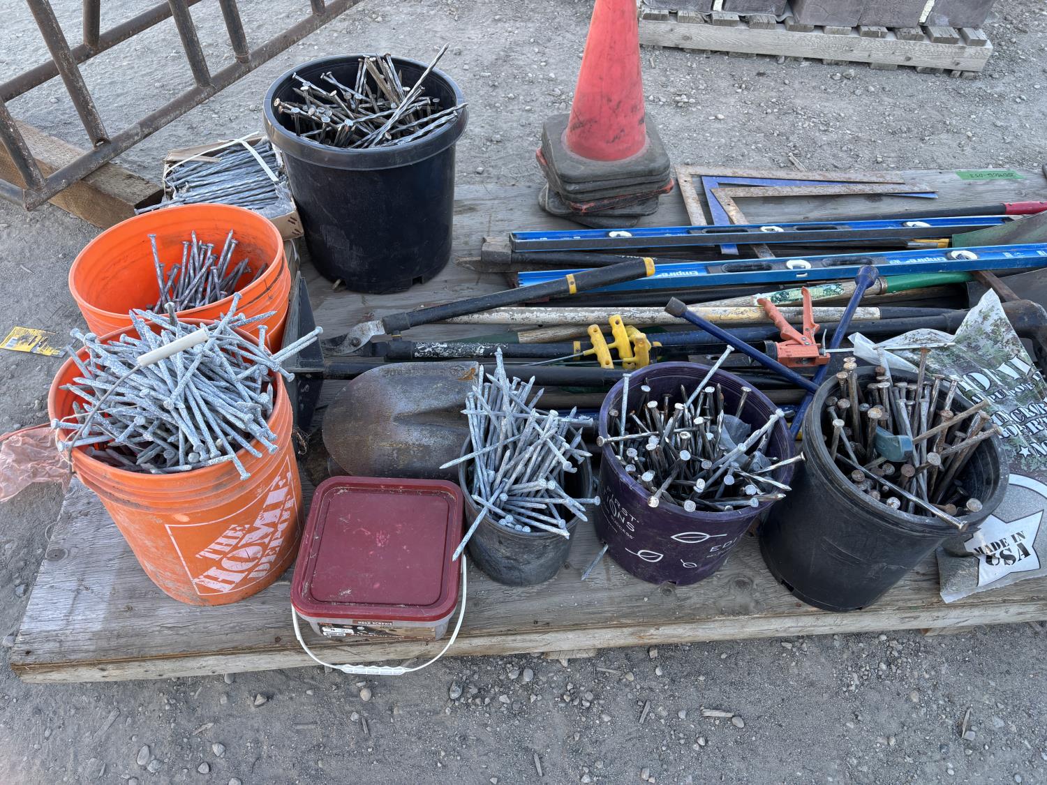 quantity of rakes, landscape rakes, shovels, axes, brooms, landscapes nails, deck screws, squares, levels, hoe, sledge hammer, bag of infill