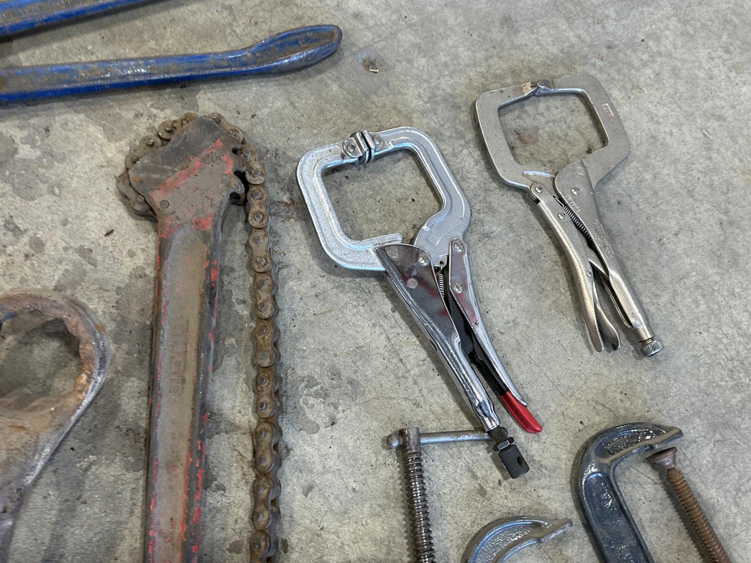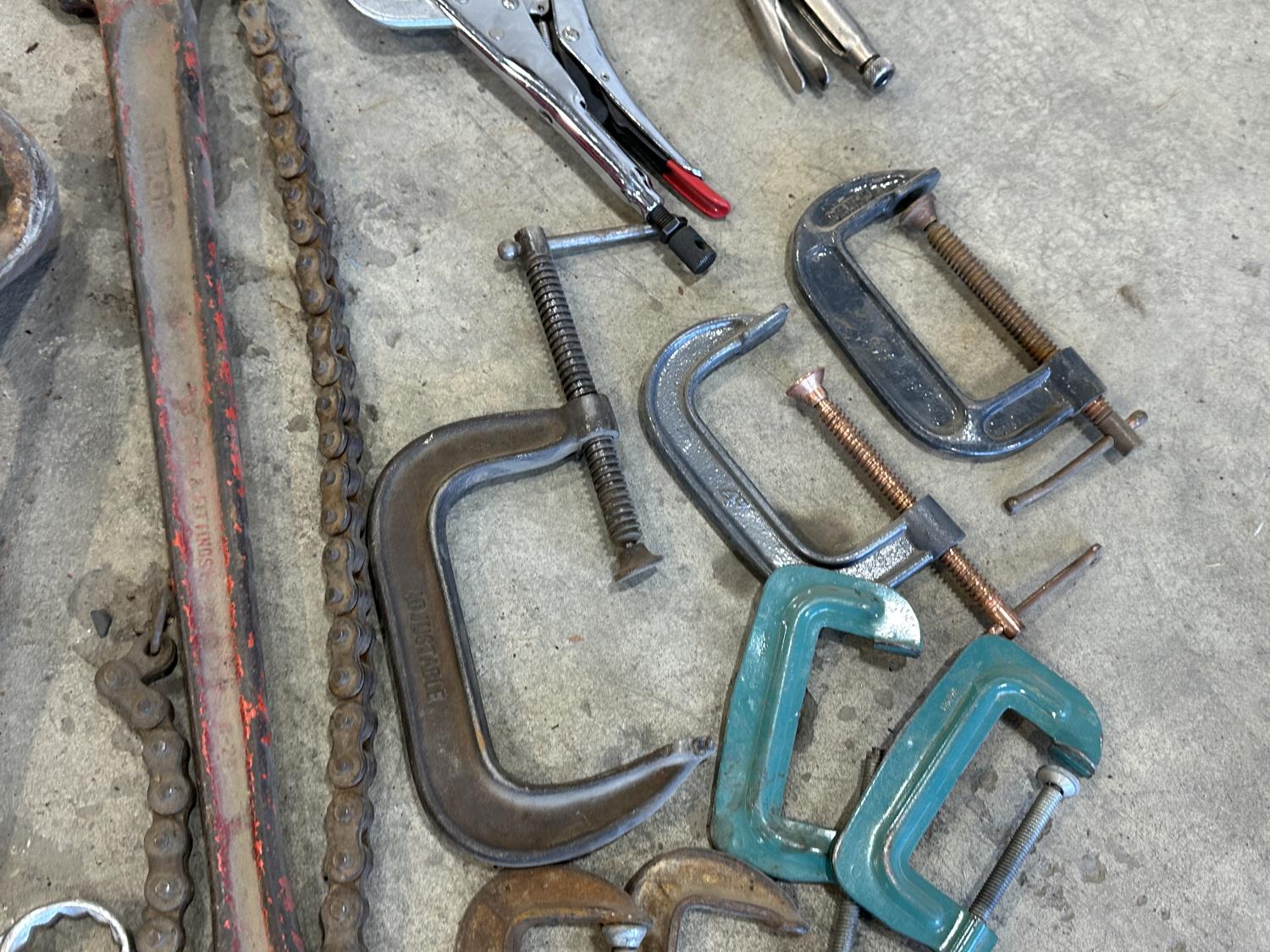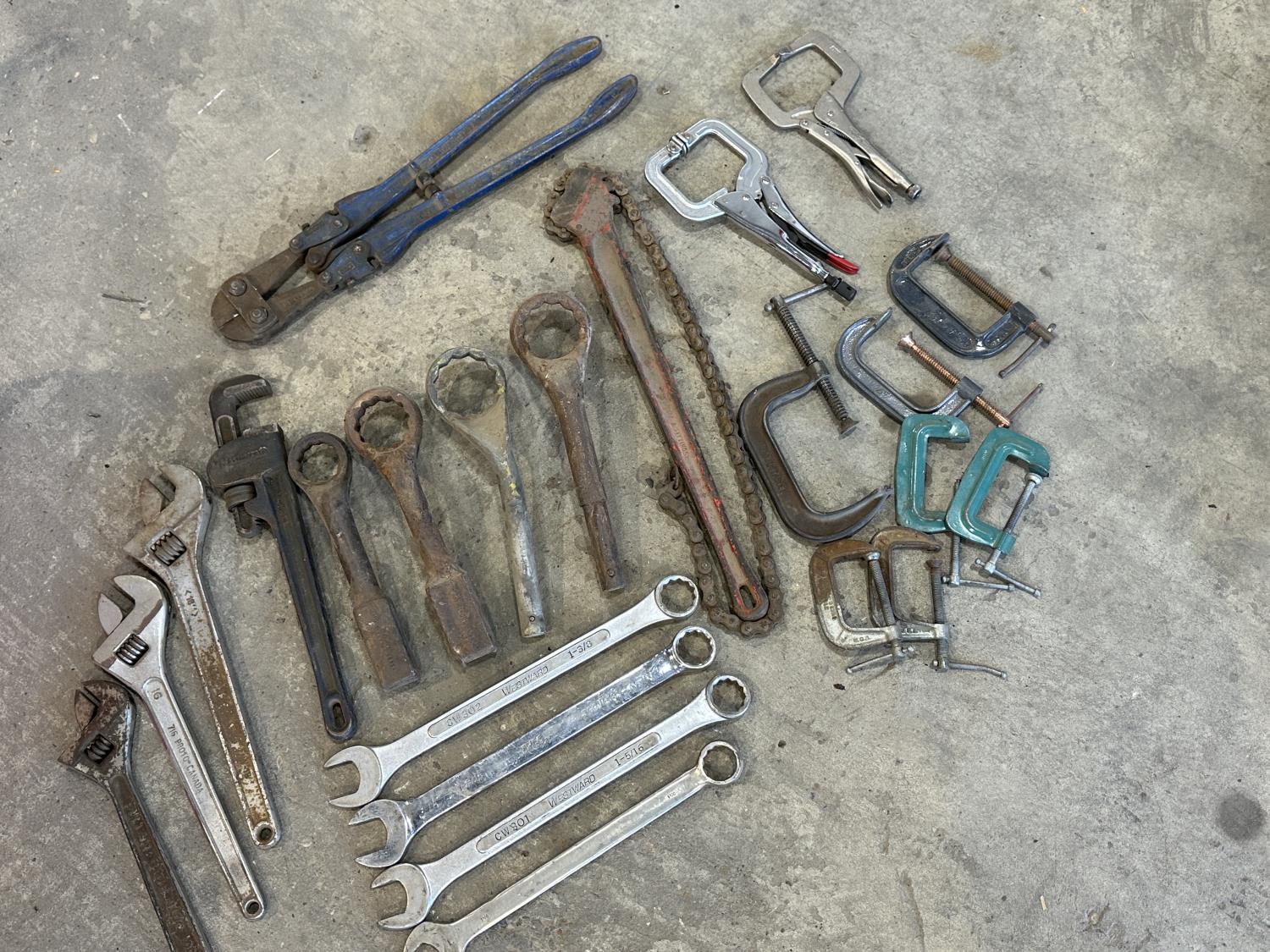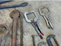 (3) crescent wrenches, Mastercraft pipe wrench, (4) hammer wrenches, (4) combination wrenches, bolt cutters, Ridgid chain pipe wrench, (7) C-clamps, (2) vise clamps