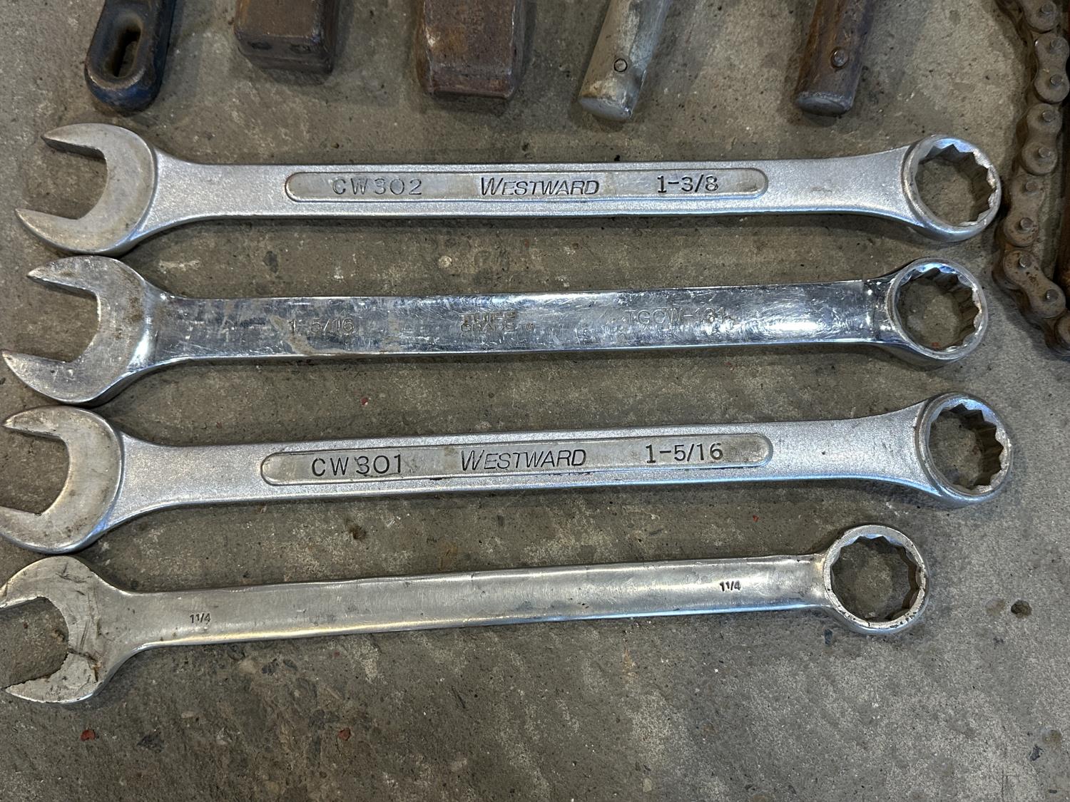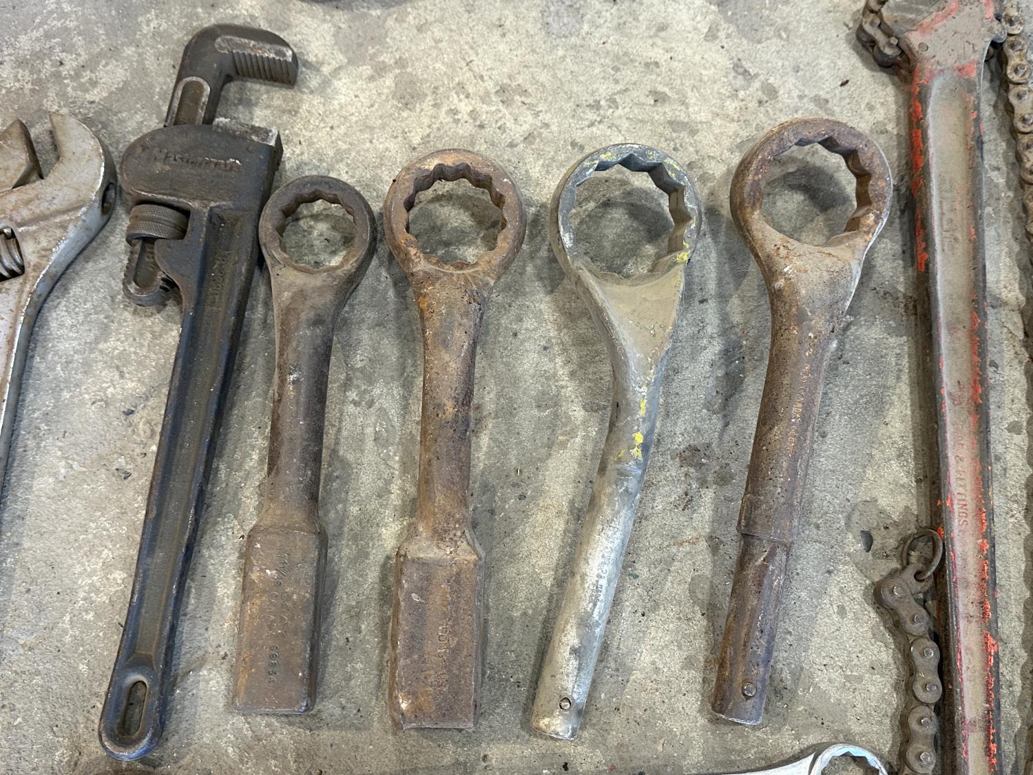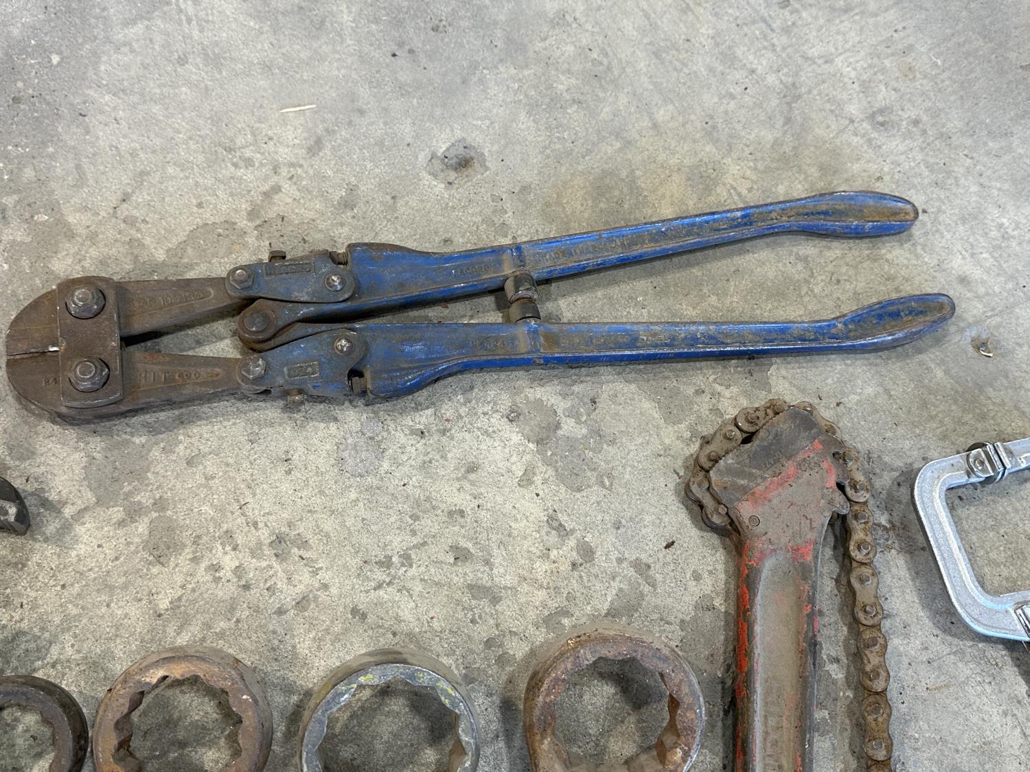 (3) crescent wrenches, Mastercraft pipe wrench, (4) hammer wrenches, (4) combination wrenches, bolt cutters, Ridgid chain pipe wrench, (7) C-clamps, (2) vise clamps