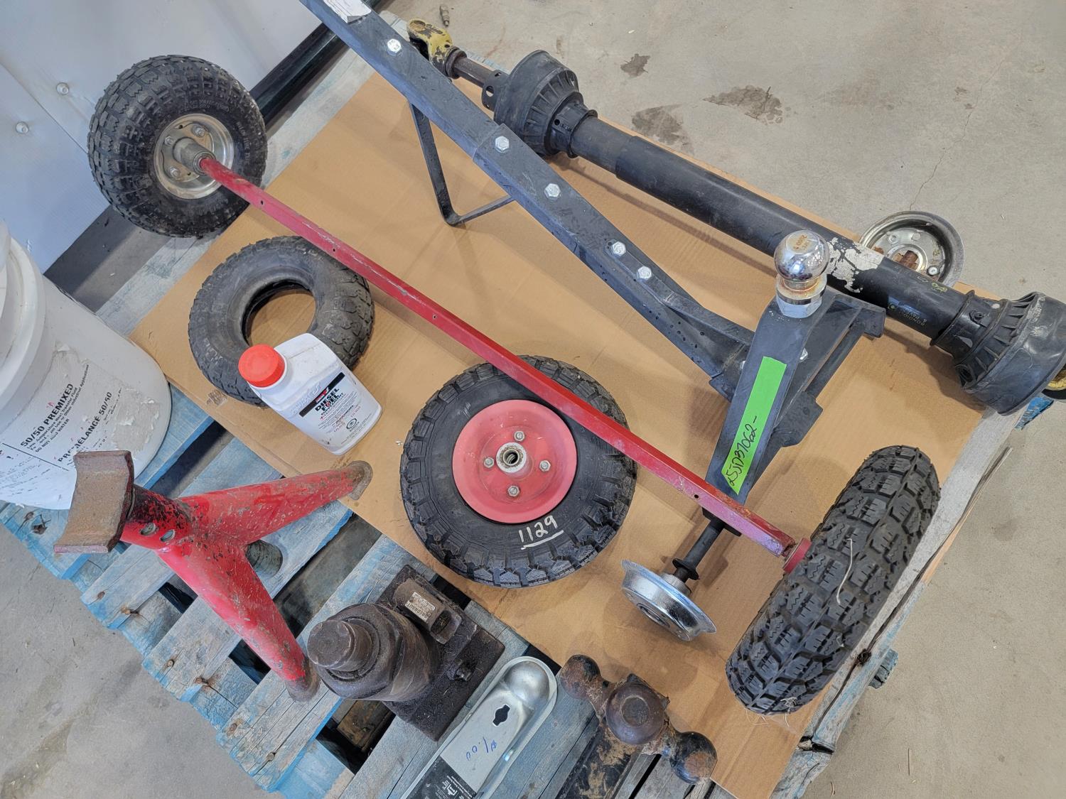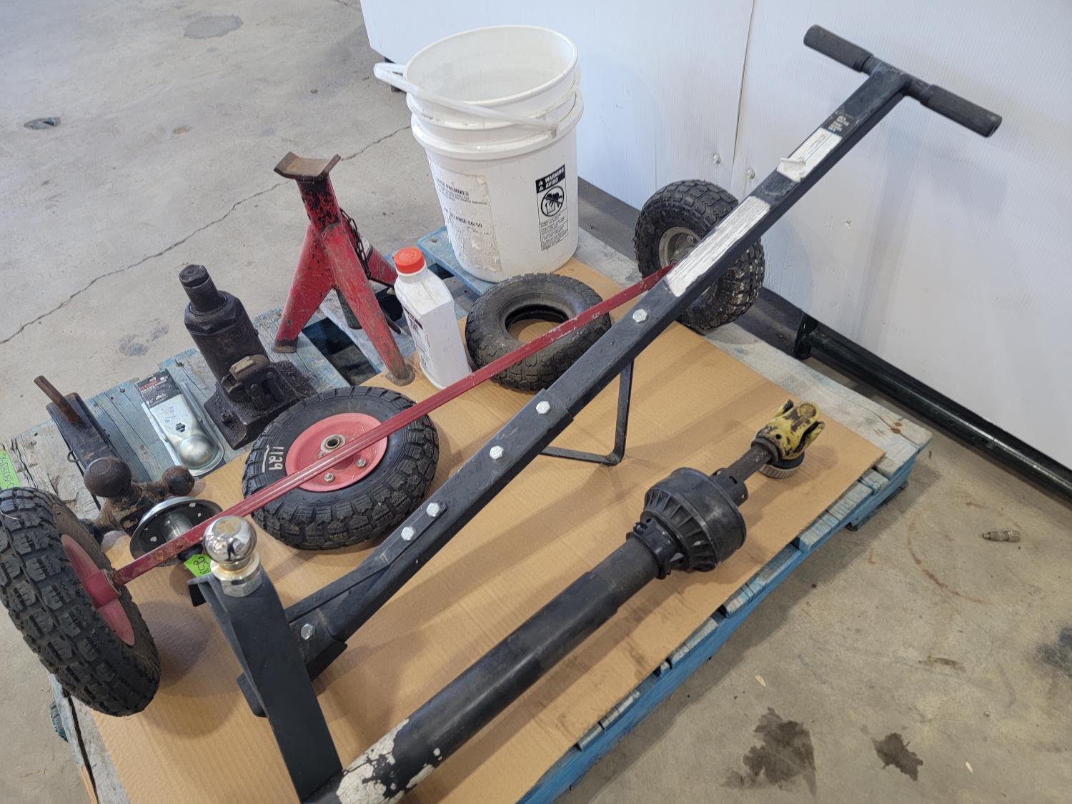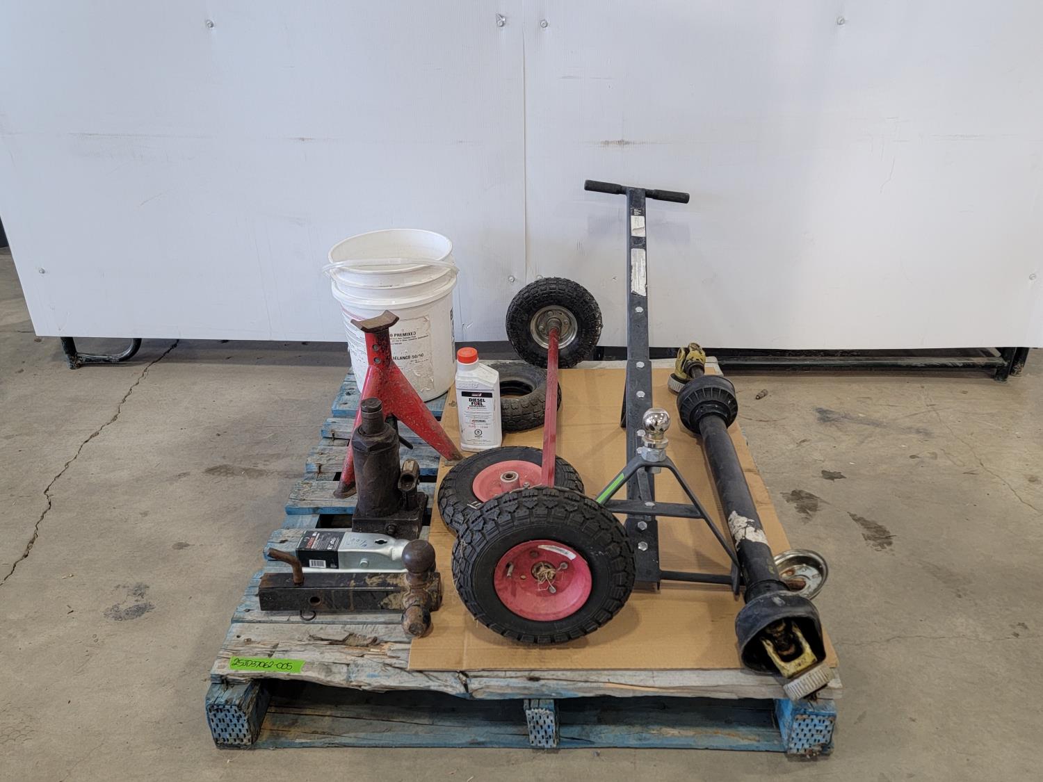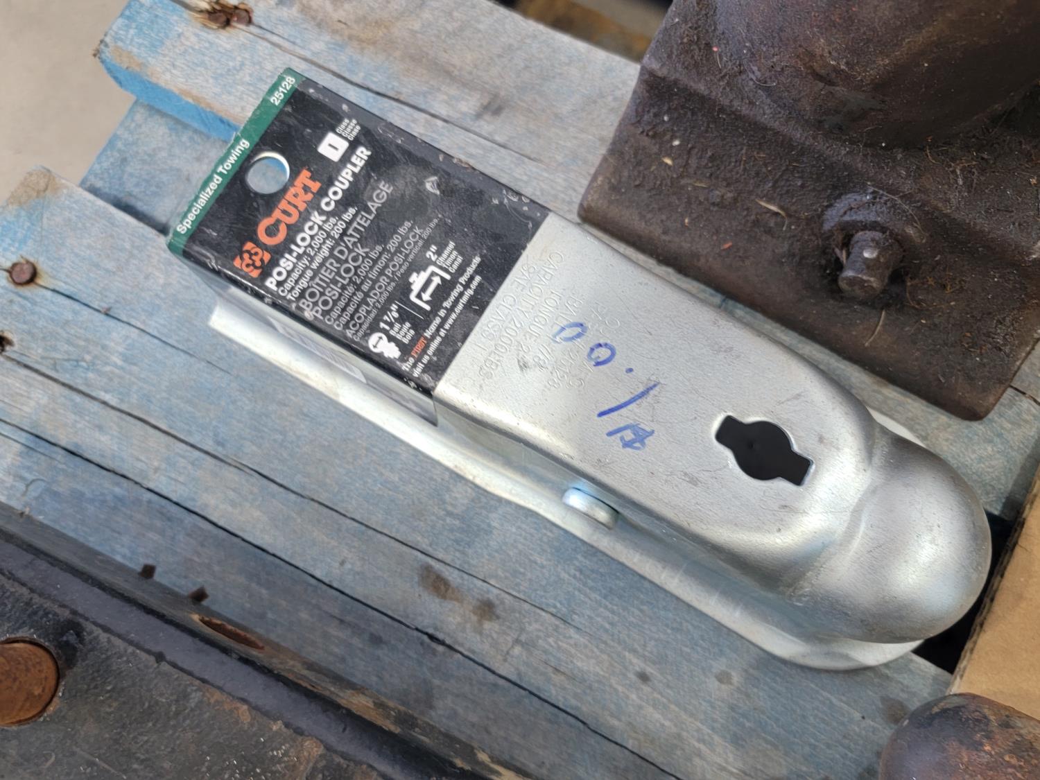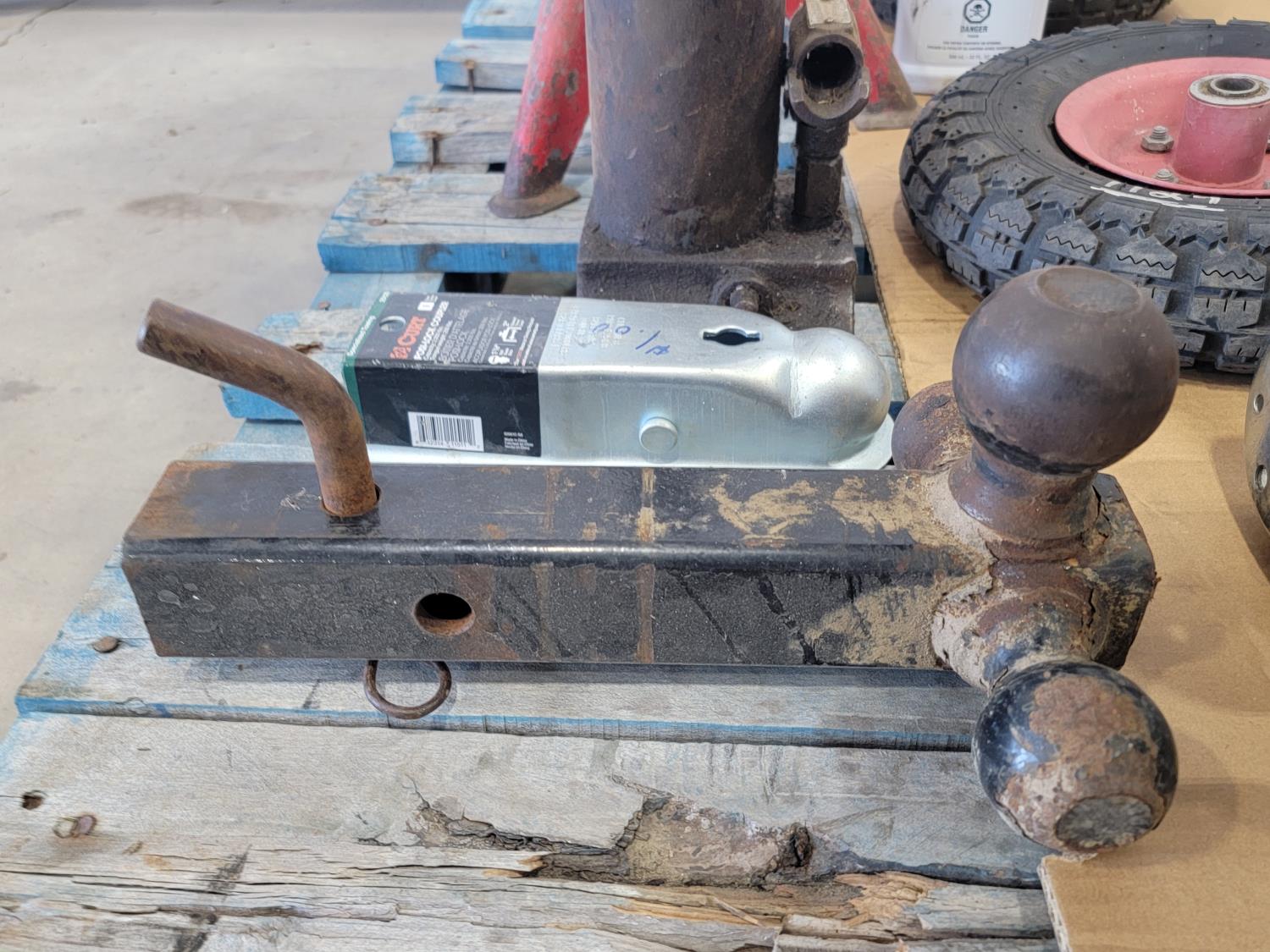 Tri-ball hitch, Curt trailer coupler, bottle jack, jack stand, chain, utility tires, trailer dolly,