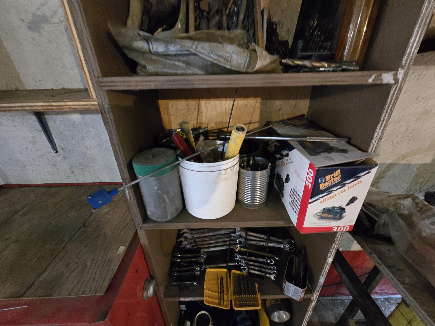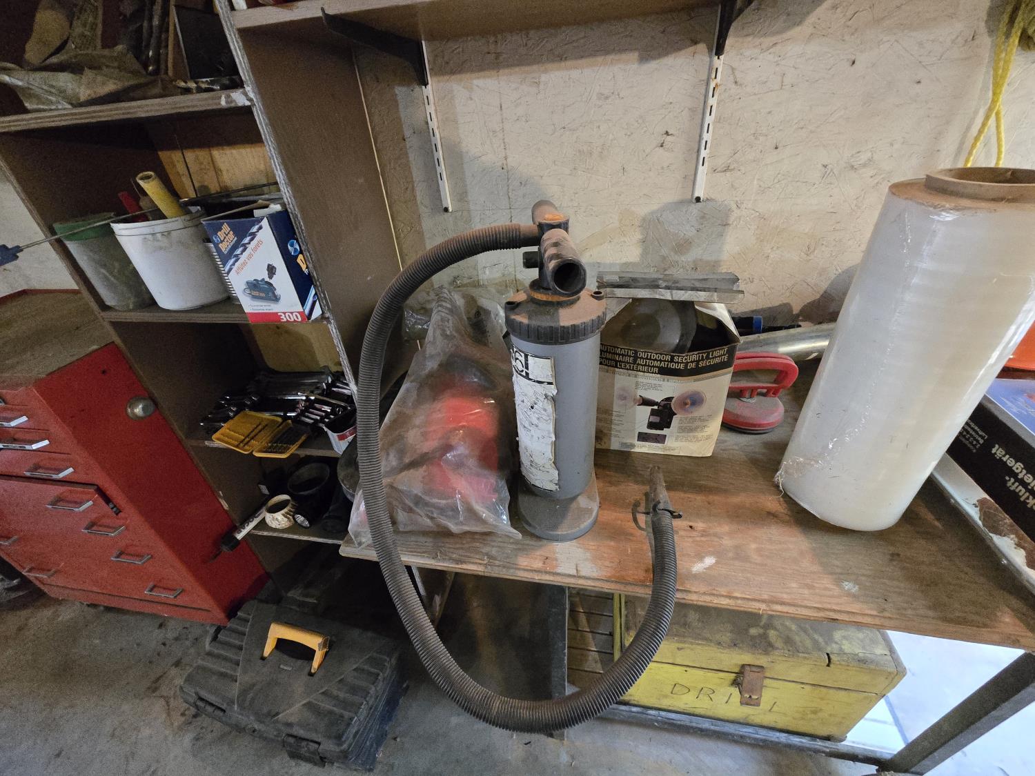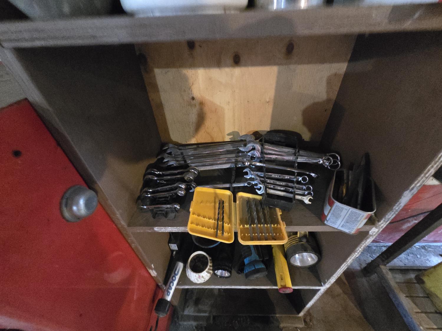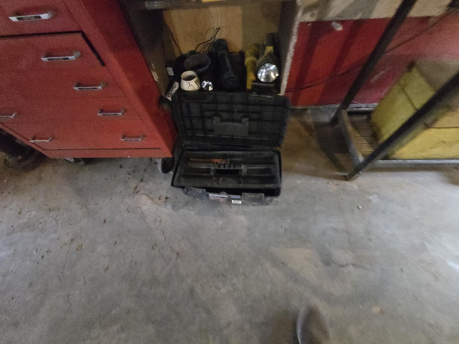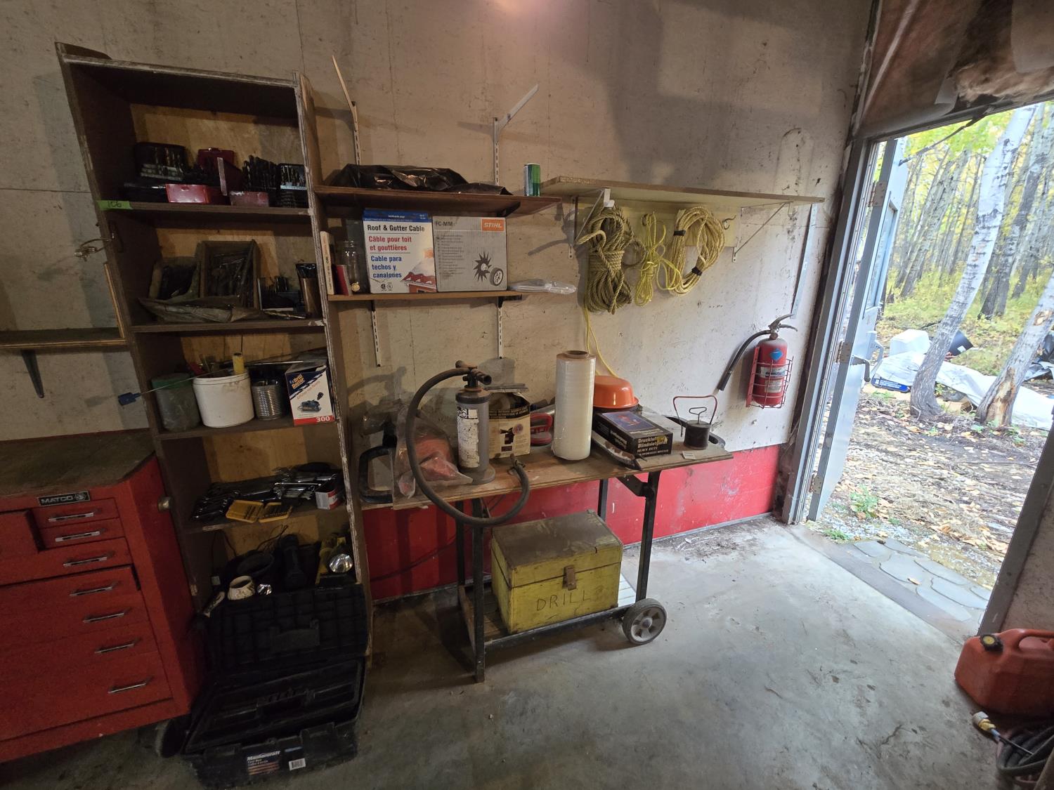 wrenches, drill bits, flashlights, hand pump, riveter gun, rope, Stihl FC-mm edger, miscellaneous items