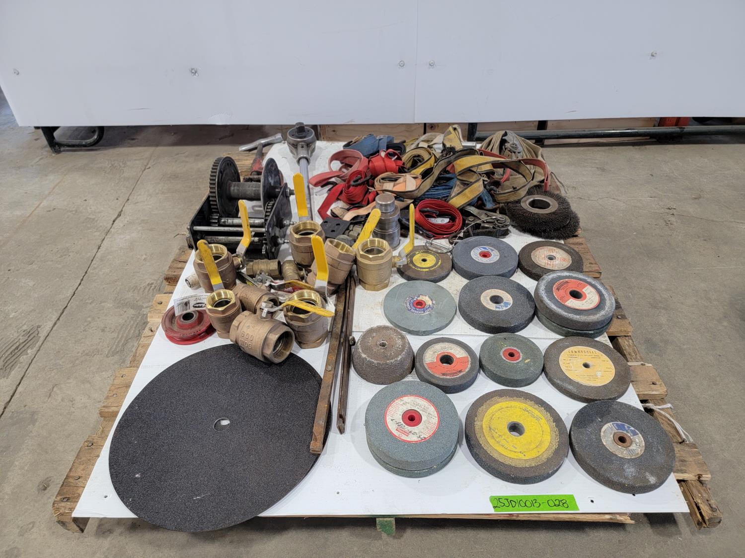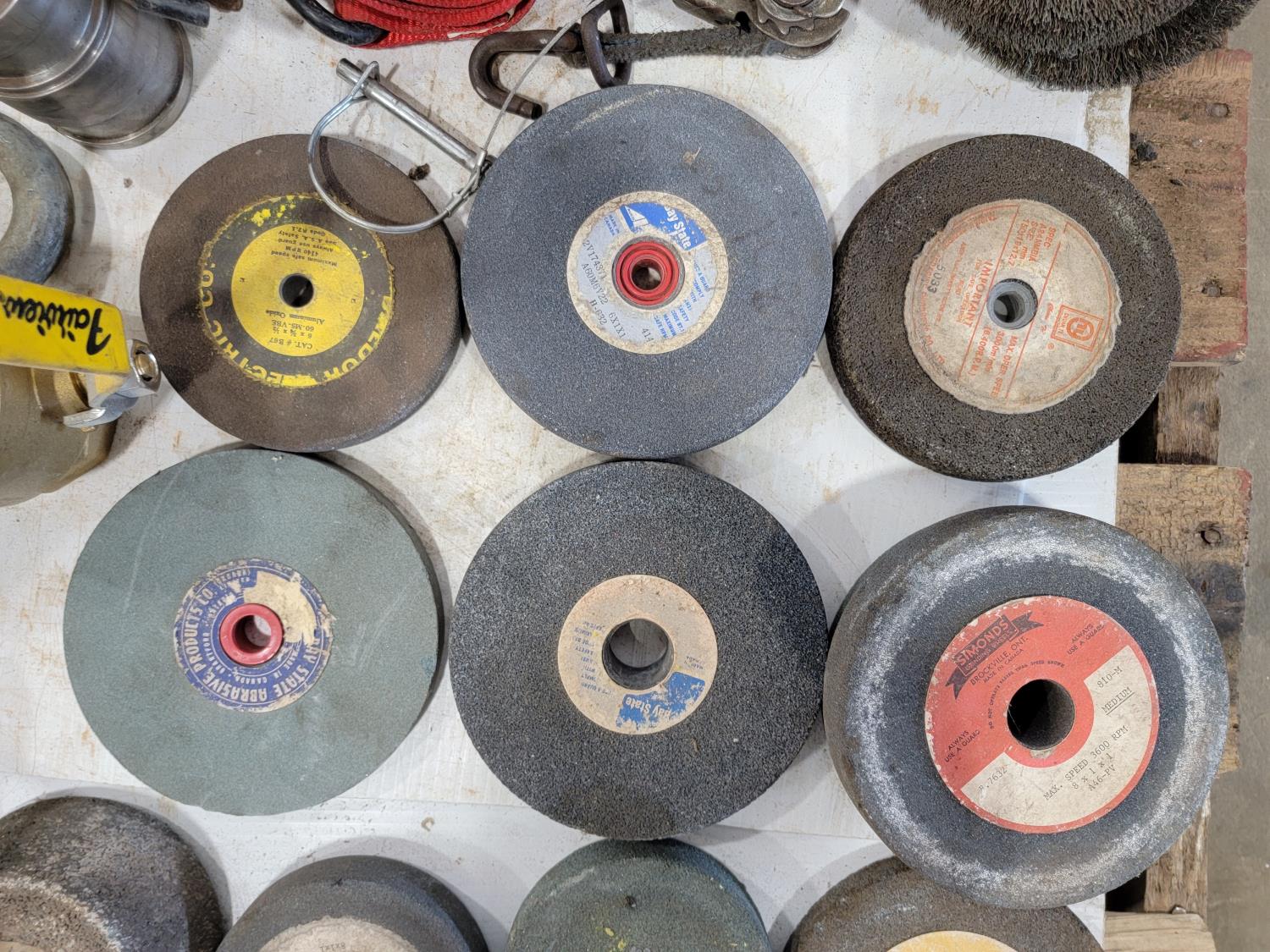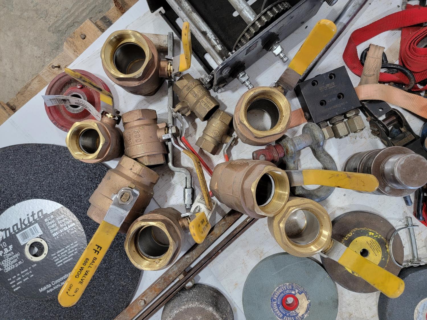 Bench grinding wheels, (2) cut off wheels, ratchet straps, ball valves, pipe cutter