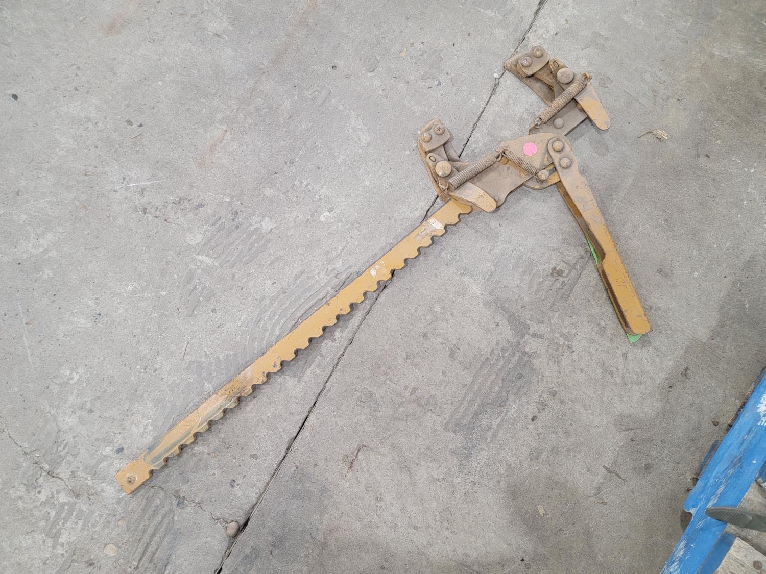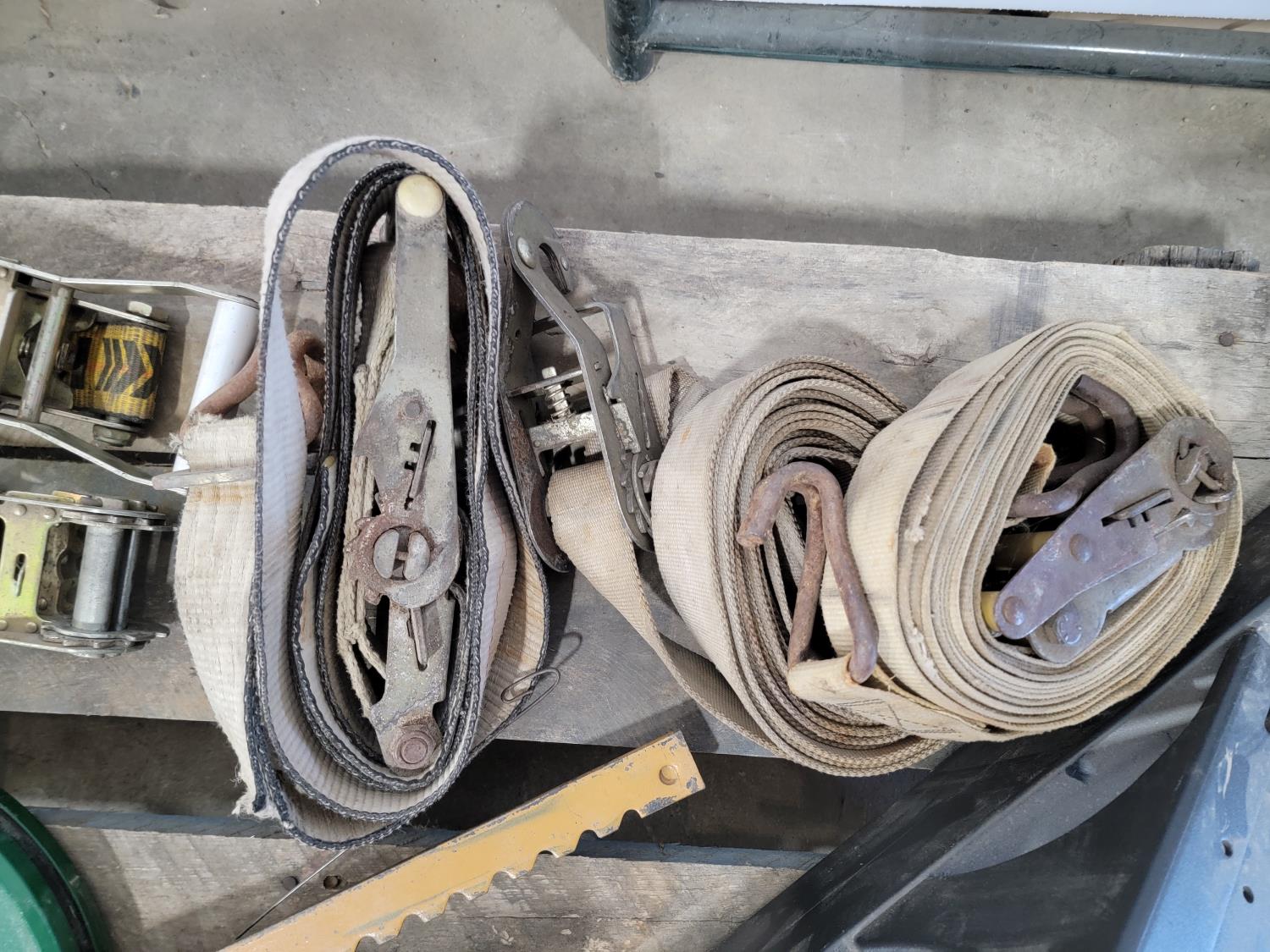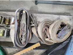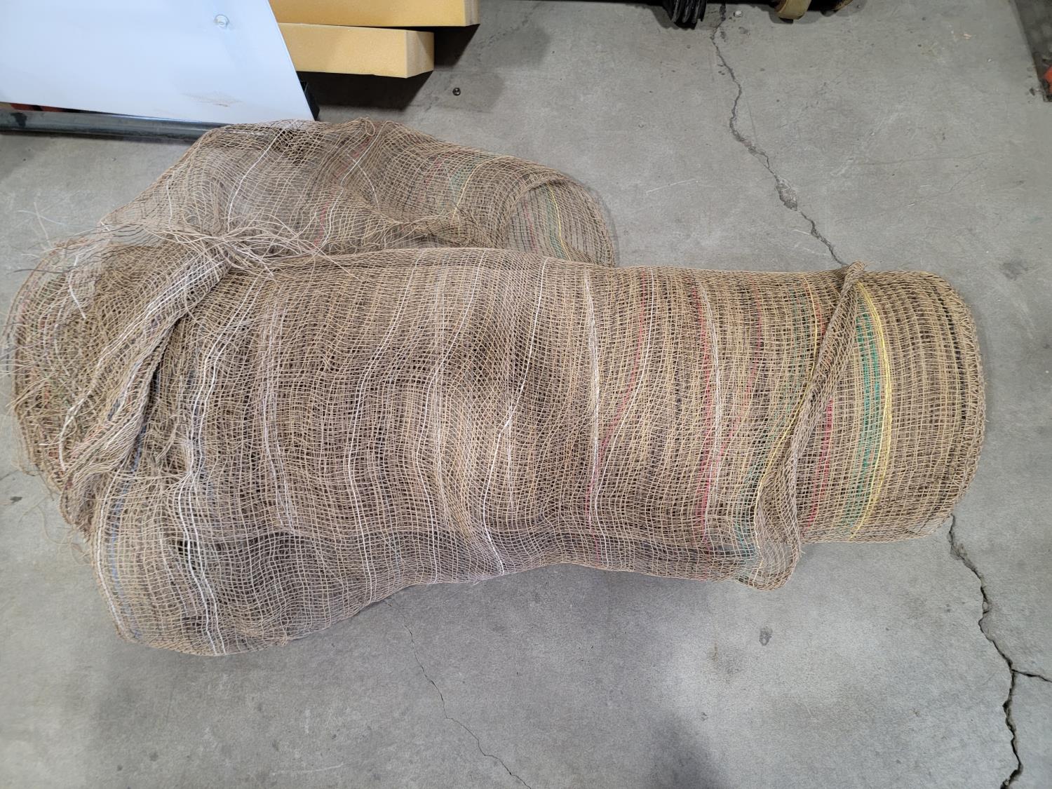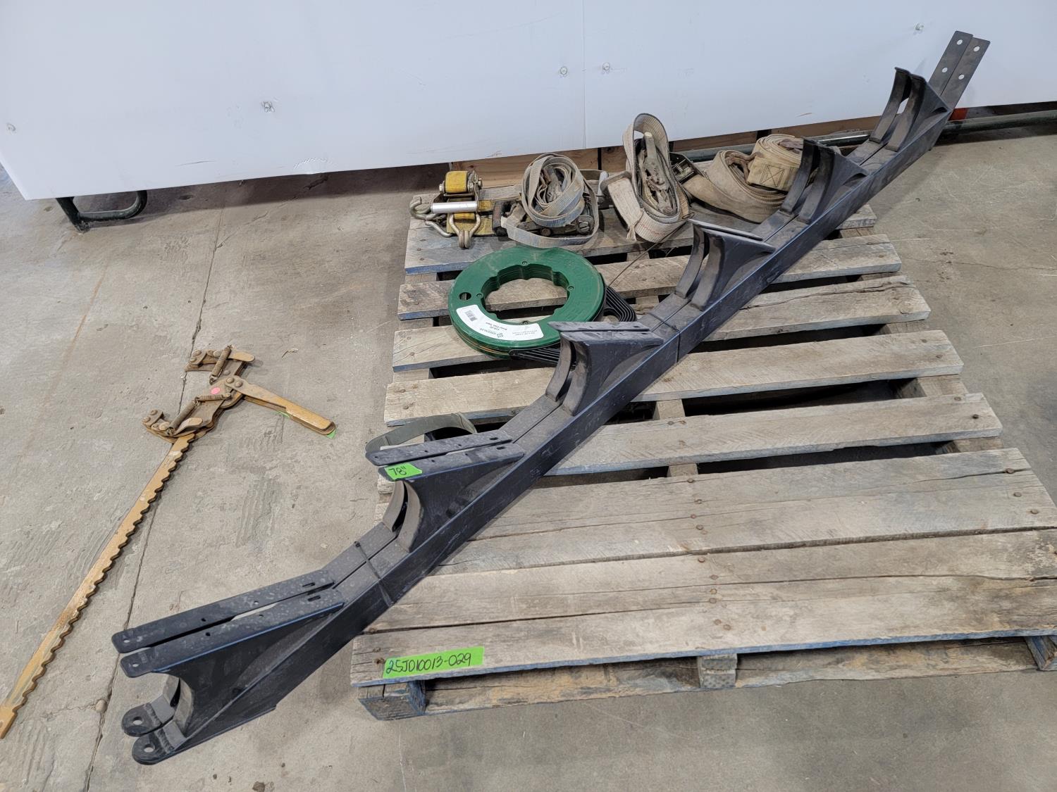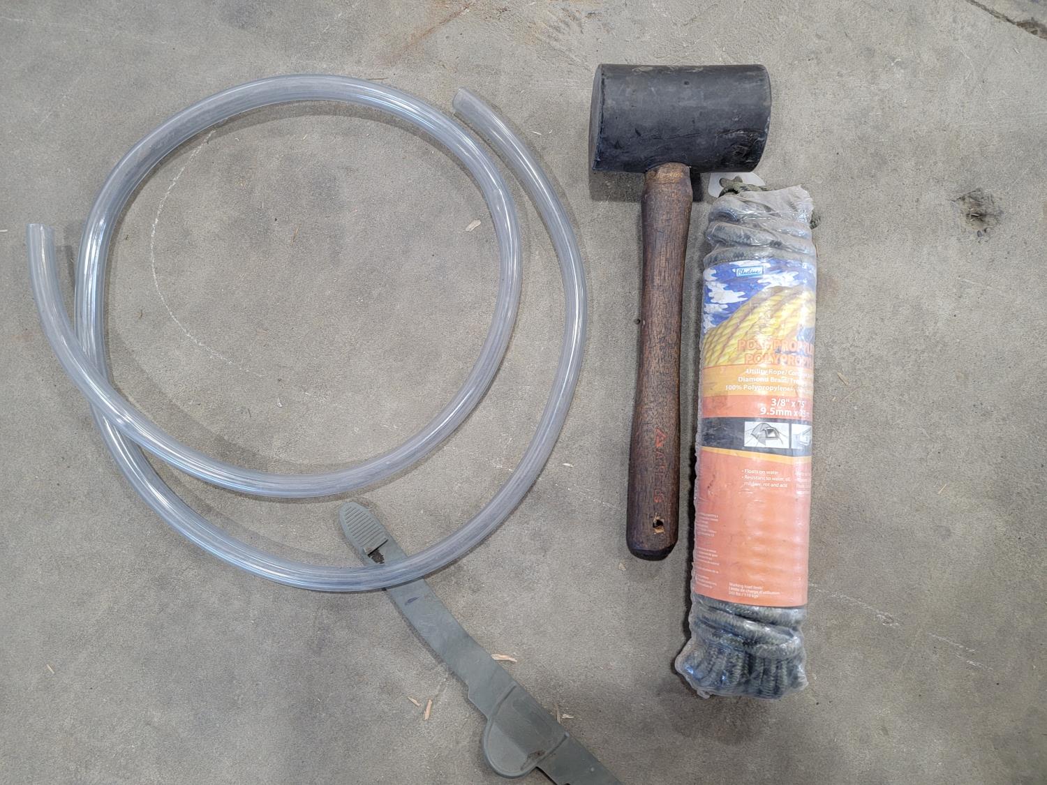 Tarp, fence stretcher, ratchets straps, steel fish tape, rubber mallet, utility rope, (2) 78 inch stair stringers, roll of burlap fabric