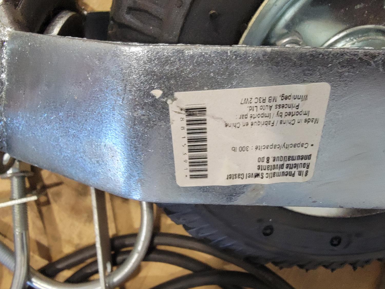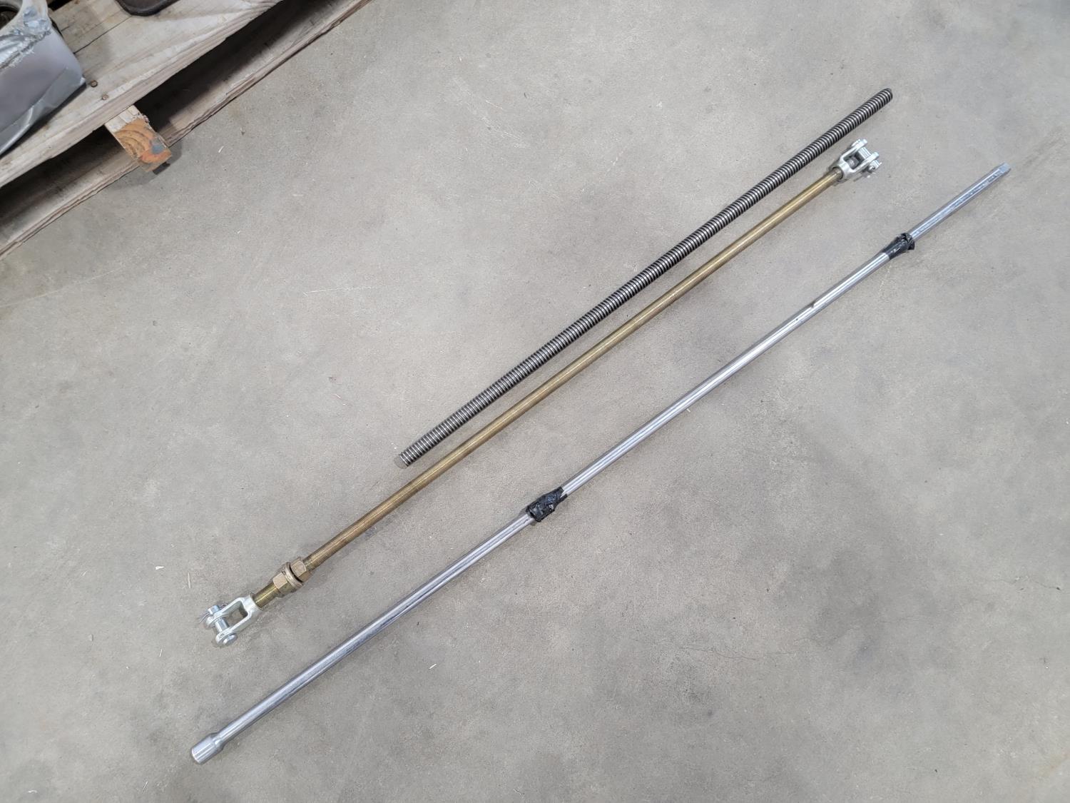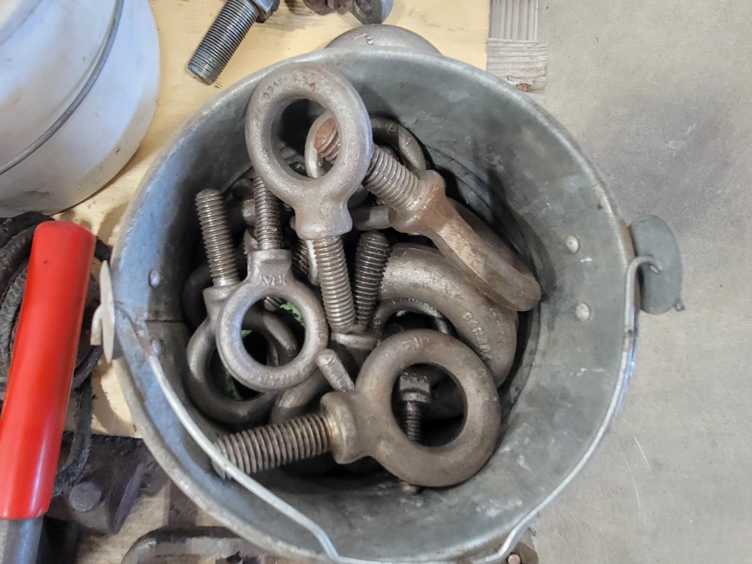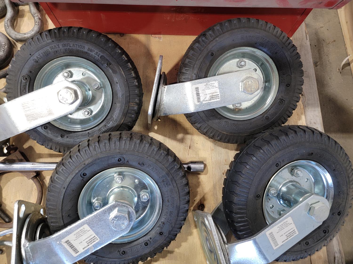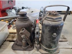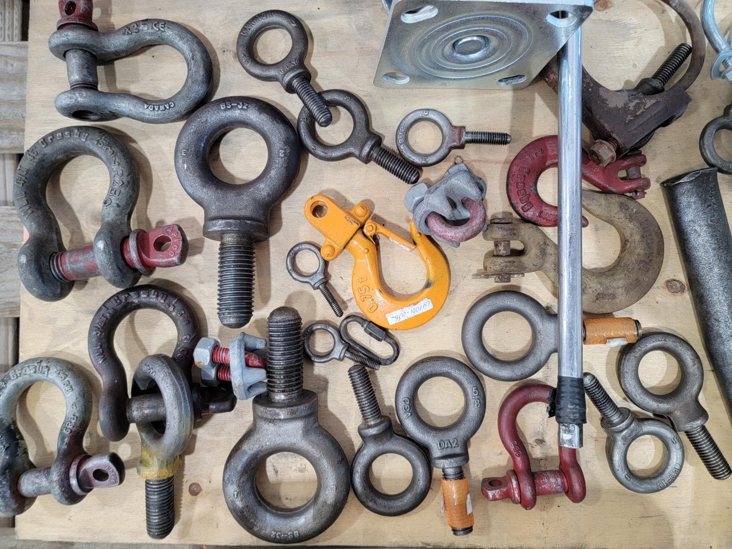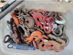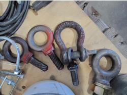 (2) bottle jacks, shackles, eye bolts, extension cords, (4) 8 inch swivel casters, slip hooks,