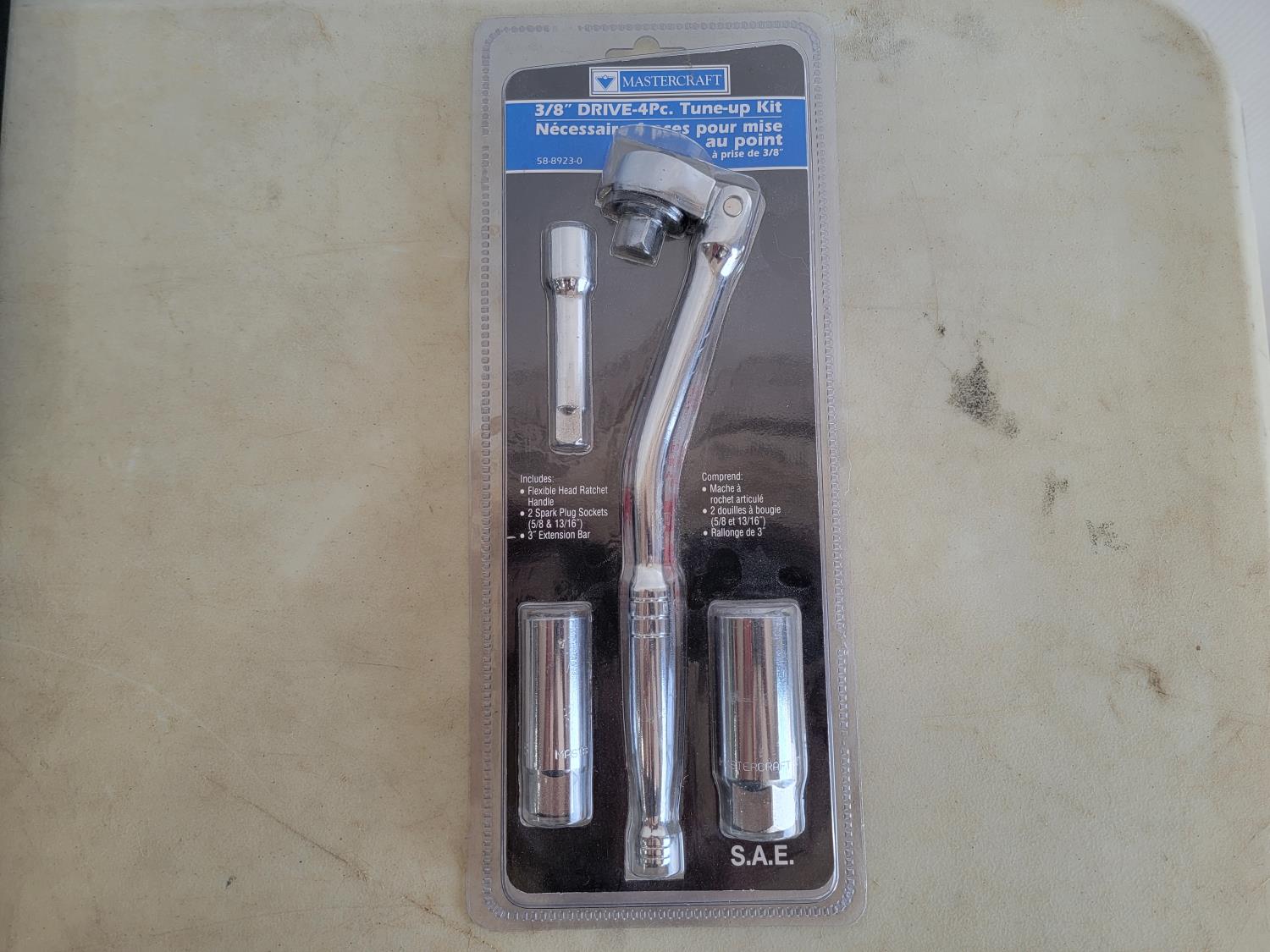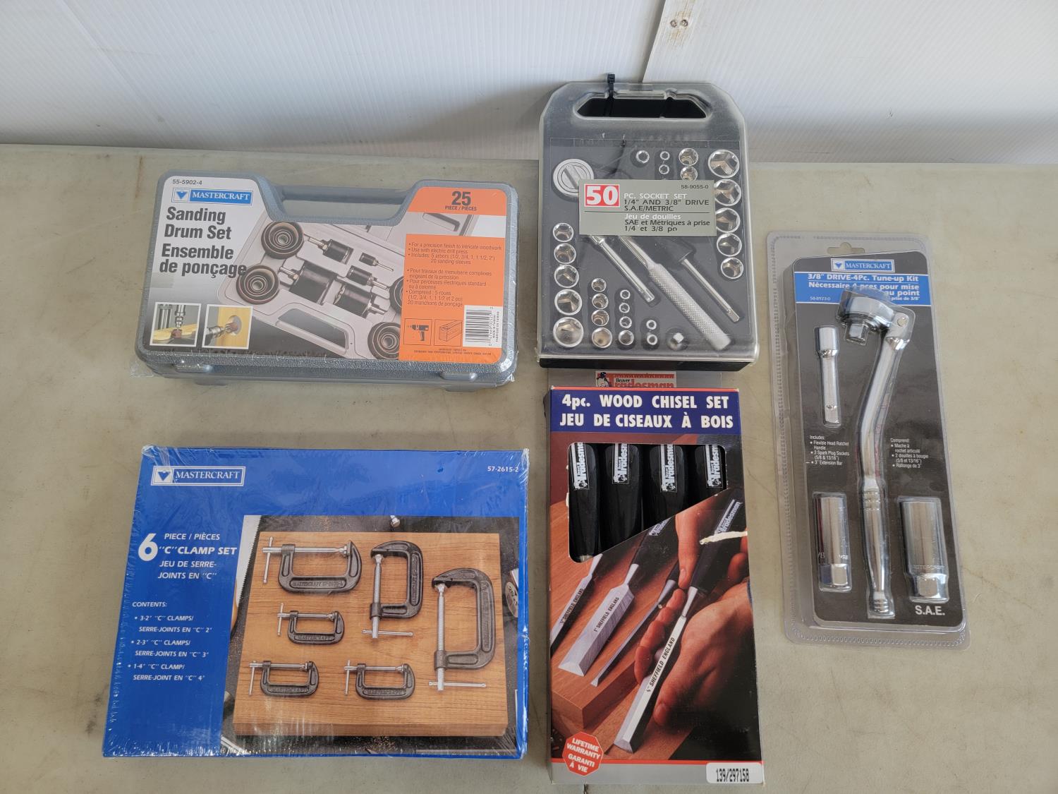 Mastercraft 3/8 inch drive tune-up kit, 50 piece socket set, 4 piece wood chisel set, 6 piece C-clamp set, Mastercraft sanding drum set