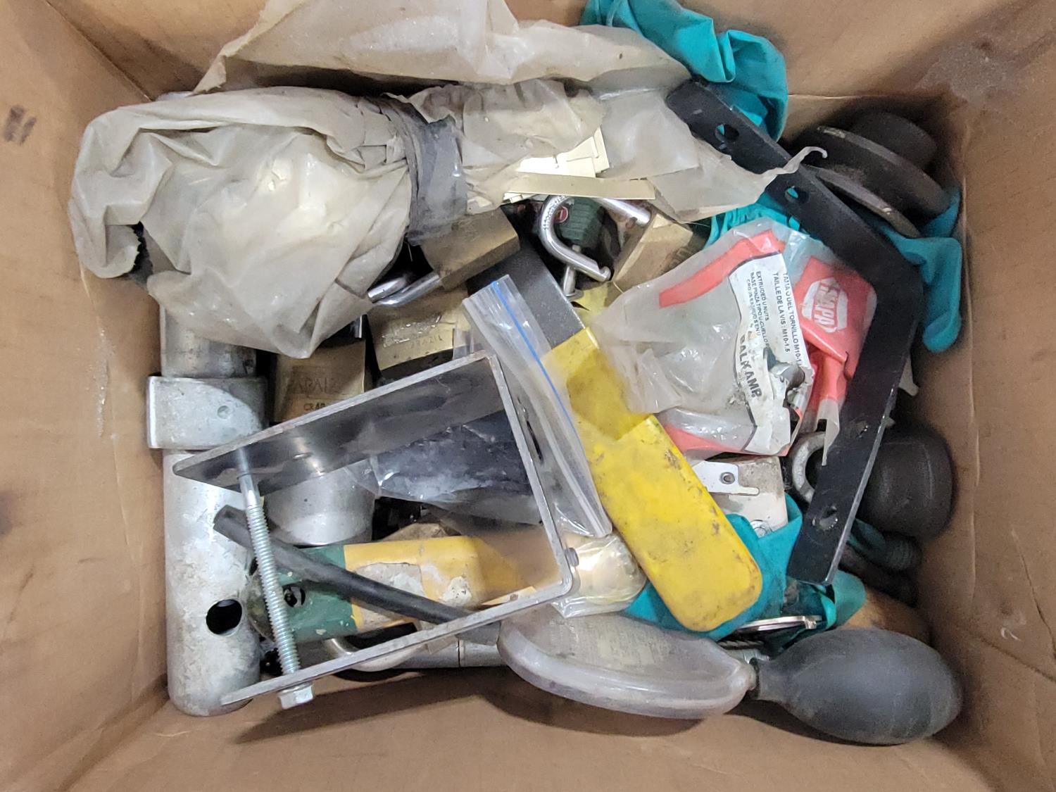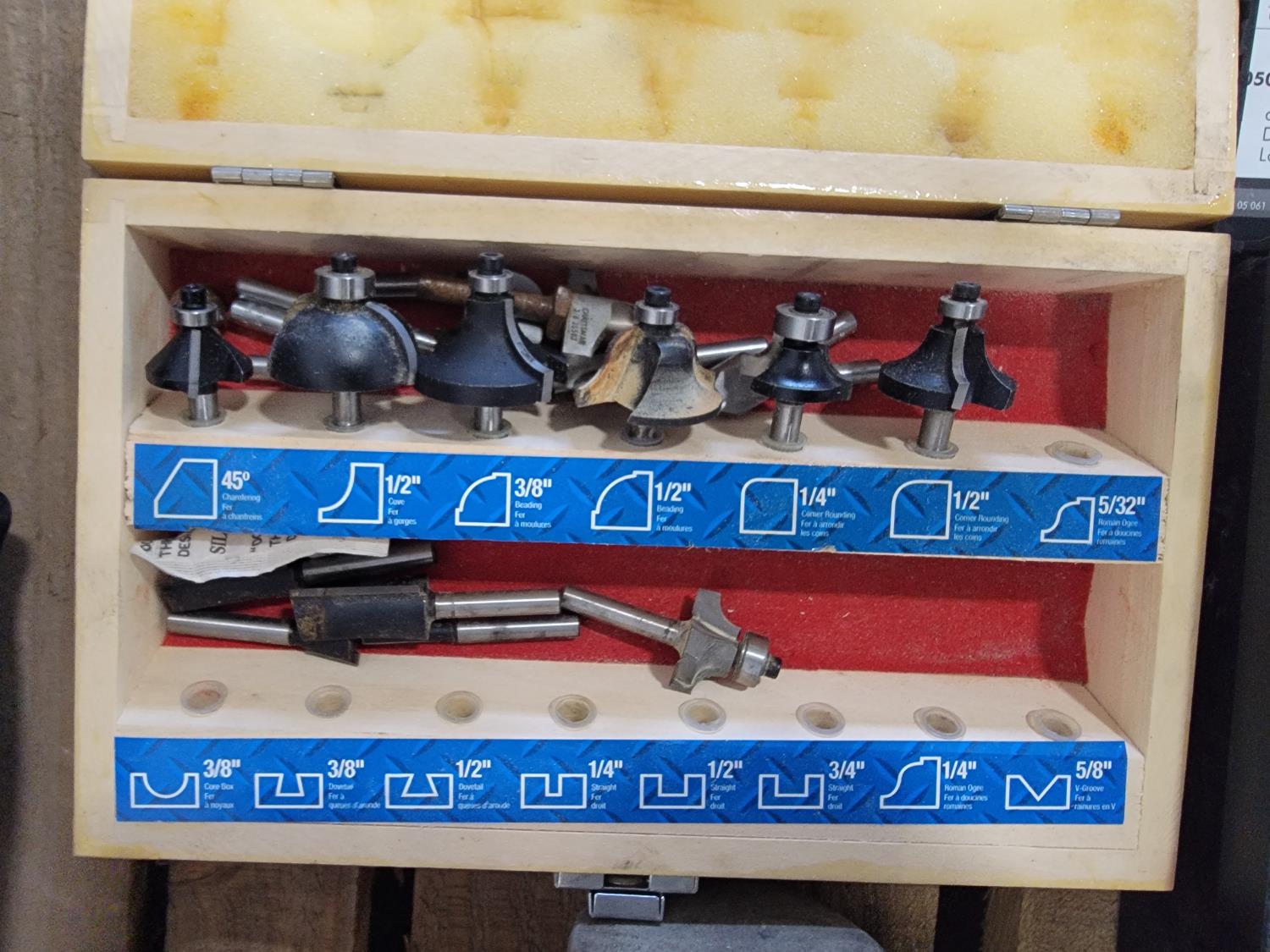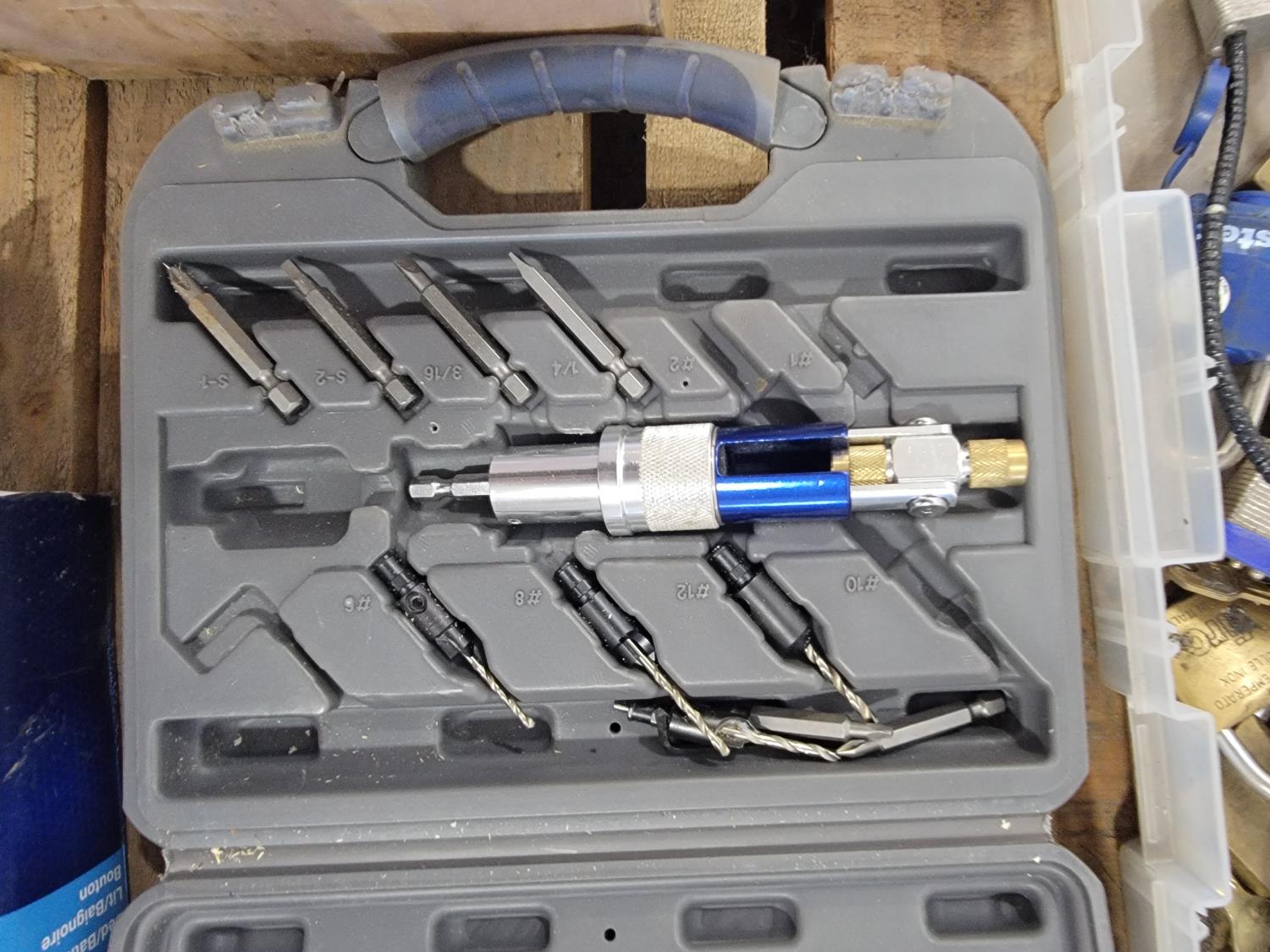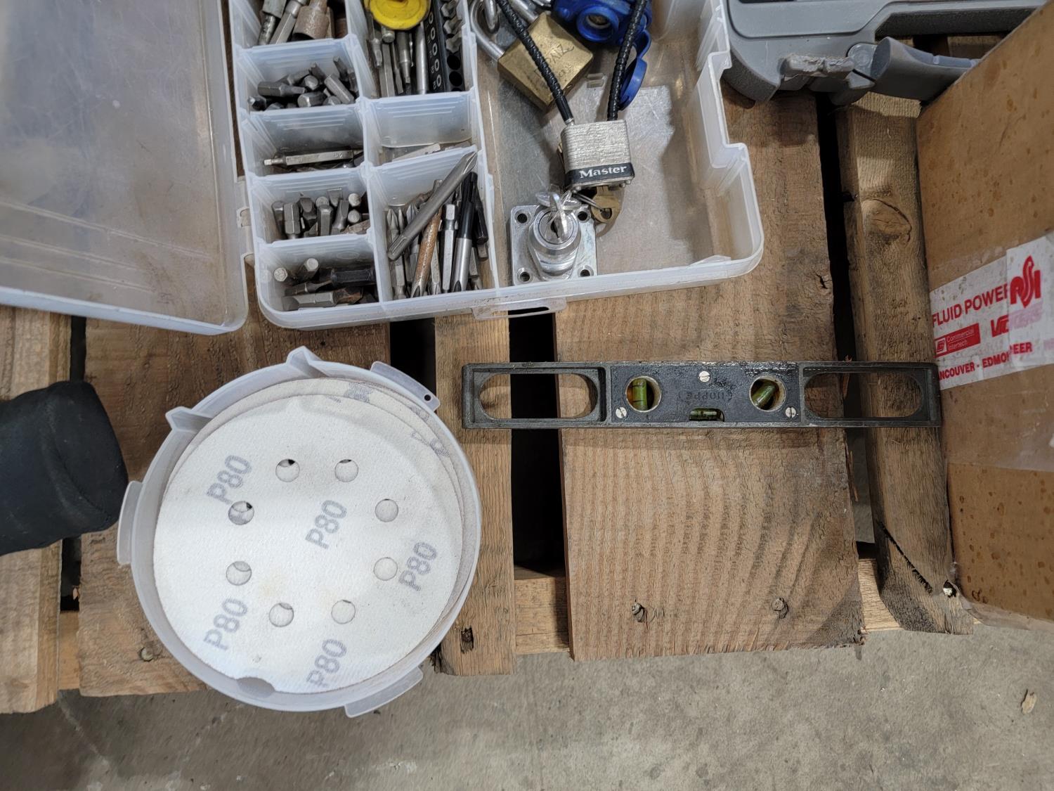 Electrical supplies, lock washers, router bits, Craftsman router, locks, DeWalt random orbit palm sander, corded rotary tool