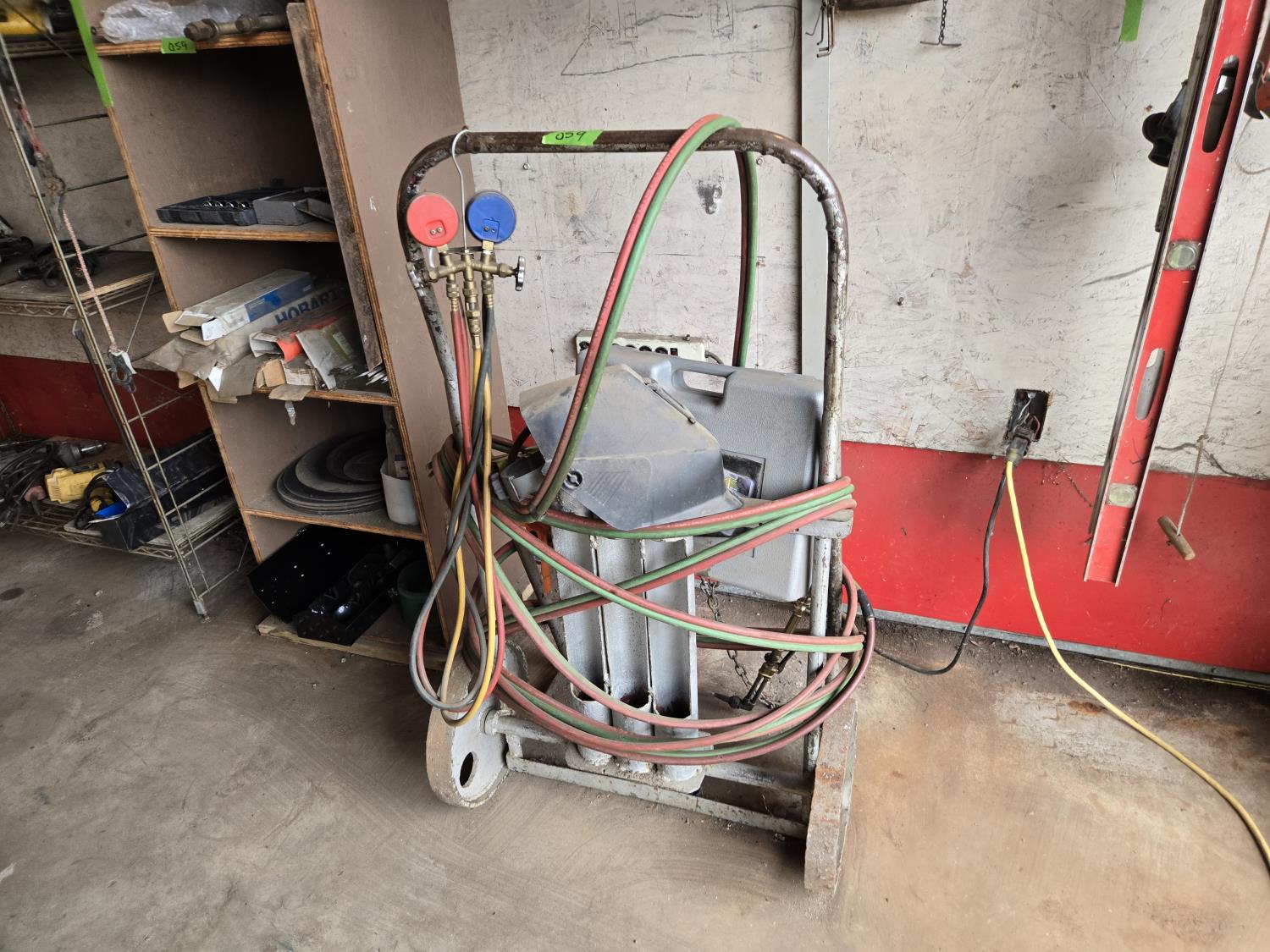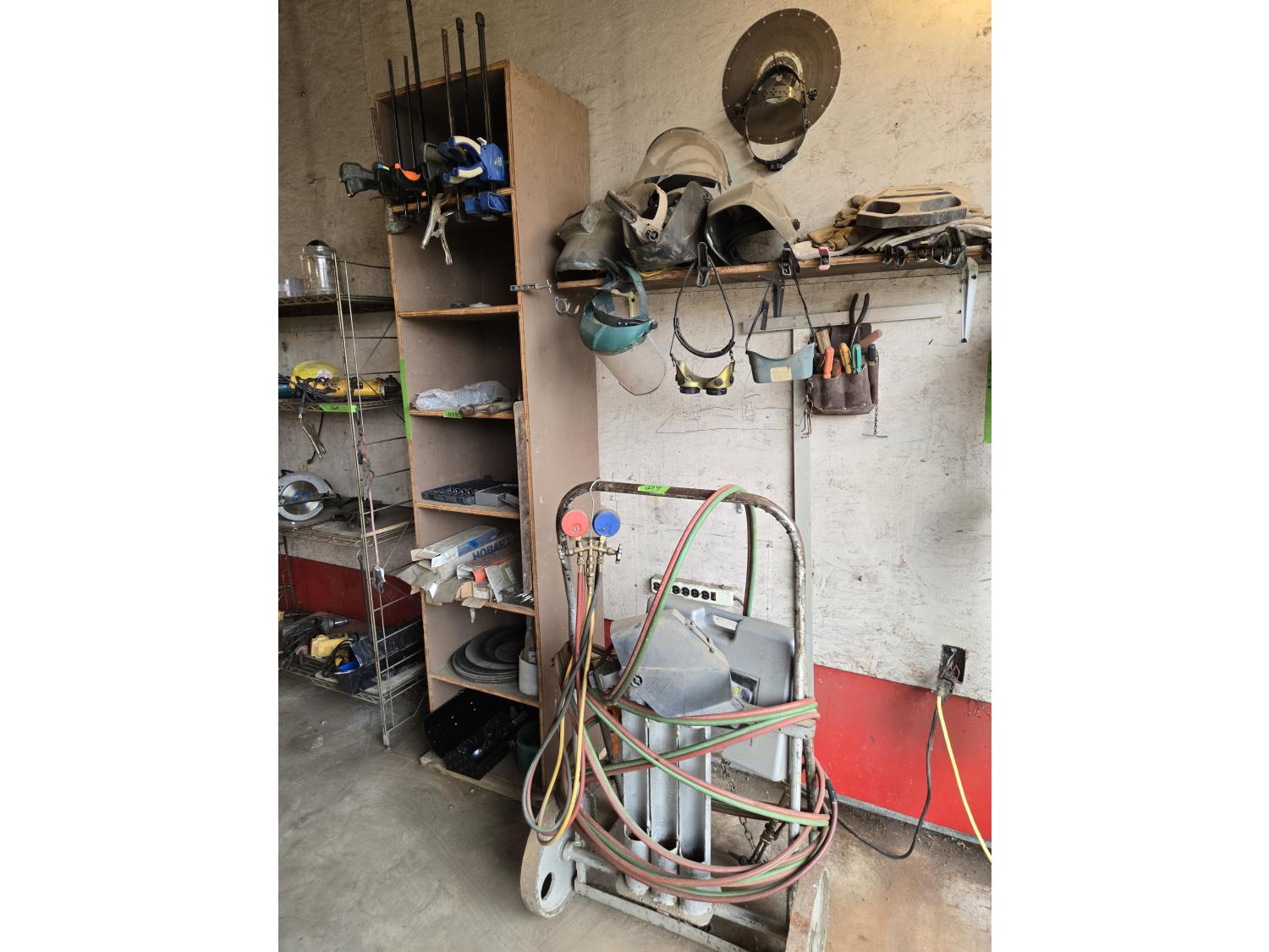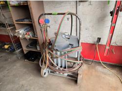 cart with torch, AC gauges, rods, grinding discs, clamps, miscellaneous items