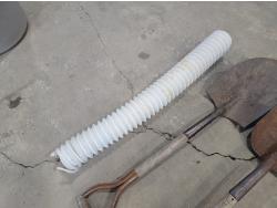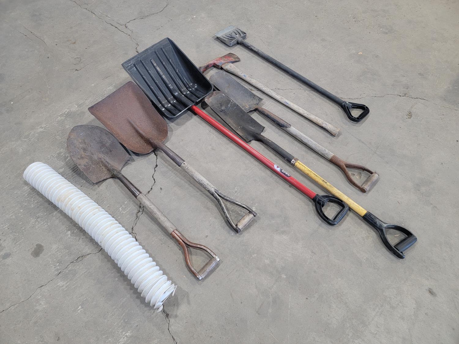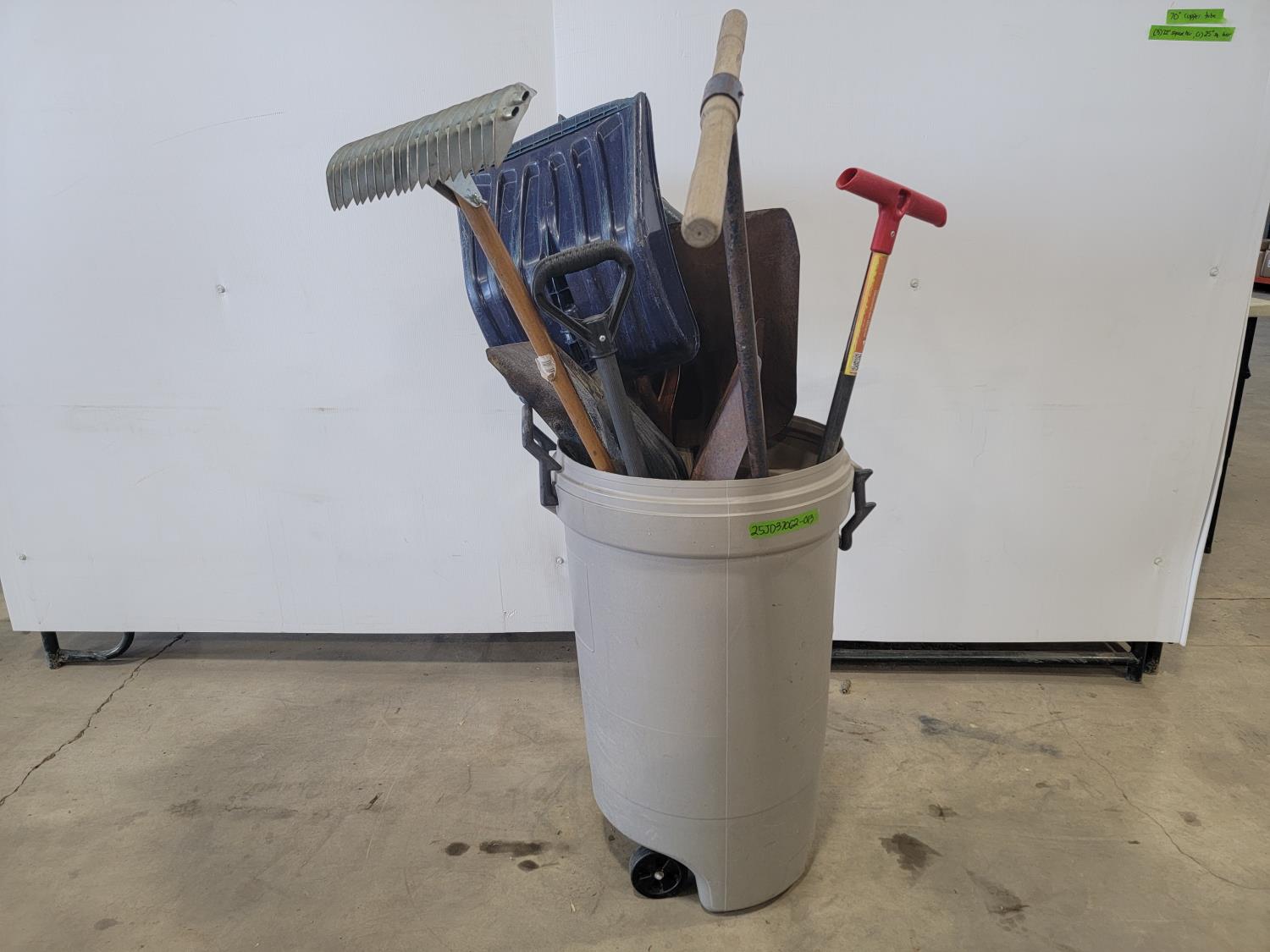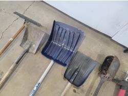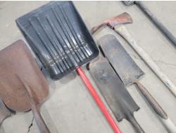 Shovels, rake, post hole digger, scraper, pulaski, garbage can