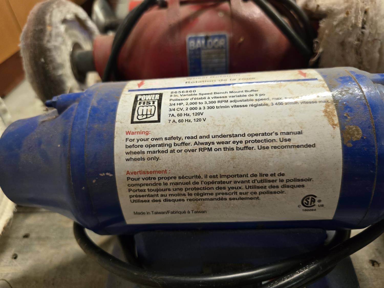 (1) Power Fist, 3/4 HP, 7A, 120 V, (1) Baldor, 1/3 HP, 4A, 115V, (1) Force International, 3/4 HP, 120 V