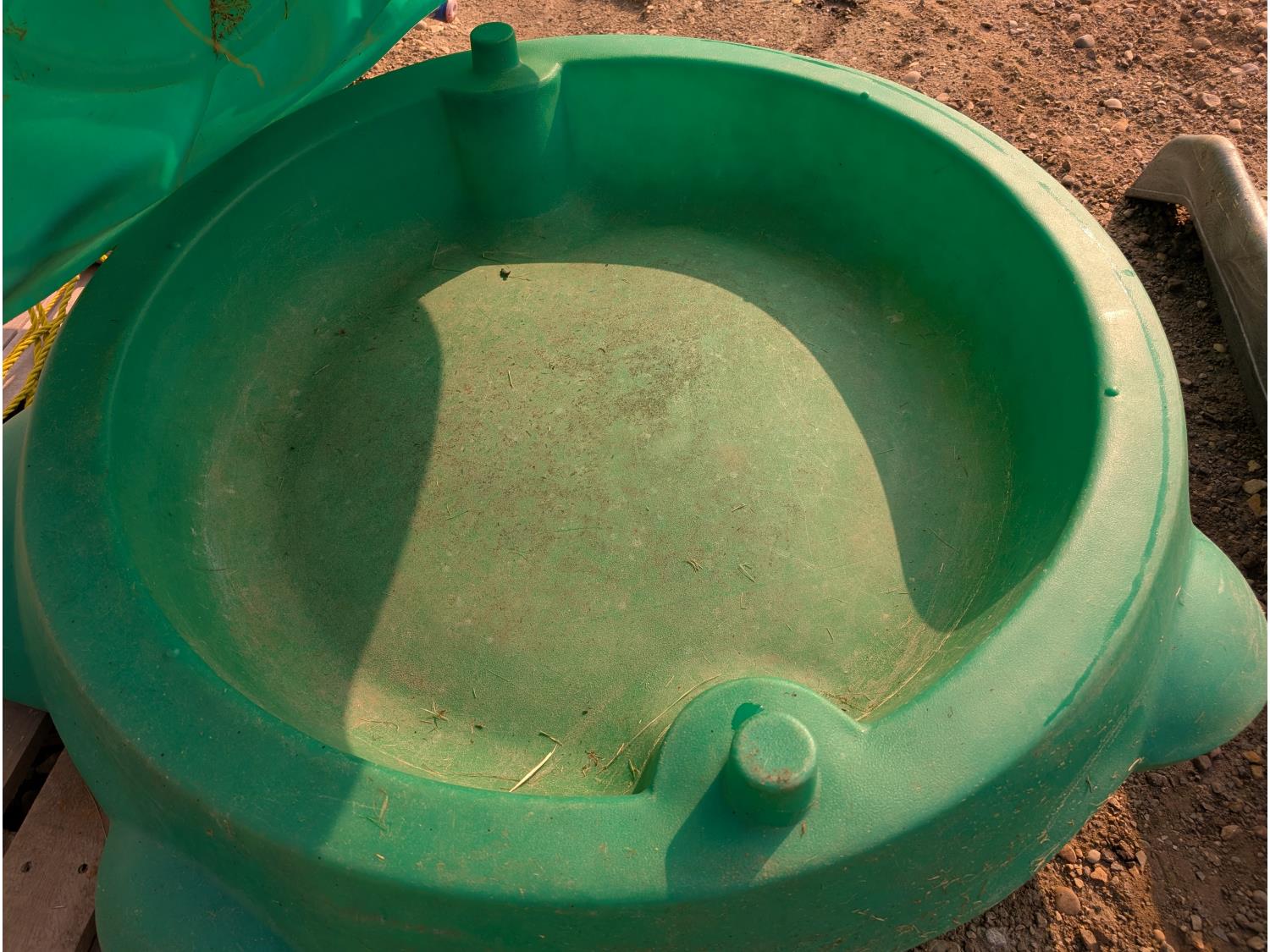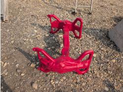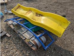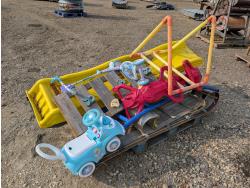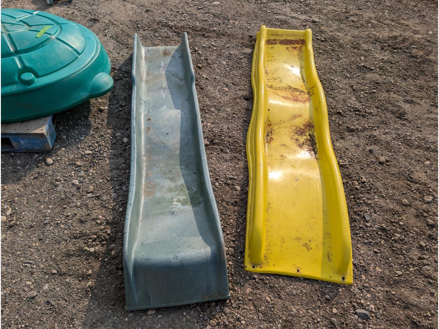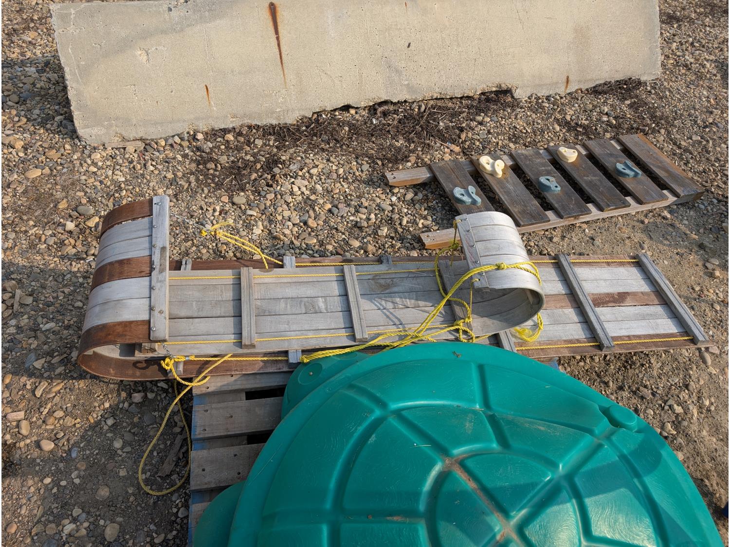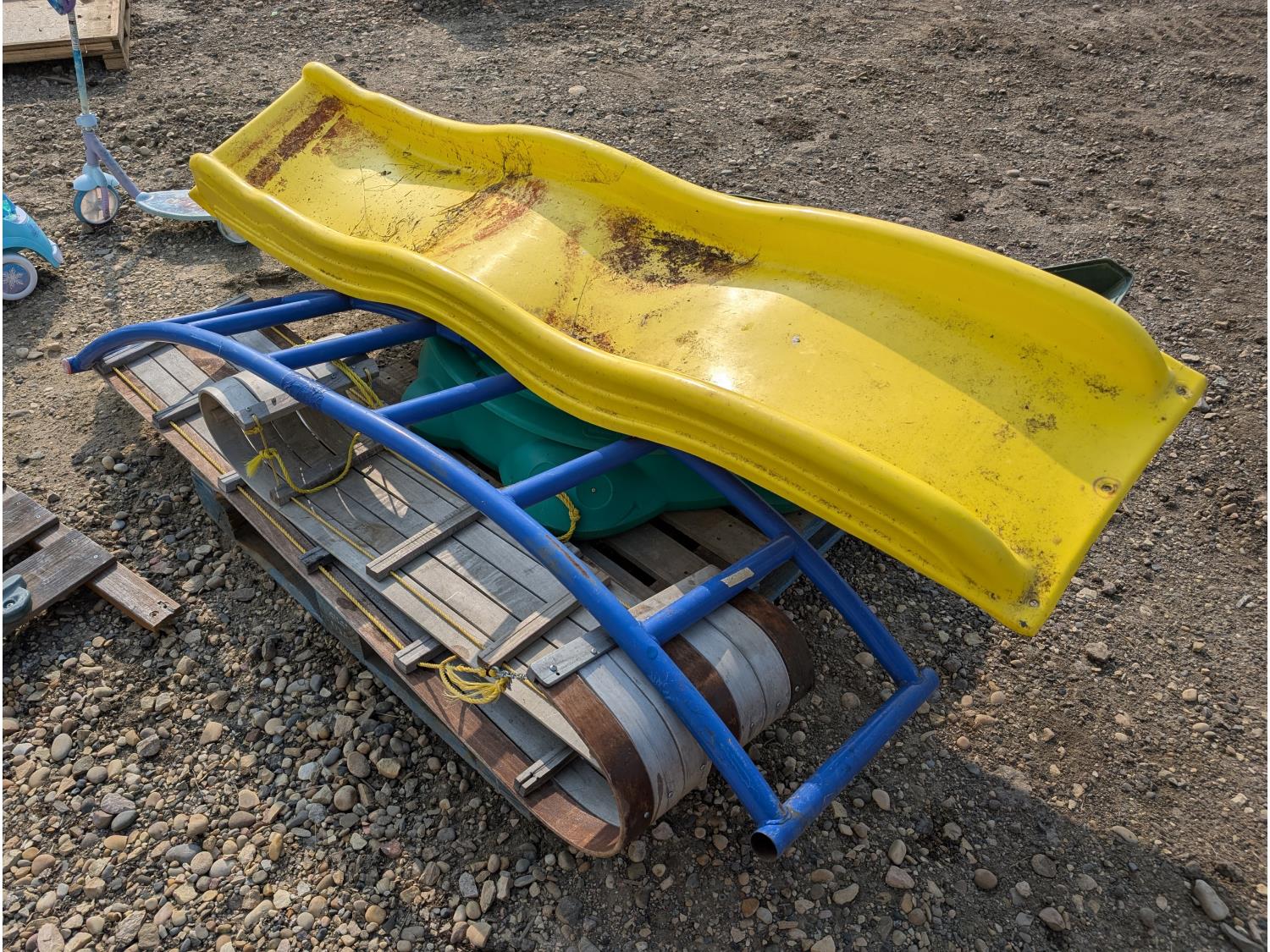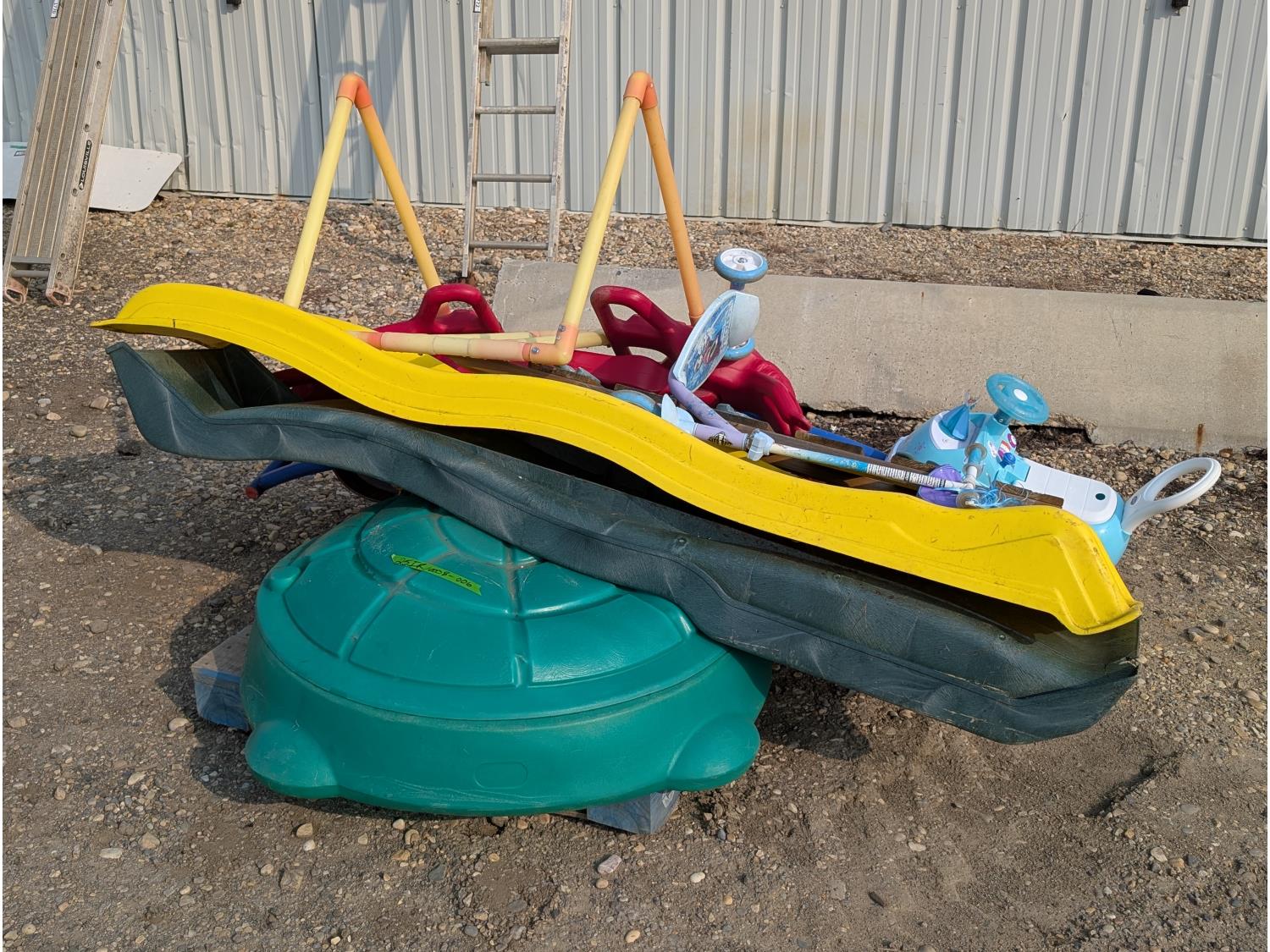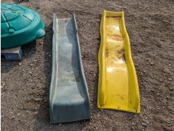 (2) slides, seesaw, climbing wall, turtle sandbox, (2) wooden toboggans