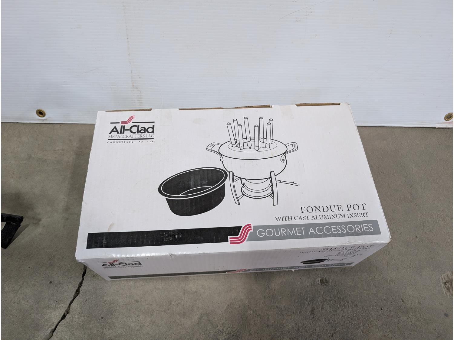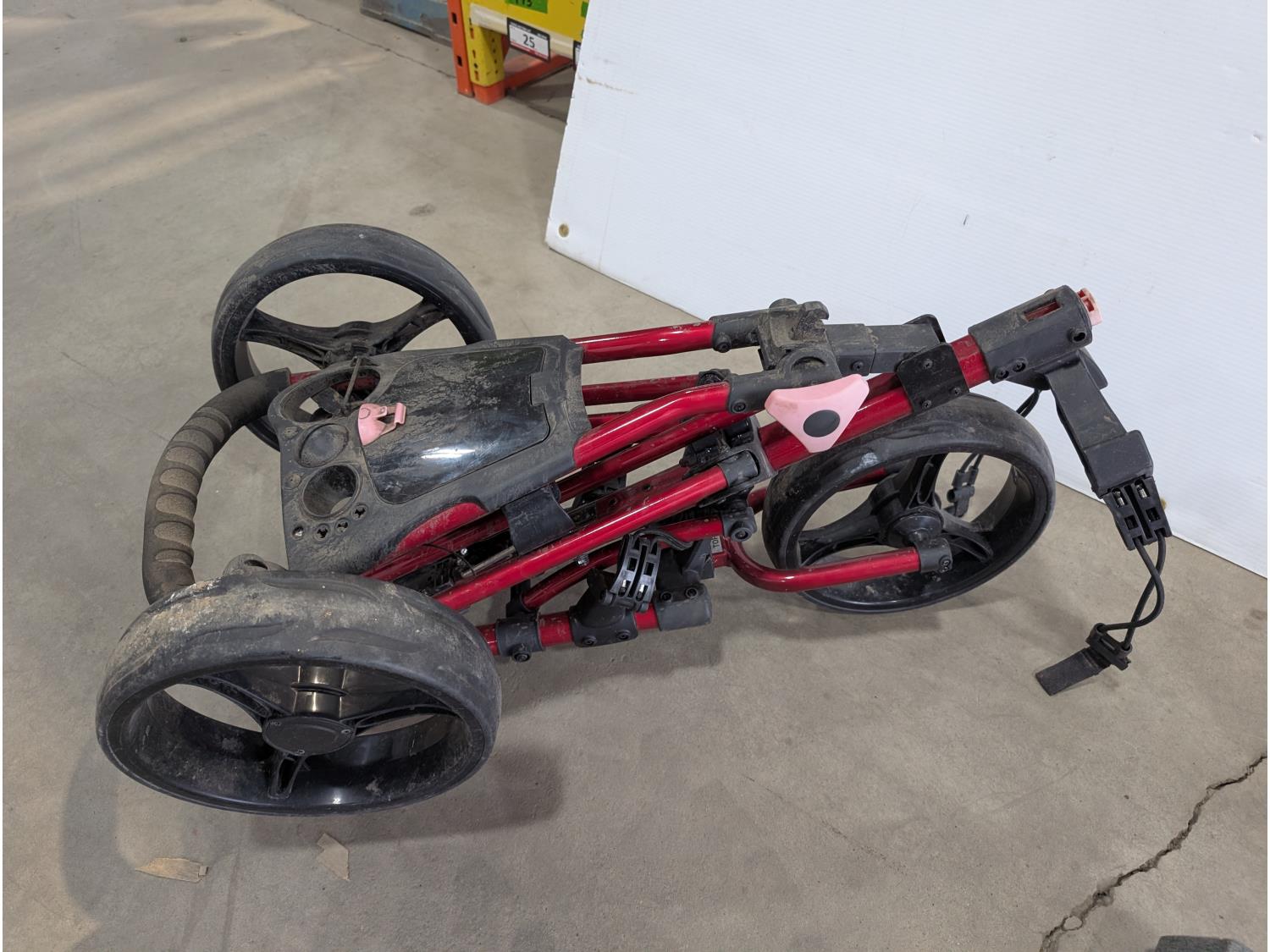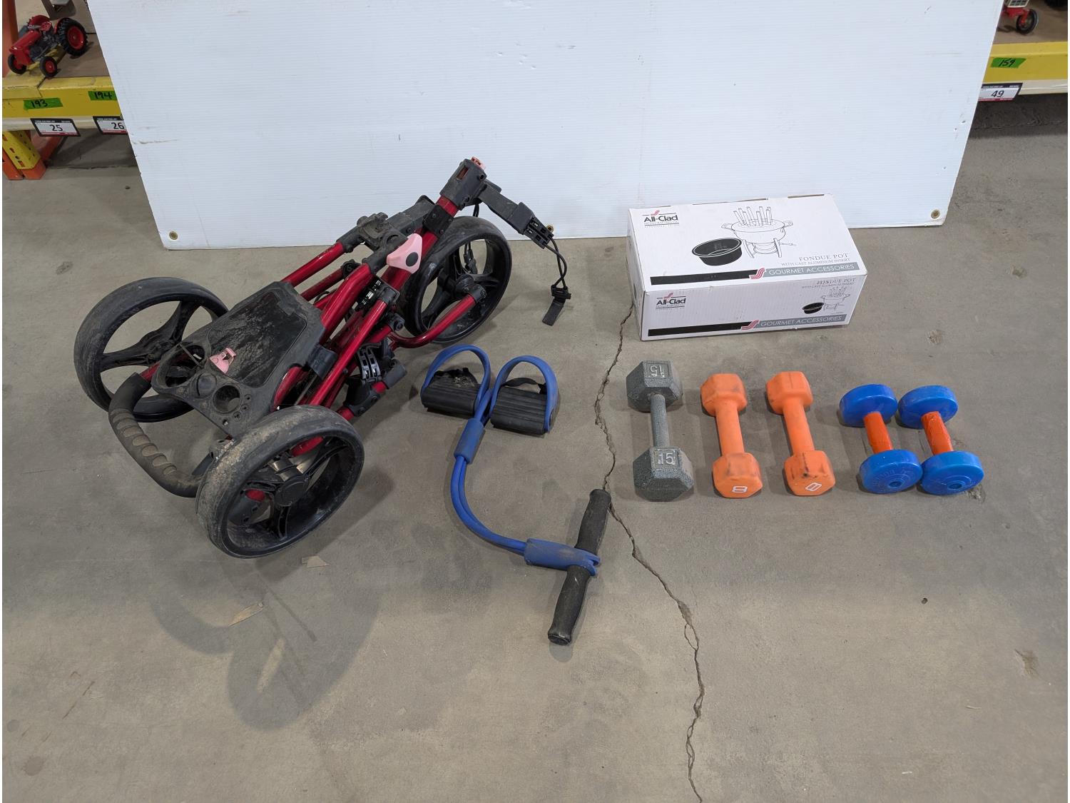 3 wheeled collapsible golf bag cart, fondue set (unused), (5) barbells