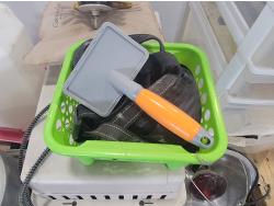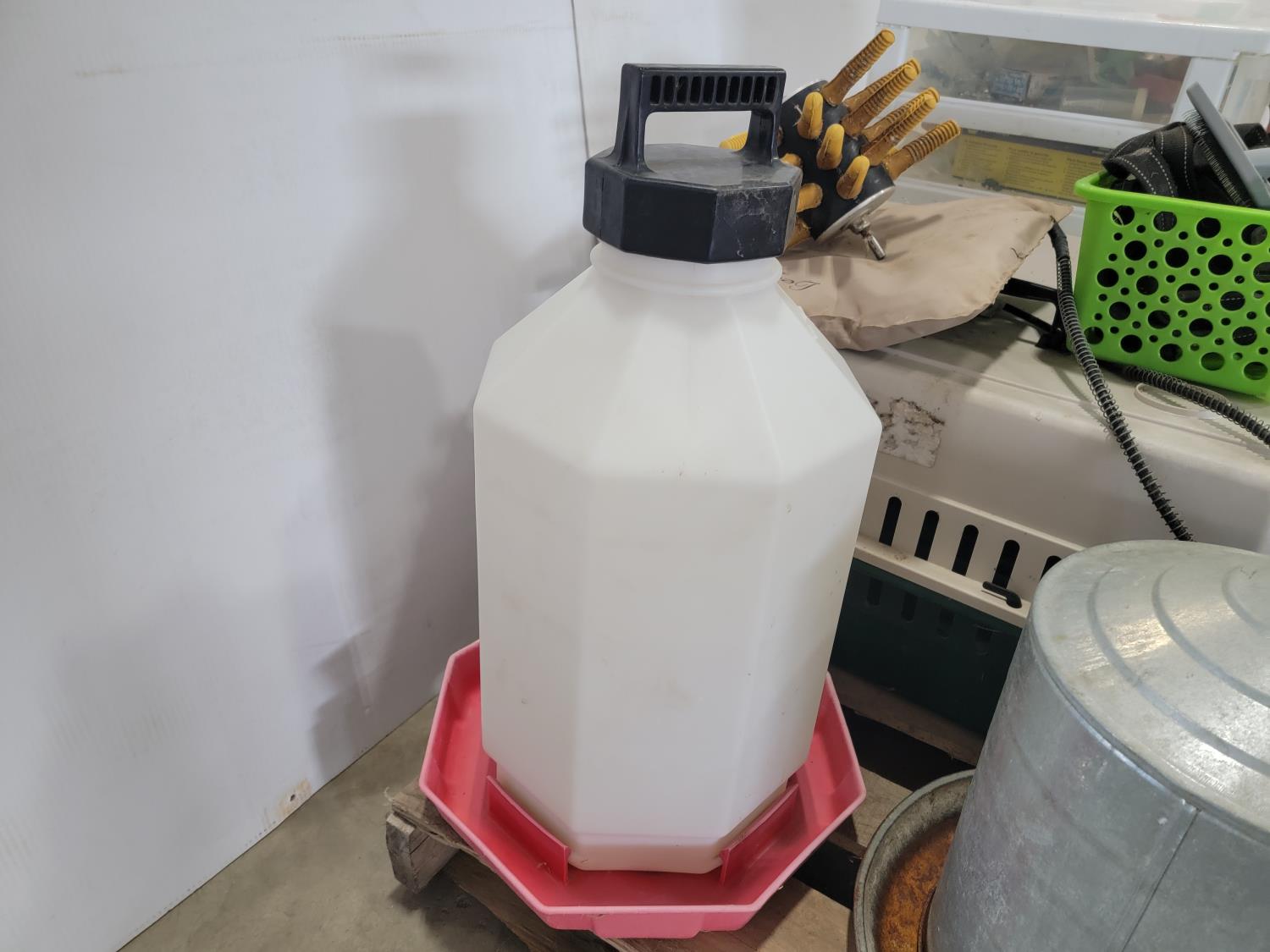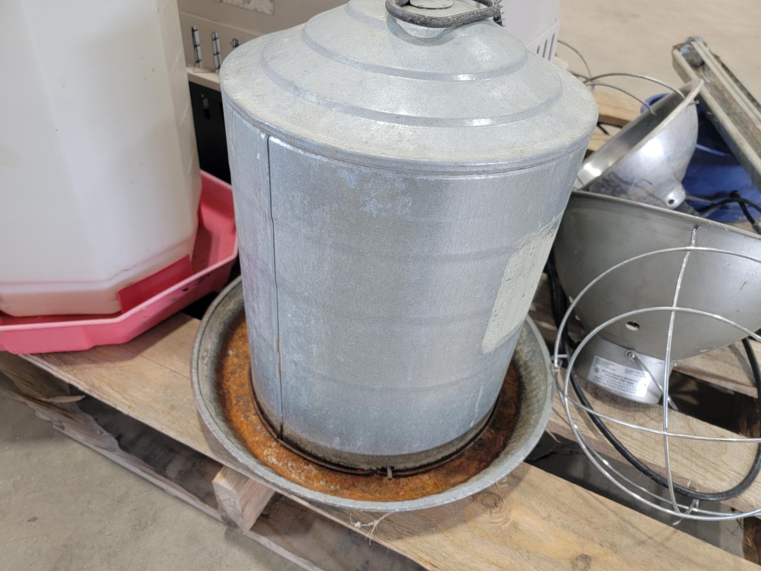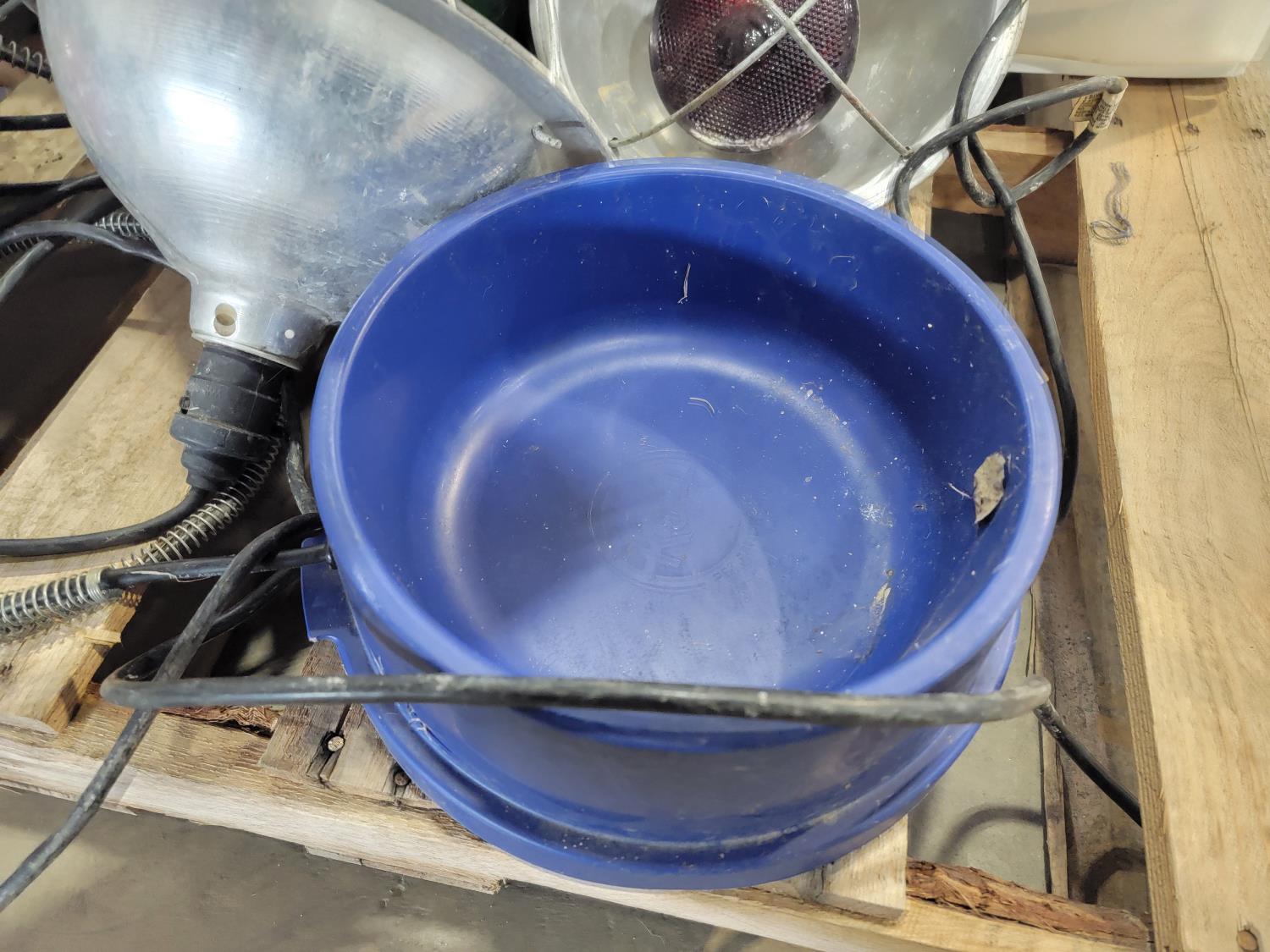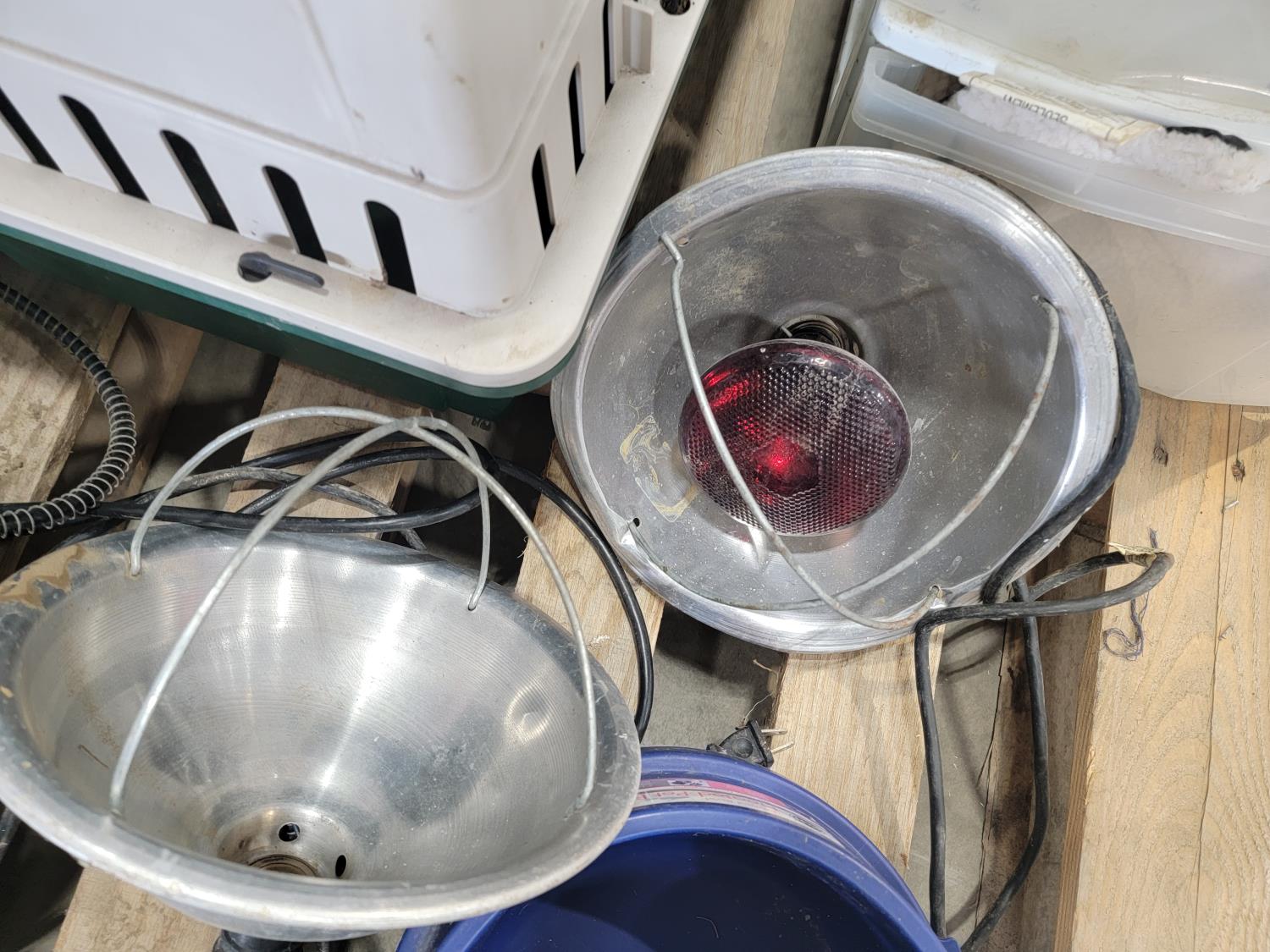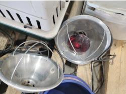 Poly pet crate 16 inch x 24 inch x 15 inch, heated pet bowl, (3) heat lamps, plastic chicken feeder, metal chicken waterer, metal chicken tray feeder