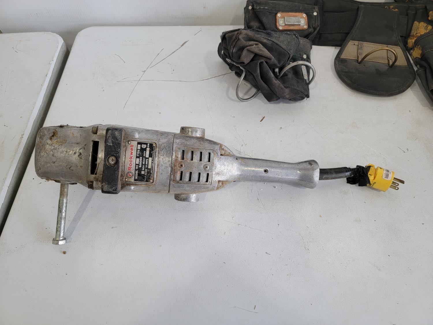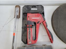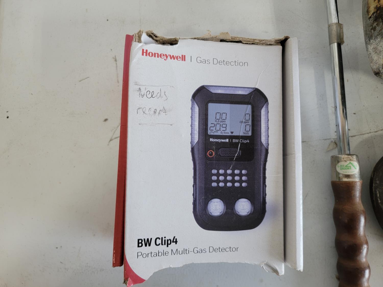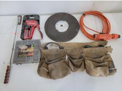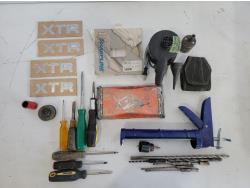 Welding helmet, rope, stapler, pipe wrenches, Honeywell gas detector, Kunys tool bags, screwdrivers, drill bits
