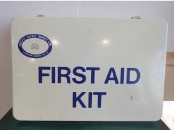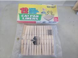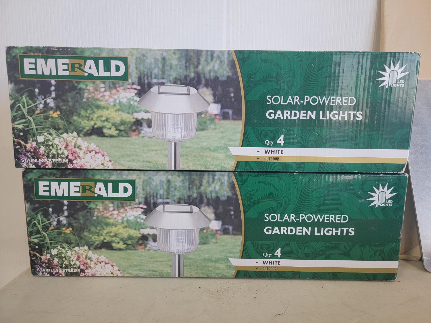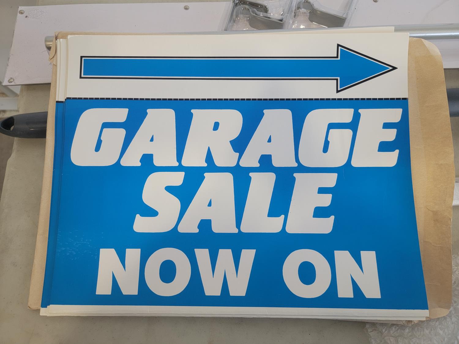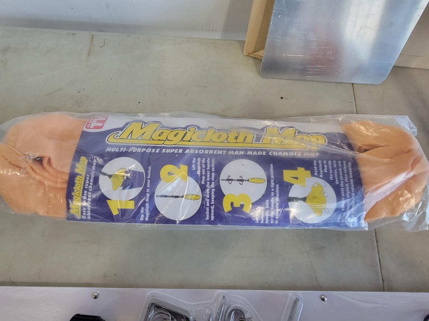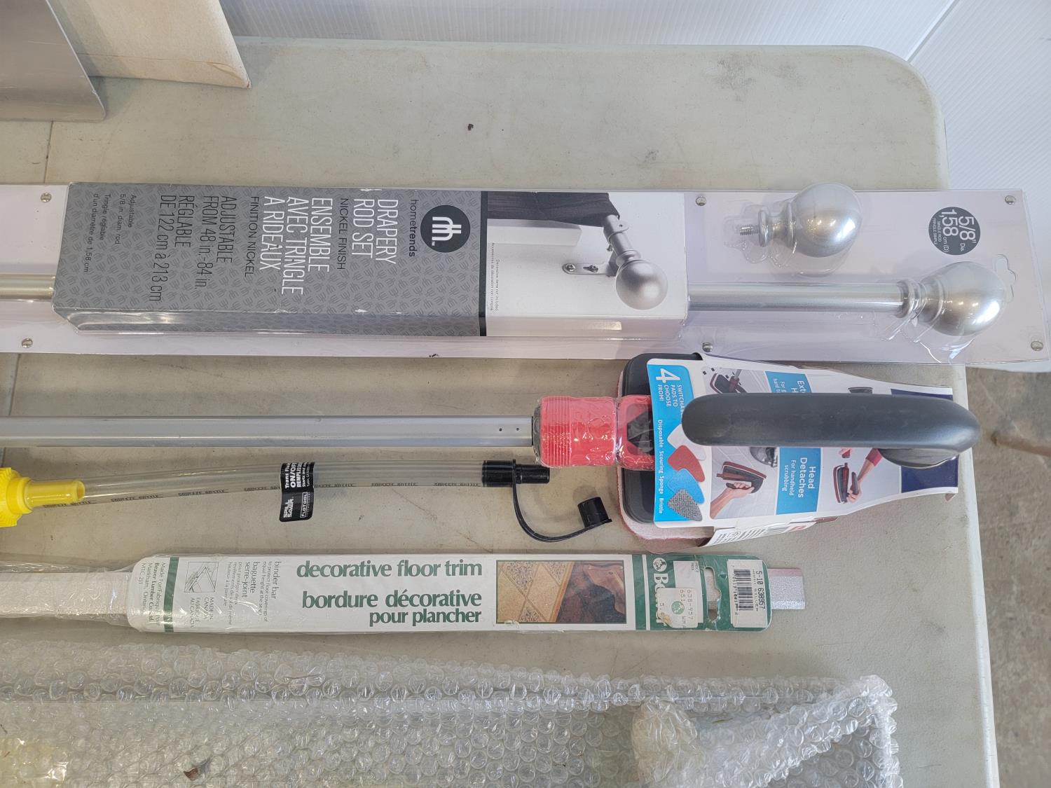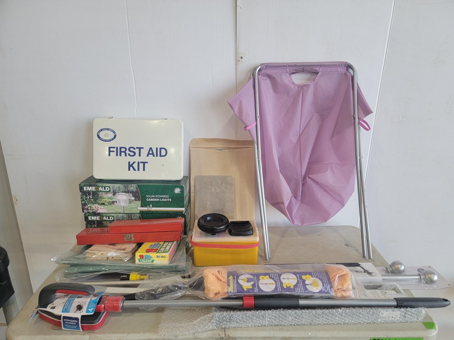First aid kit, solar garden lights, sockets, 9 ft x 12 ft tarp, Magicloth mop, curtain rod set, garage sale sign