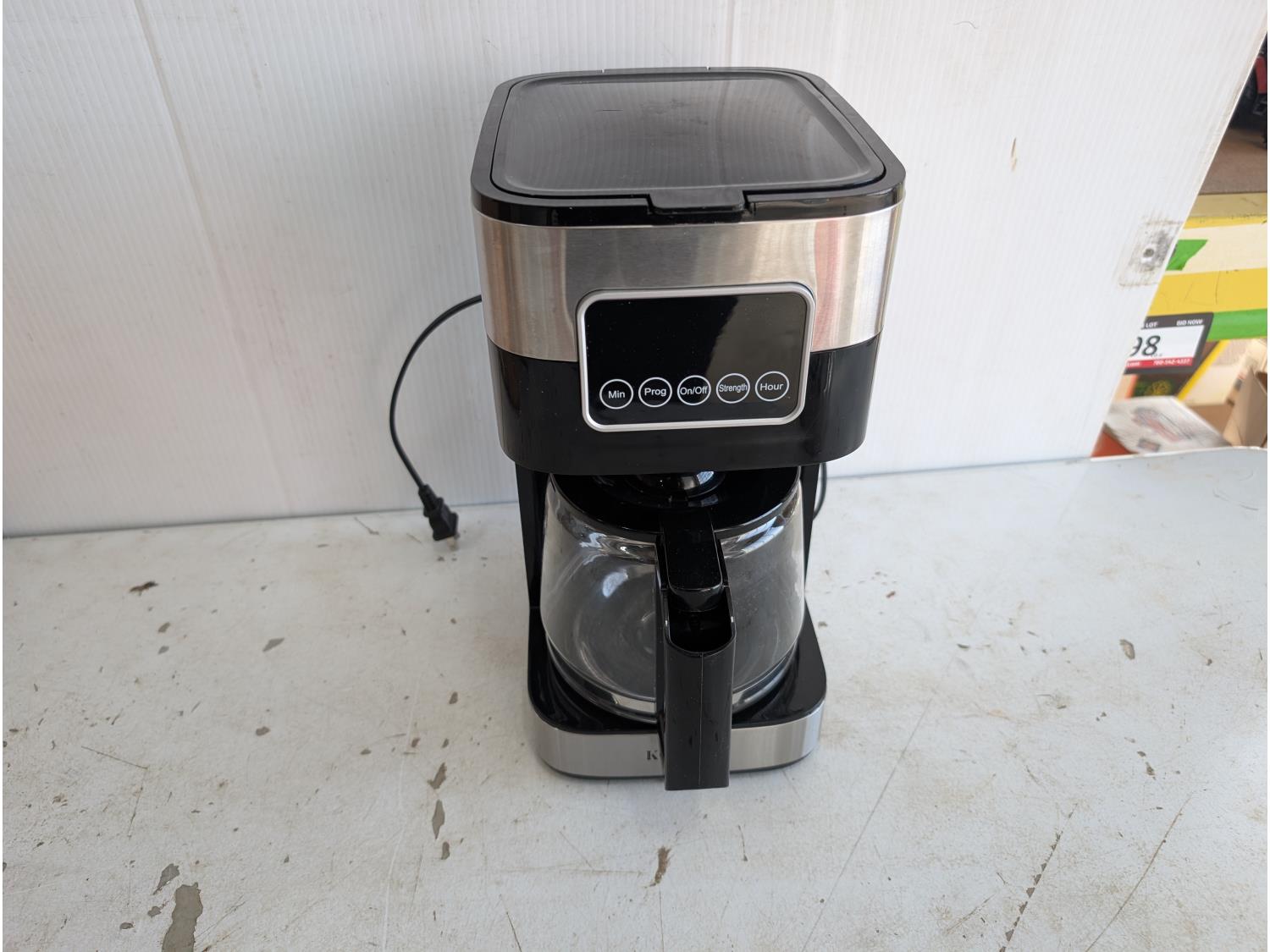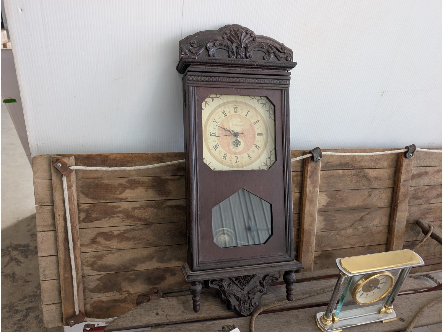 Kidisle 10 cup coffee maker, stainless steel kettle, (2) vintage sleds, antique bottles, assorted clocks, car and truck calendars, John Deere Calendars