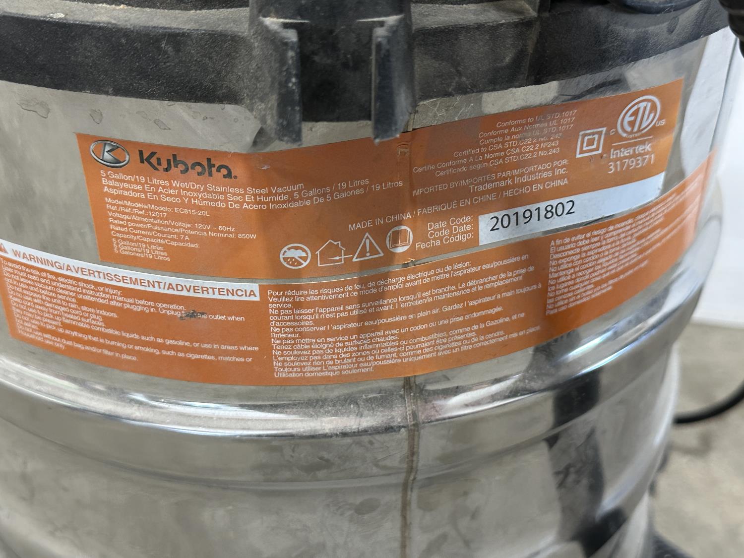 1185 Kubota 5 Gallon Stainless Steel Shop Vacuum