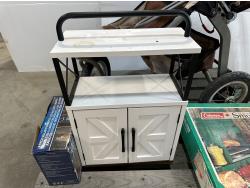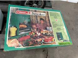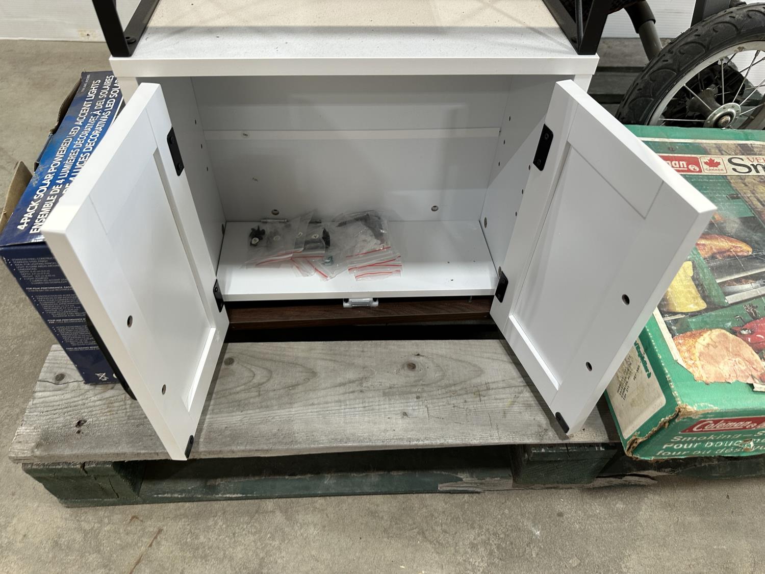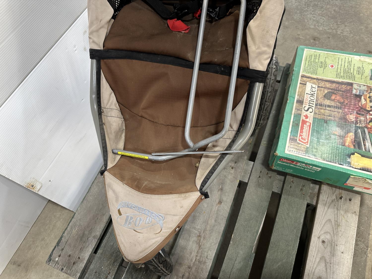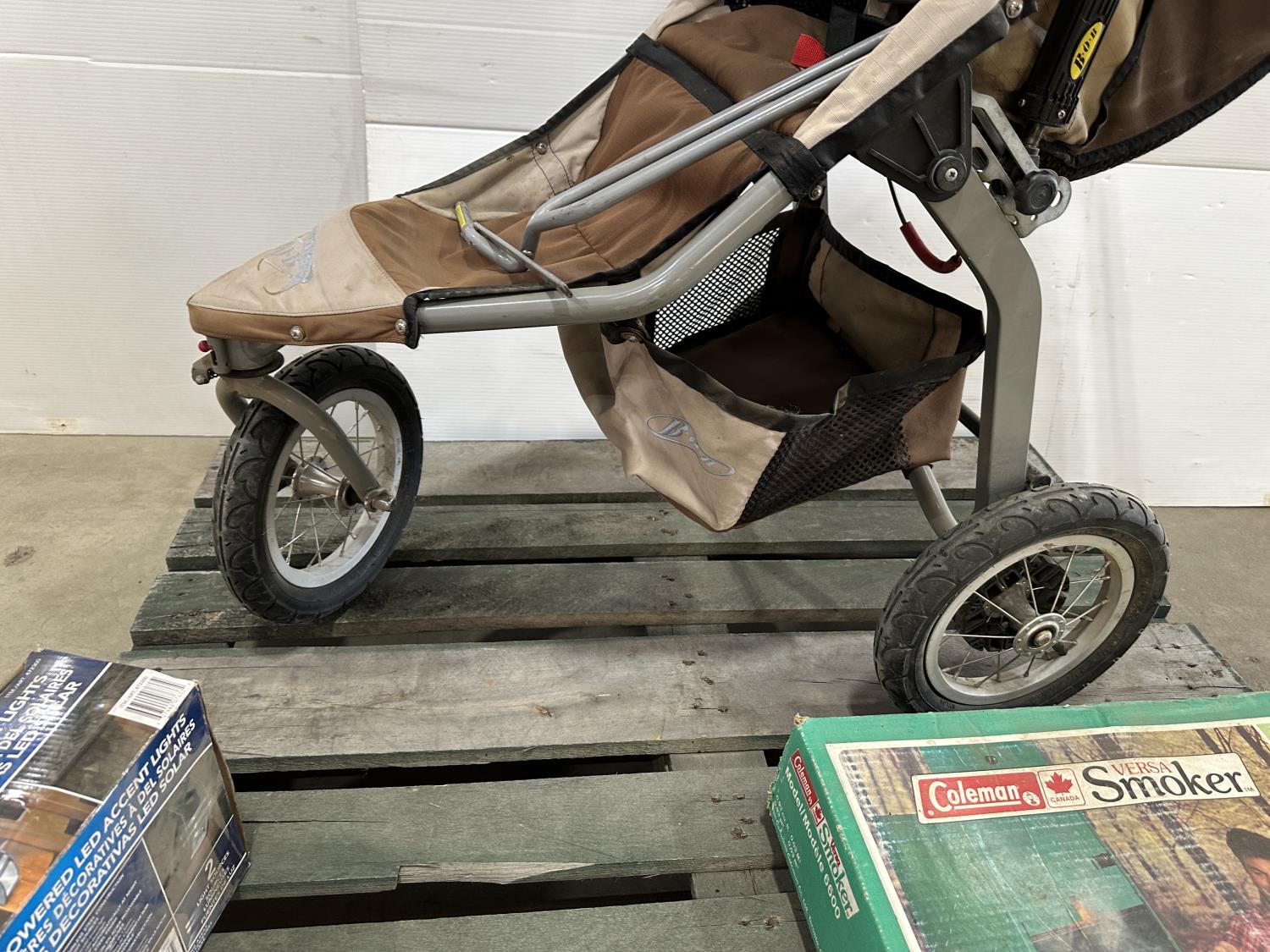 Bob Revolution stroller, Coleman Versa smoker, solar LED accent lights, cabinet