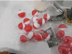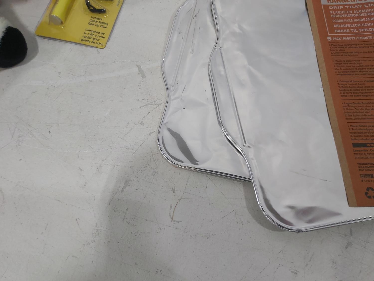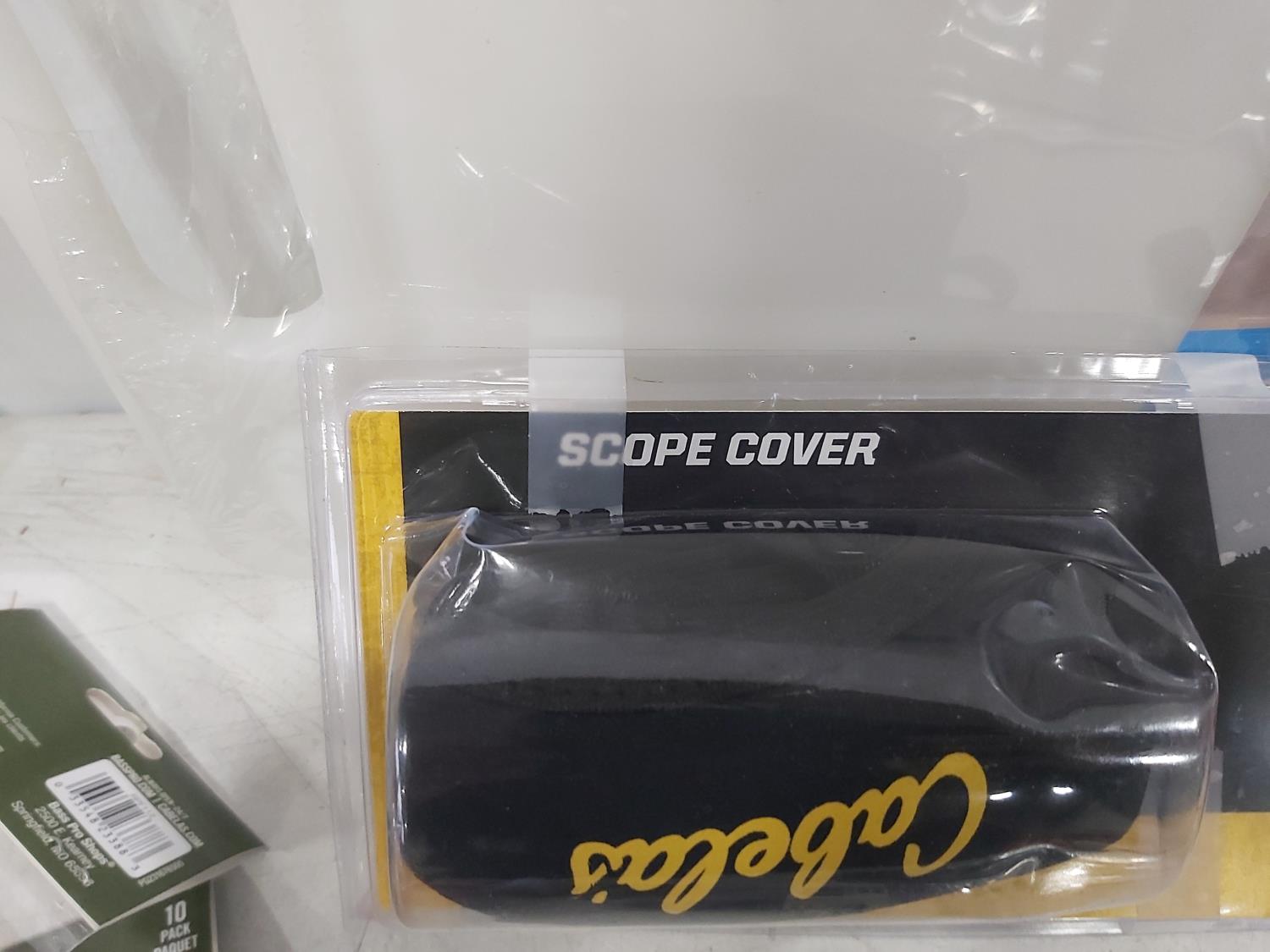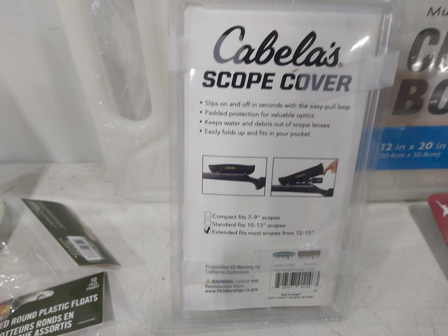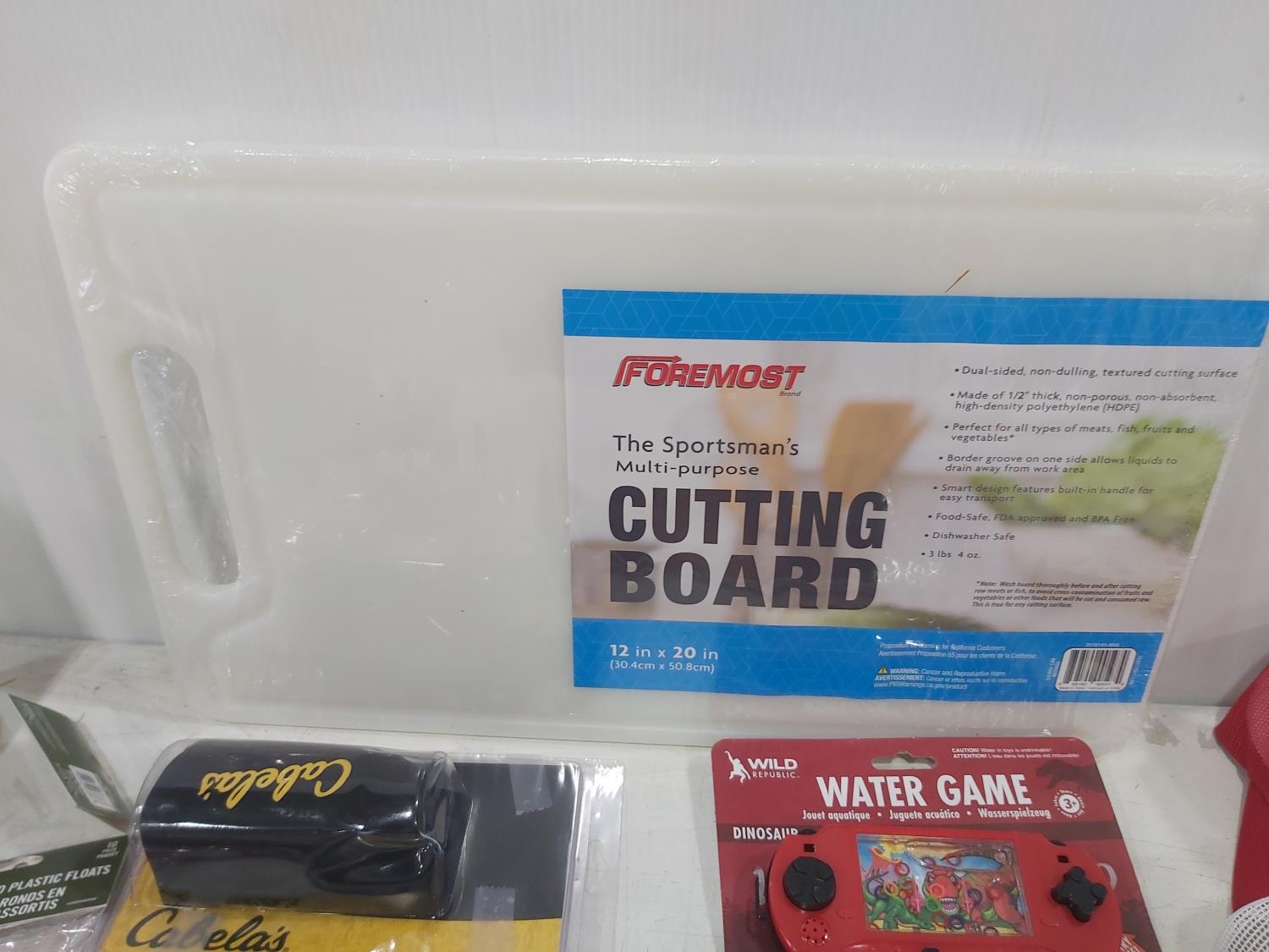 (2) hats, cutting board, water game, Traeger drip tray liners, fishing accessories, 32 oz water bottle, scope cover