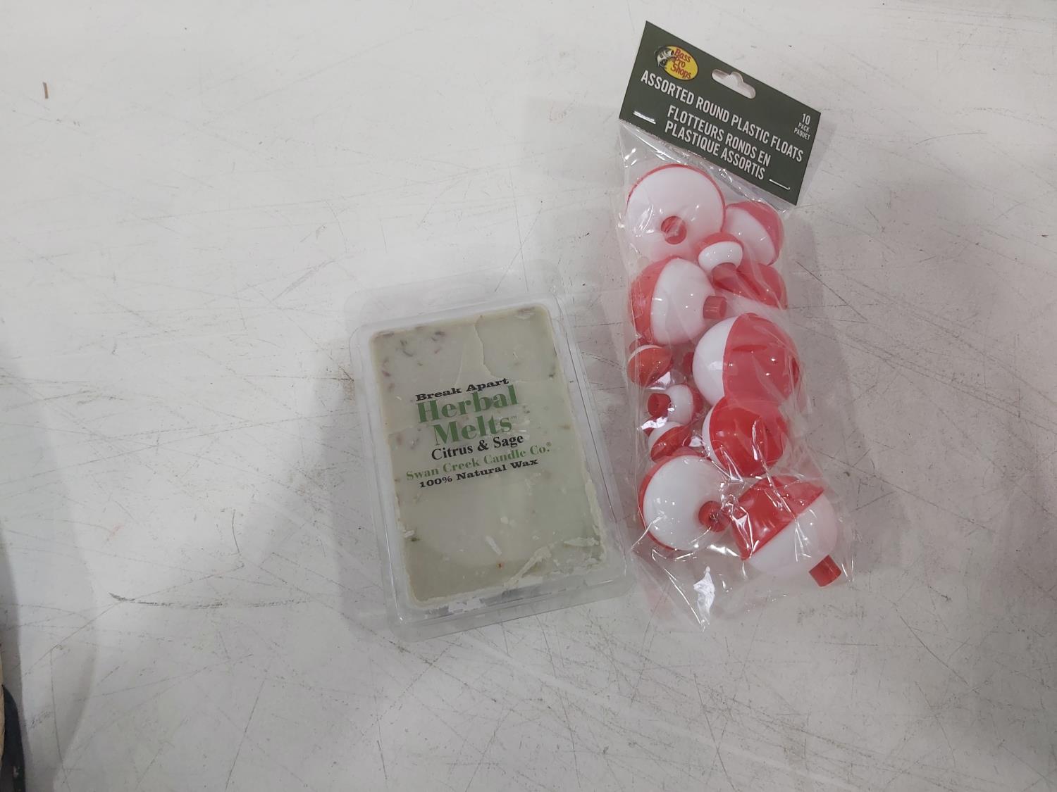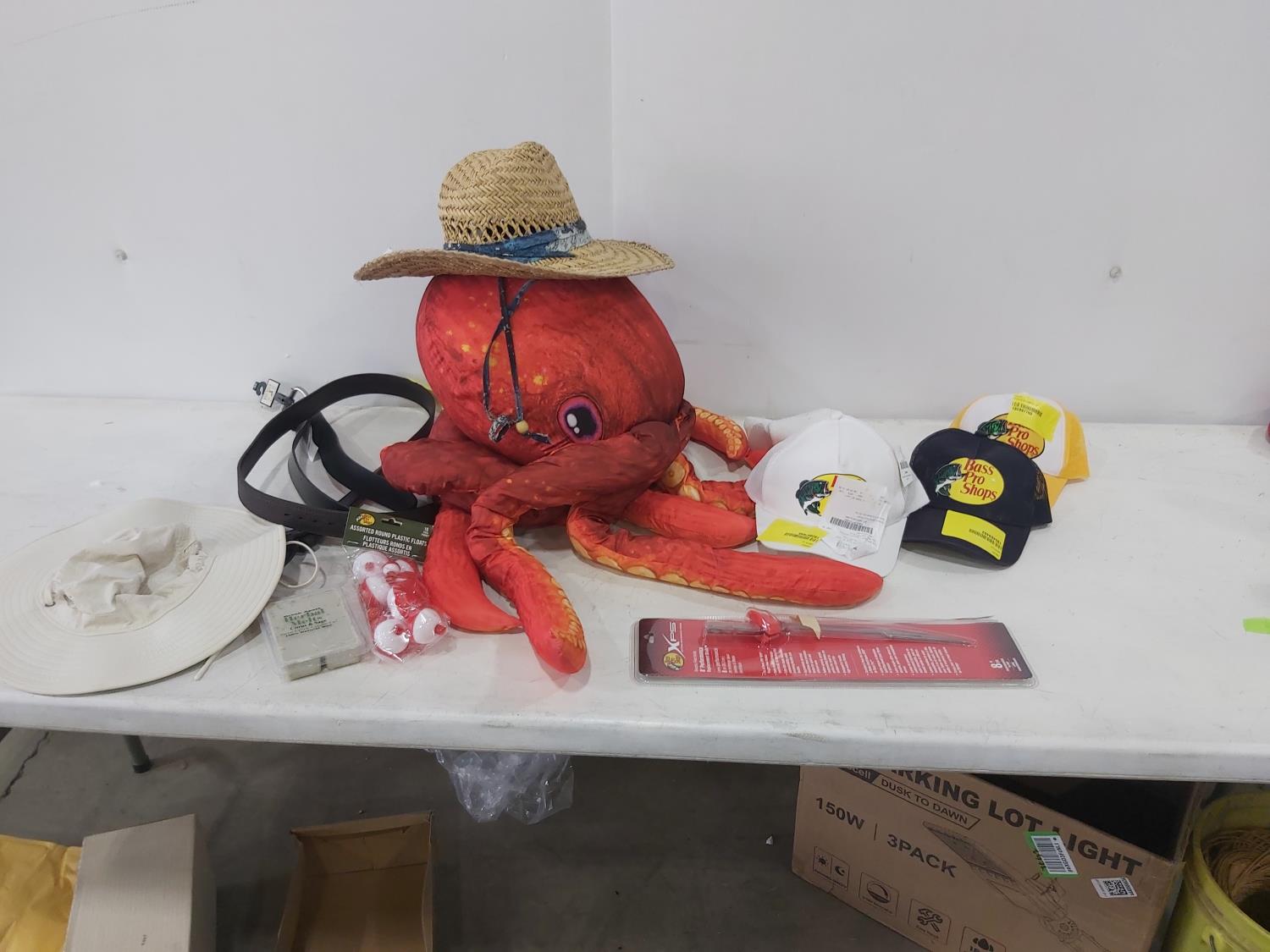 Octopus toy, (6) hats, electric knife replacement blade, (2) belts, fishing bobbers