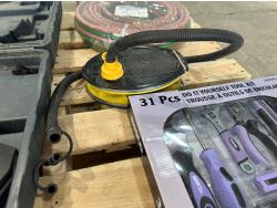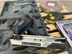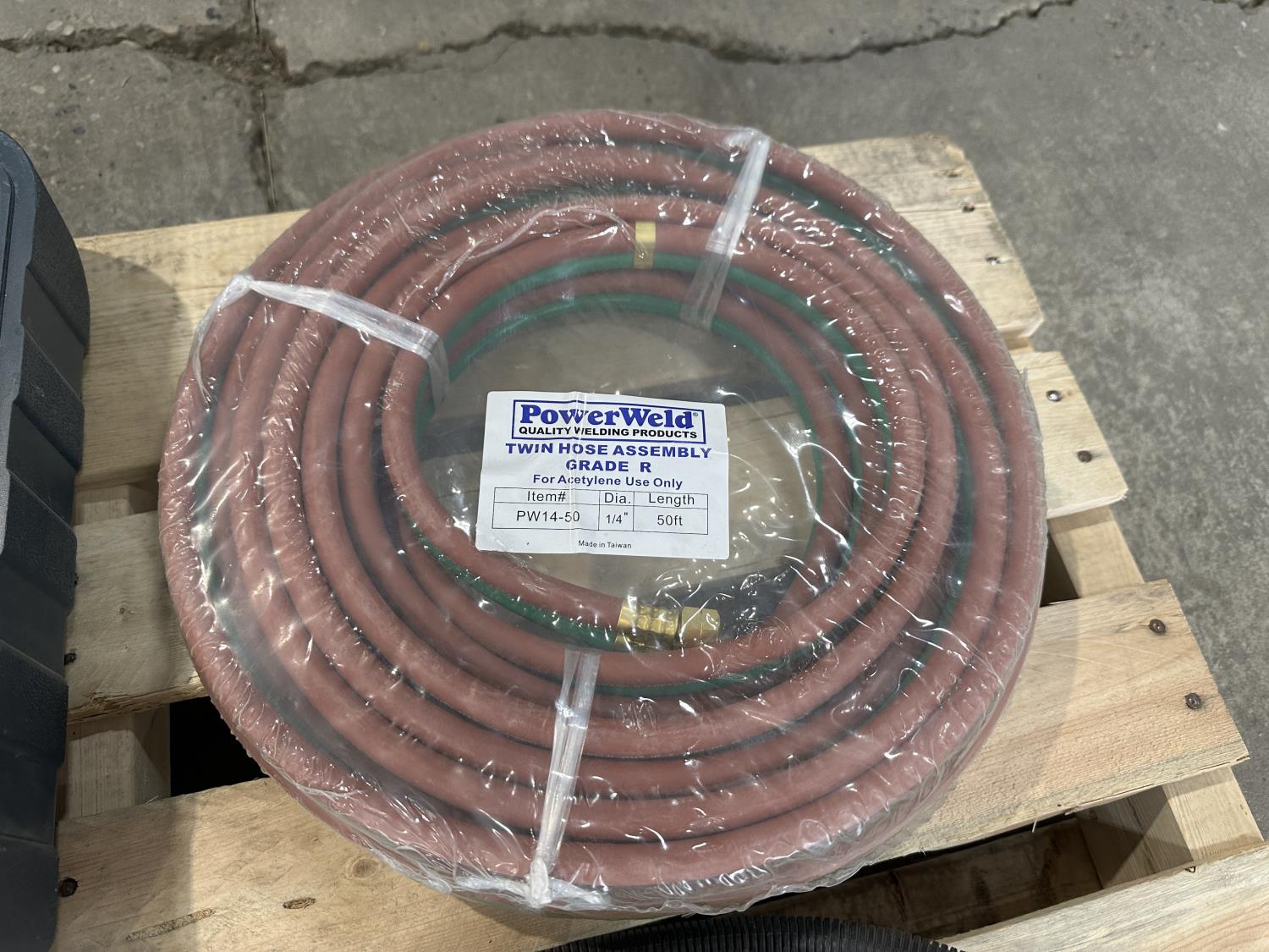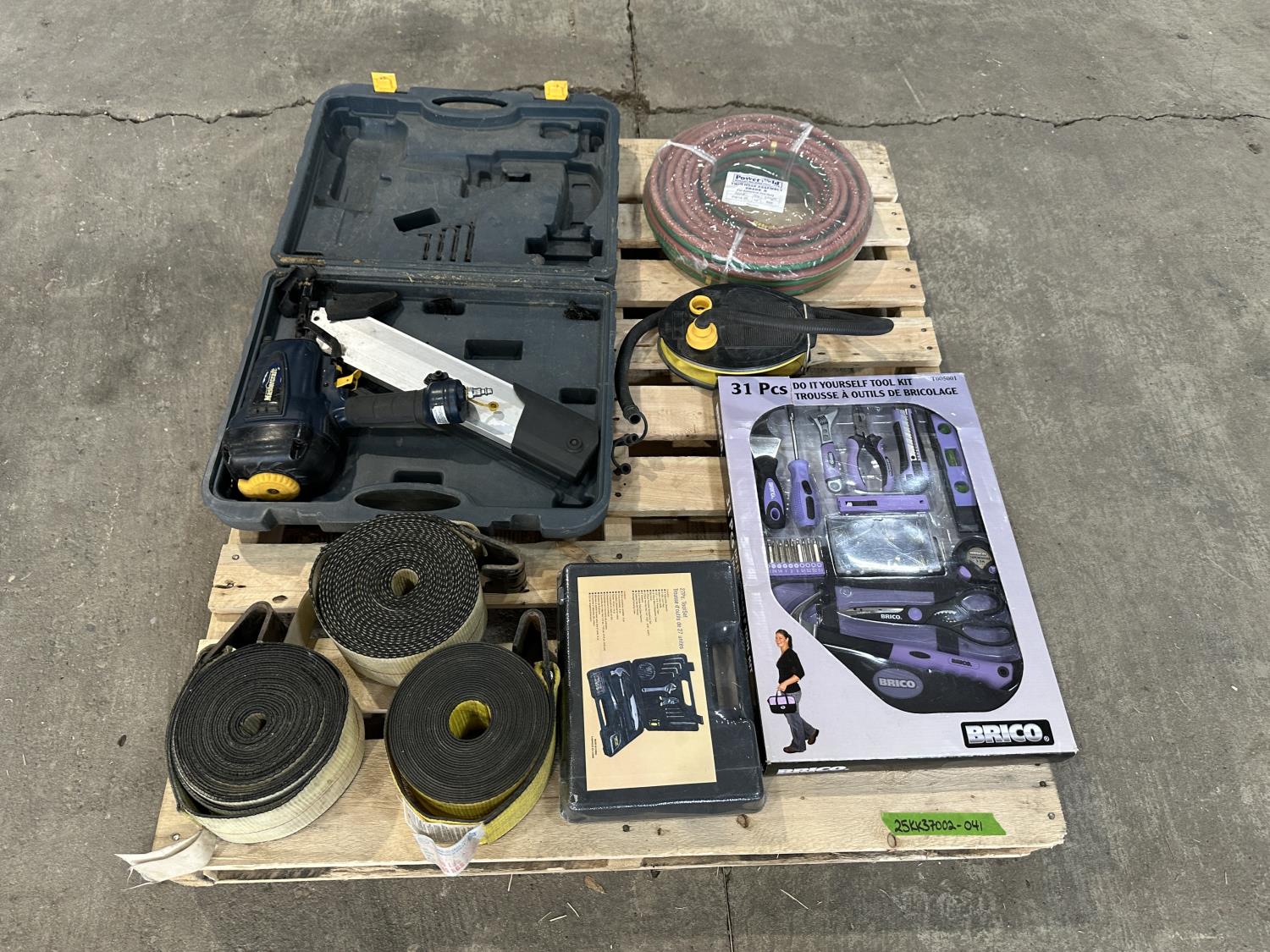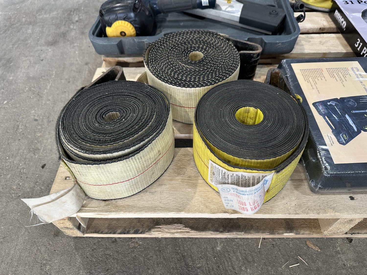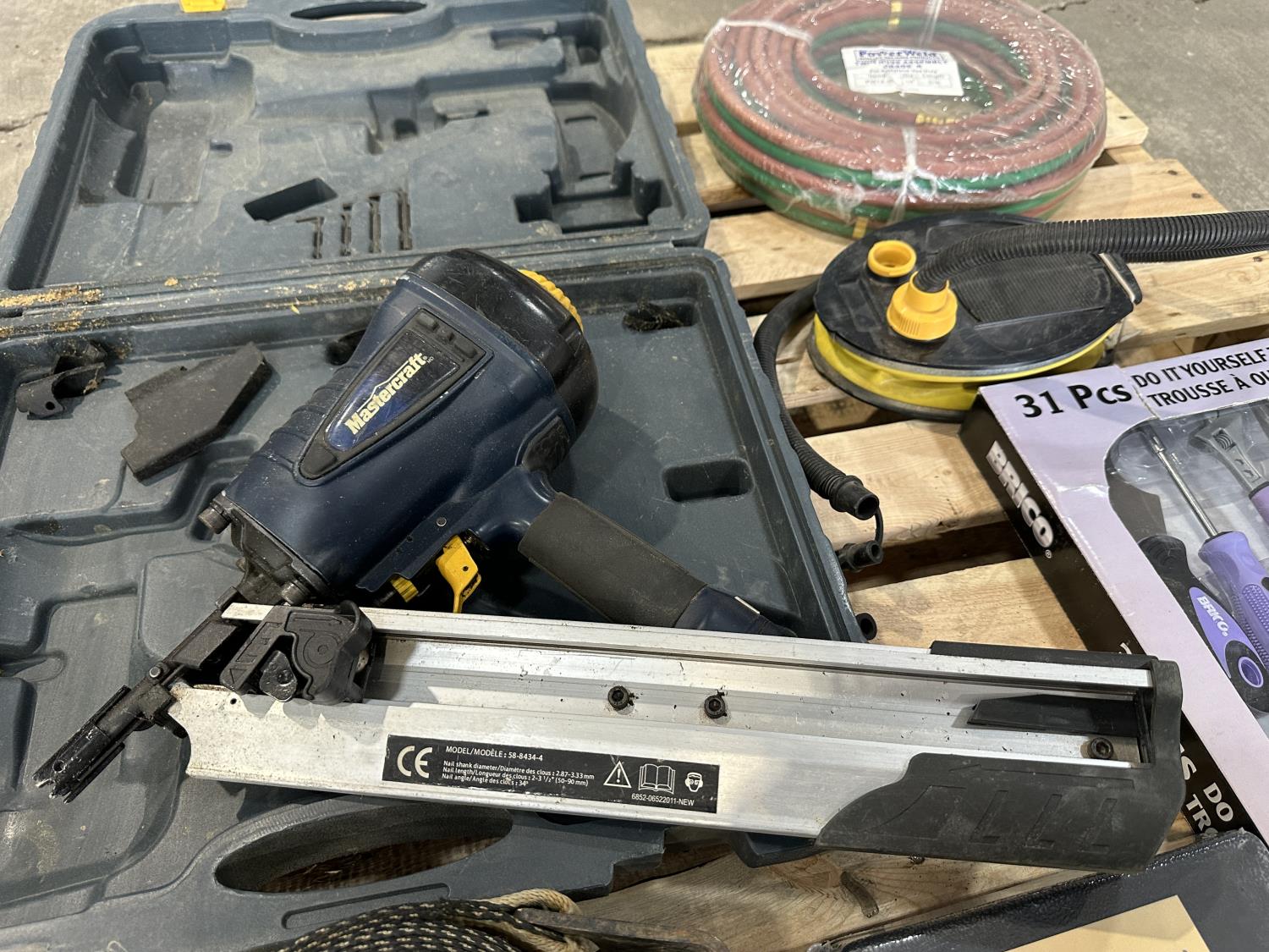 (3) 4 inch winch straps, 27 piece tool set (unused), 31 piece tool kit (unused), Powerweld 1/4 inch x 50 ft twin acetylene hose, Mastercraft nailer,
