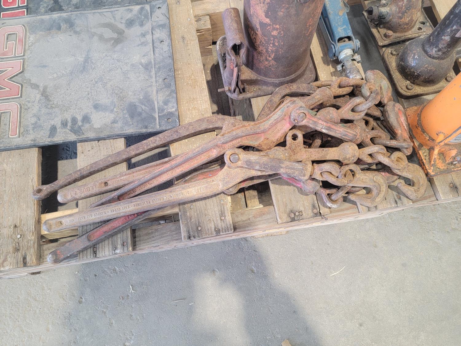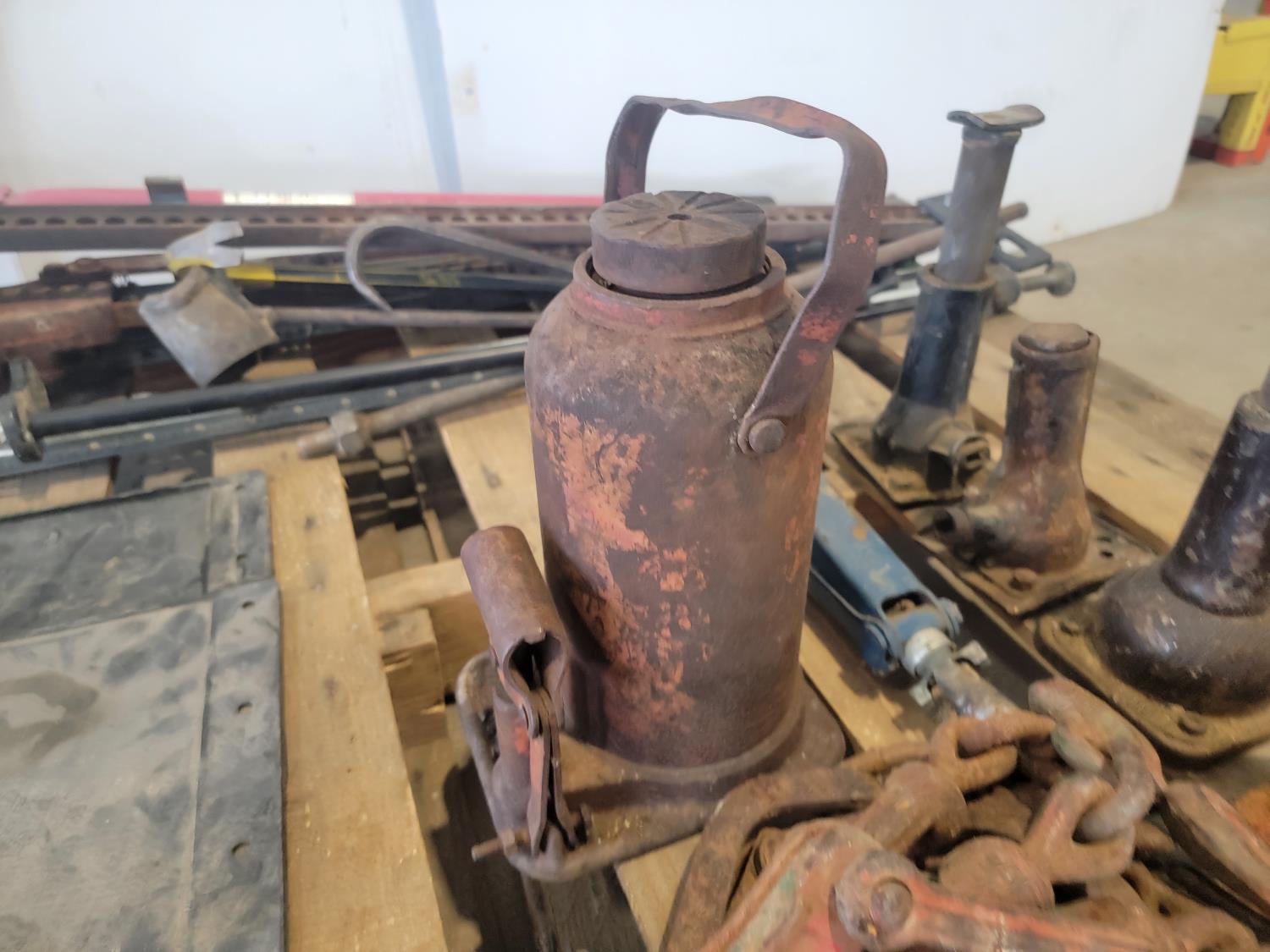(2) farm jacks, clamps, bottle jacks, GMC mud flaps, chain boomers, scissor jack